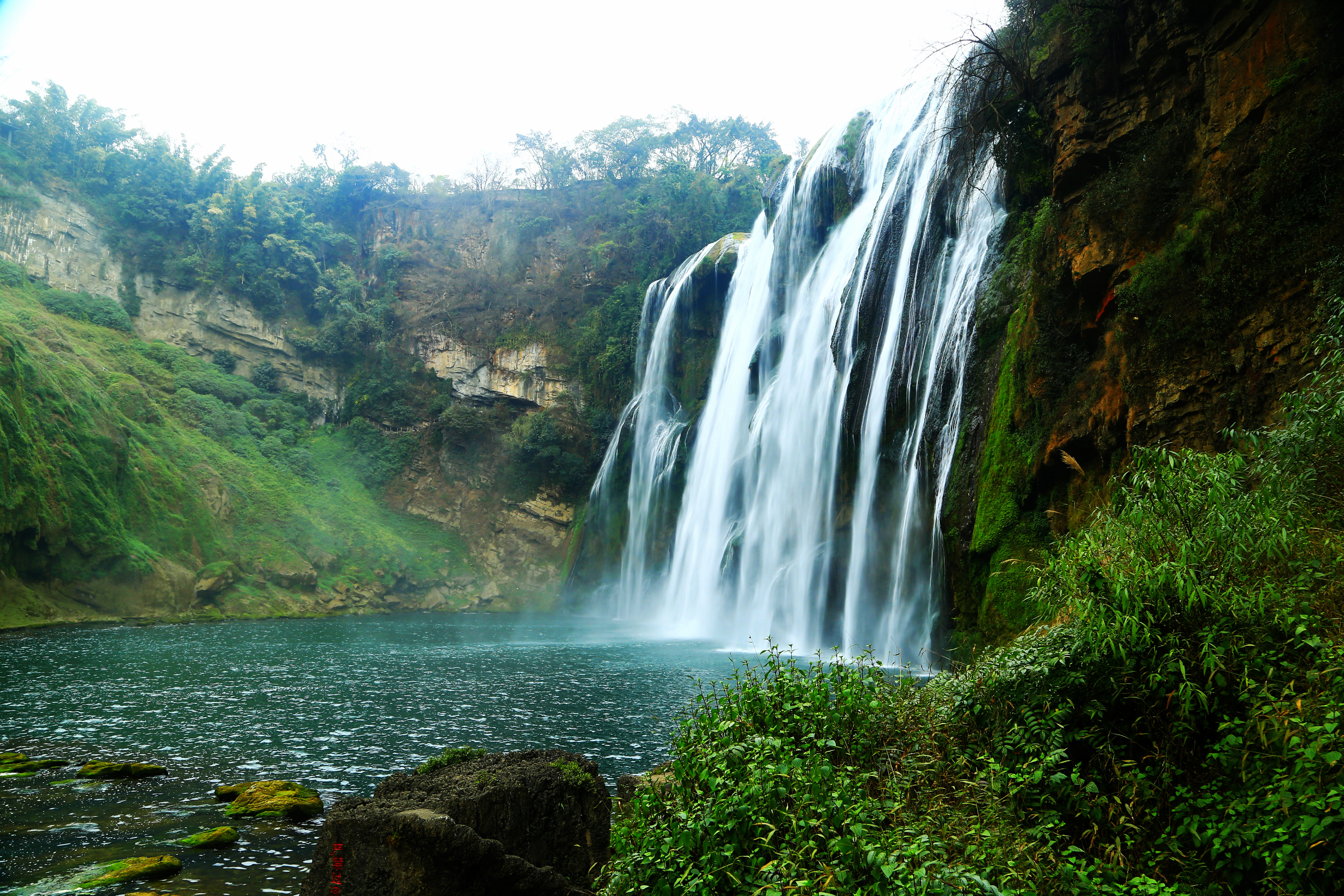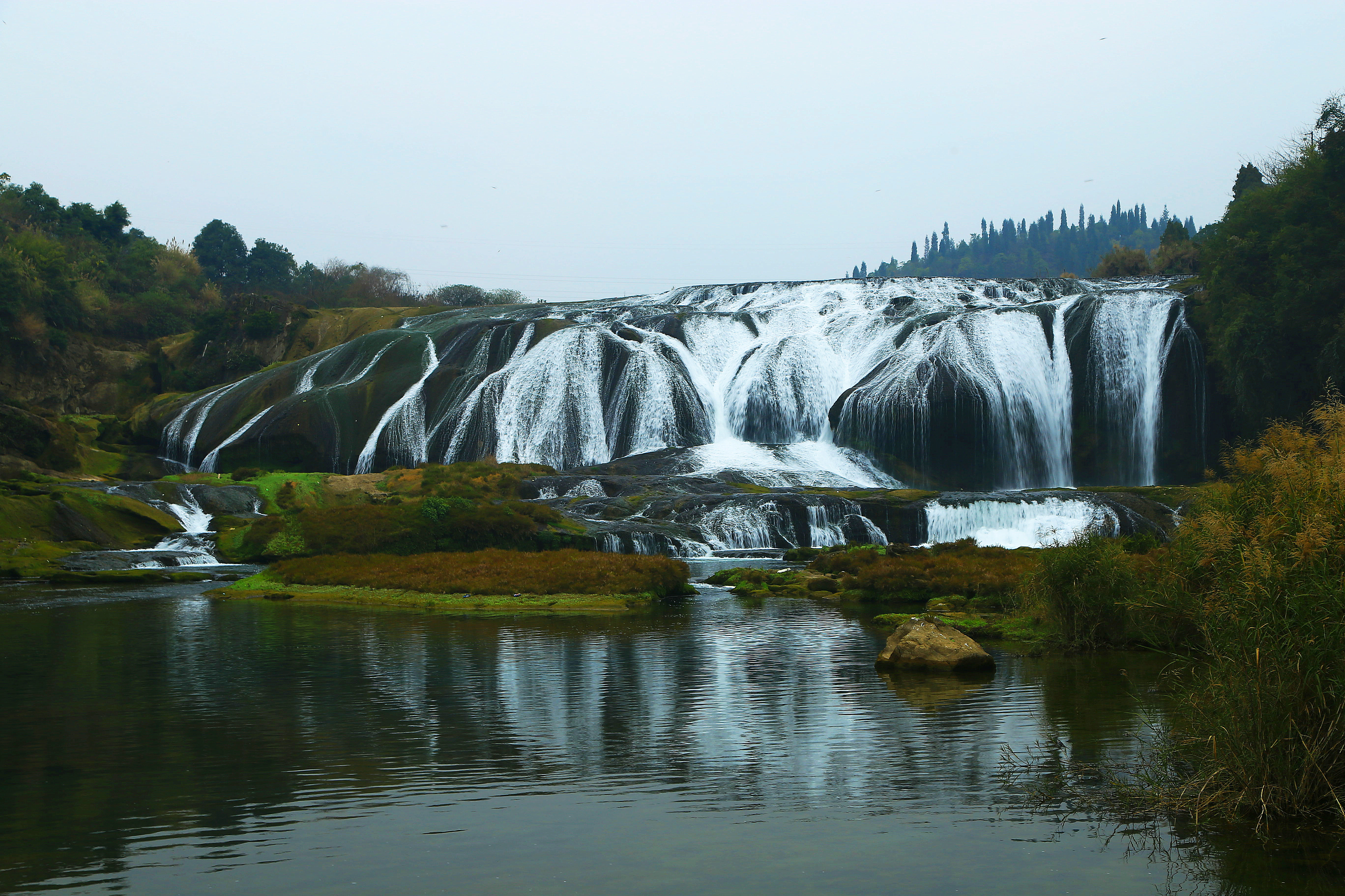 第一站是陡坡塘瀑布,位于黄果树瀑布上游1公里处,瀑顶宽105米,高21米,是黄果树瀑布群中瀑顶最宽的瀑布。陡坡塘瀑布顶上是一个面积达1.5万平方的巨大溶潭,瀑布则是形成在逶迤100多米长的钙化滩坝上。陡坡塘瀑布还有一个特殊的现象,每当洪水到来之前,瀑布都要发出“轰隆。轰隆”的吼声,因此又叫“吼瀑”。前往瀑布途中风景秀丽,将雨未雨之时,空气异常清新。沿途河滩浅露,草枯苔明,因为水量较小,处处可见矮水低瀑。