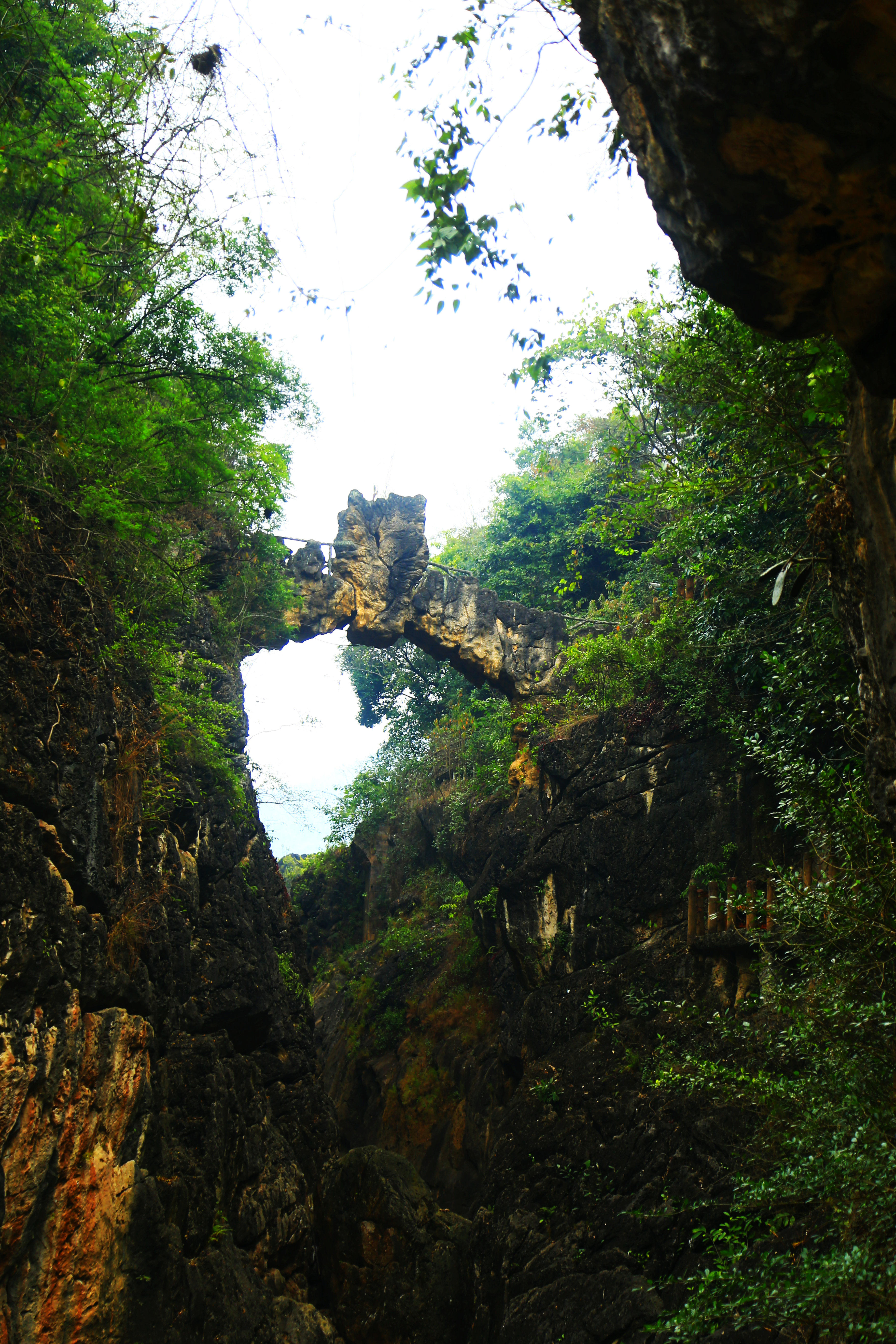 是另一种形式的天生桥,走在桥上,没有丝毫感觉,站在桥下遥遥望去,方觉心惊胆颤。行过天生桥,是天星洞,洞不甚广大,遍布钟乳石,形形色色的石头在灯光映射下,形成各种造型。因为灯光的放射作用,洞内有些闷热,风光丝毫不输山石之间。只是有些路段坡陡苔滑,需要留心脚下。