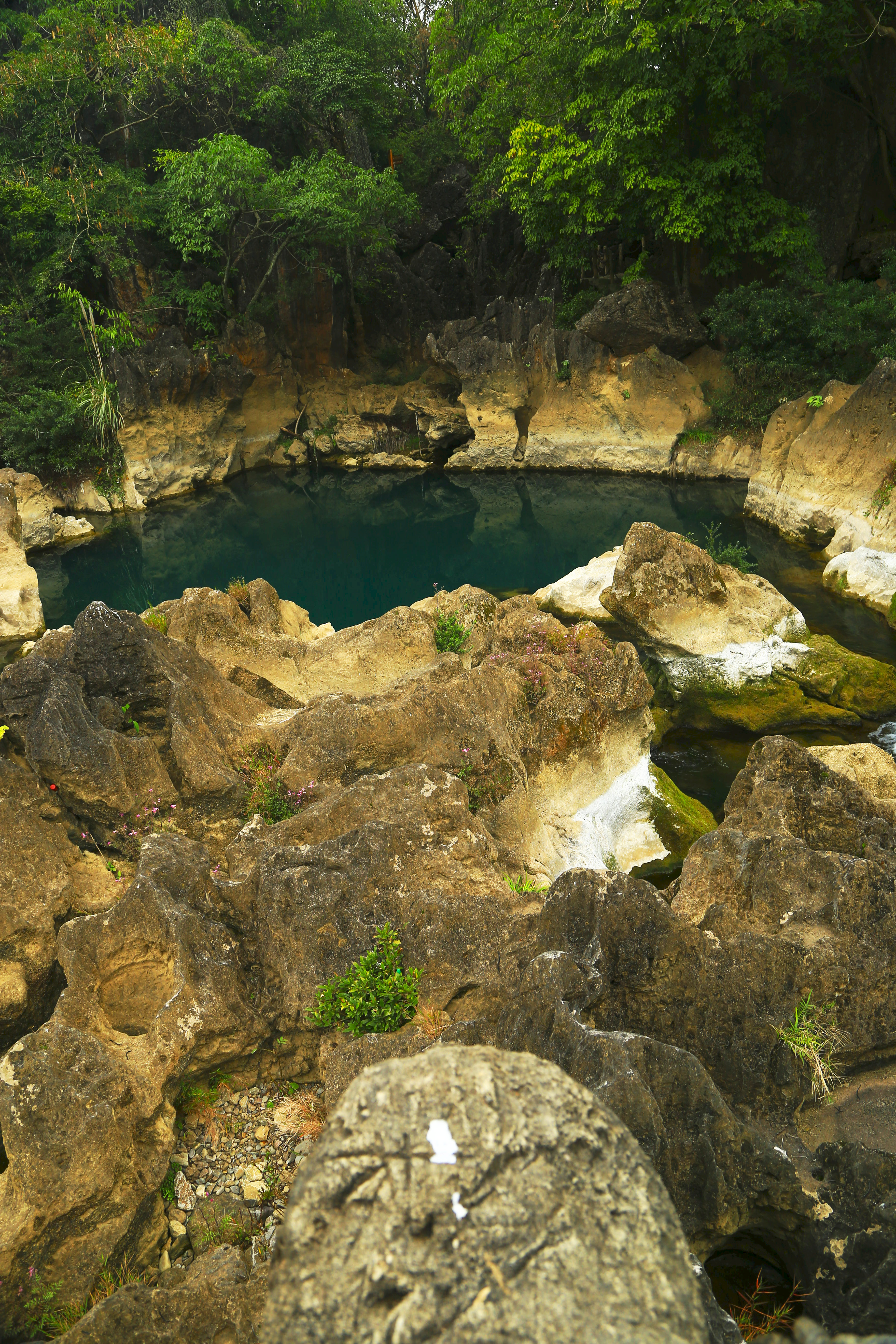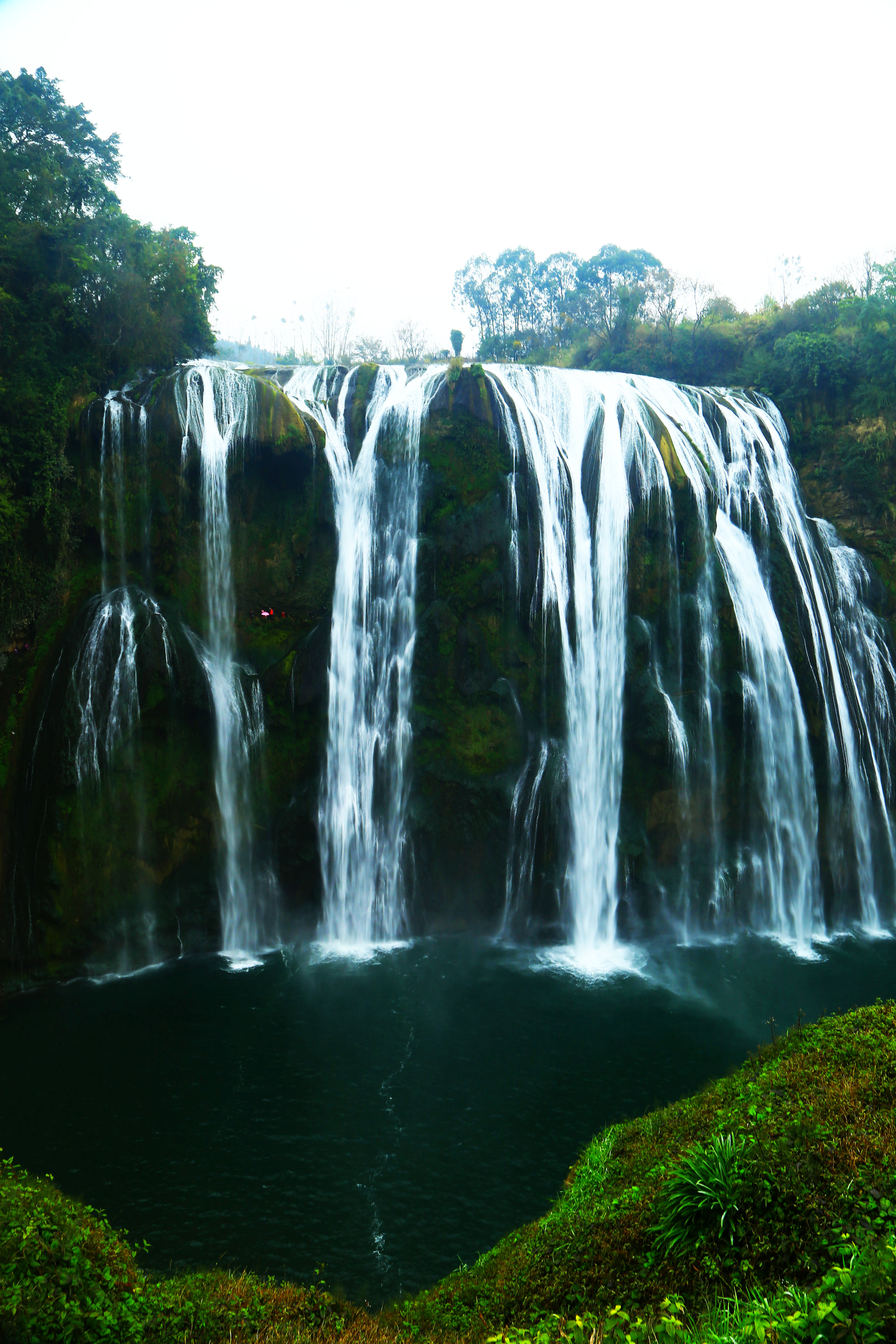 看见银链坠潭已经是天星桥景区的末尾了,导游词形容他其形如斗,其声如歌,其状如链。瀑布只有十余米高,上面成漏斗形,底部是槽状溶潭。在潭沿面上隆起的石包,象一张张下覆的莲叶,交错搭连,河水在每一张叶面上均匀铺开,纵情漫流,象千千万万条大大小小的银链,轻音嚷嚷地缓缓坠入溶潭,永远没完没了。三岔河水被钙华滩分成串串珠链,坠入深潭,是黄果树瀑布群中最秀美的瀑布,这是流水丰富时候的景象了,我们到达的时候,水流轻小,石面湿苔遍布,流水一缕缕的自由相随,从大石头面上坠入深潭之间,却没有太多清脆的坠响,只是细无声息的漫流。