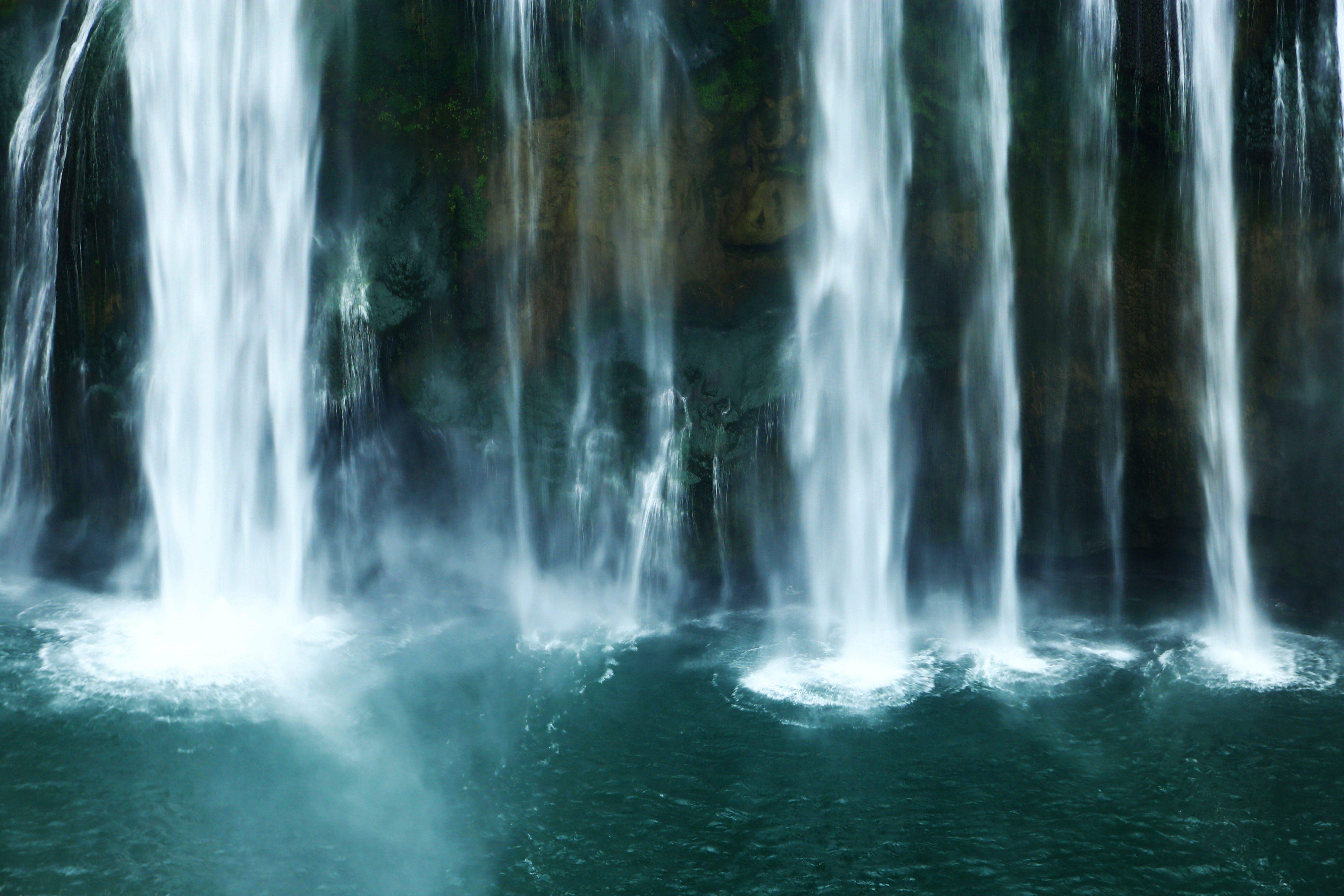 飞泻而下的水流如绸缎一般挂在悬崖之上,这还只是枯水季节,可以想见丰水时候的盛况。水流掉落底下的深潭,激起层层水雾。