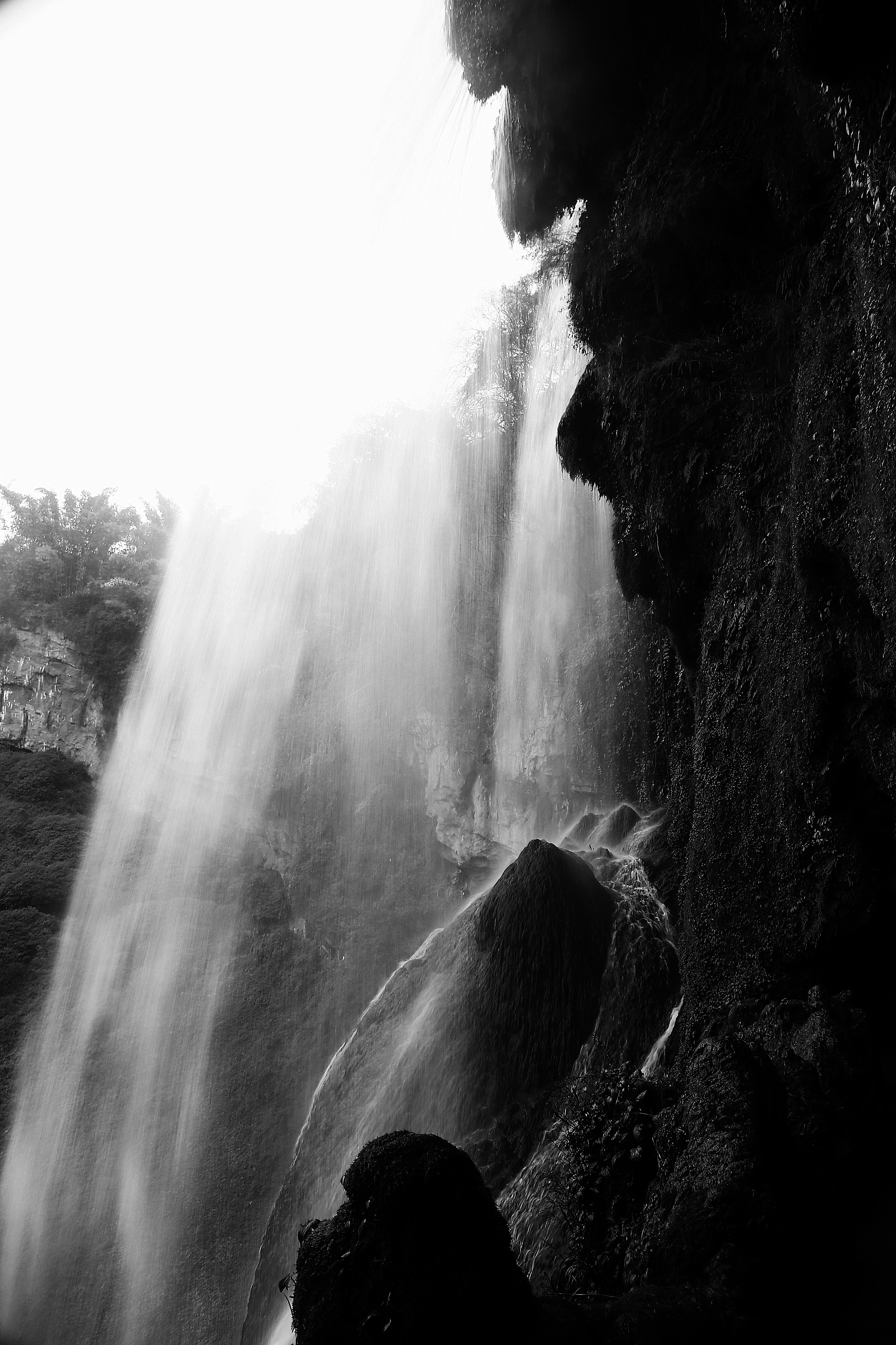 从观景台远远的看过来,水帘洞仿佛数扇小小的窗口,在流水中间张开黑黝黝的洞口,仿佛又怪兽能够冲脱出来。有些坦露的通道可以看见行人的身影。走进水帘洞,里面的空间并不开阔,与想象中相差深远,洞内光线不佳,并不只是天气的因素,水流在你的身边飞驰而下,激荡在洞口裸露的岩石上,四射飞溅。水雾弥漫在空气里,风很大,所以空气并不陈腐。岩石上顽强的小草在水流冲激之下,摇摆着,仍然坚强的站立着。水帘洞是典型喀斯特地貌,具体而微,走过十几米长的狭窄通道就是出口了。路面湿滑,有惧高症的我甚至不敢靠近水帘的那一侧,胆大的游人可以坐在洞口的钟乳石上悠然自得。