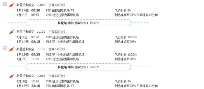 8.关于航班问题。我们是北京出发,斯里兰卡航空,往返的时候中途都会在科伦坡机场转机。这样的话好像是价格比较优惠。如果有条件的话不推荐我们这样的时间点,一晚上七个多小时在飞机上坐着真是要累死了,睡也睡不好,空间很小,到了岛上根本没有玩的精力了,这一晚住马累也行。