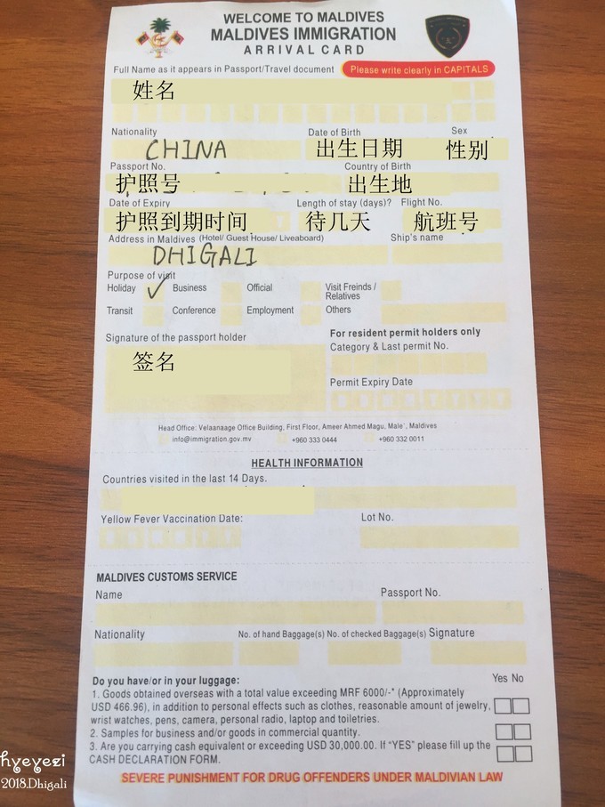 一个小时抵达马累,入境的时候需要填入境卡。之前我从别的游记那里存了一张,不过拿到手里的跟图片有一些不一样,可能是会更新吧,大体是差不多的。我重新拍了,大家可以作参考~