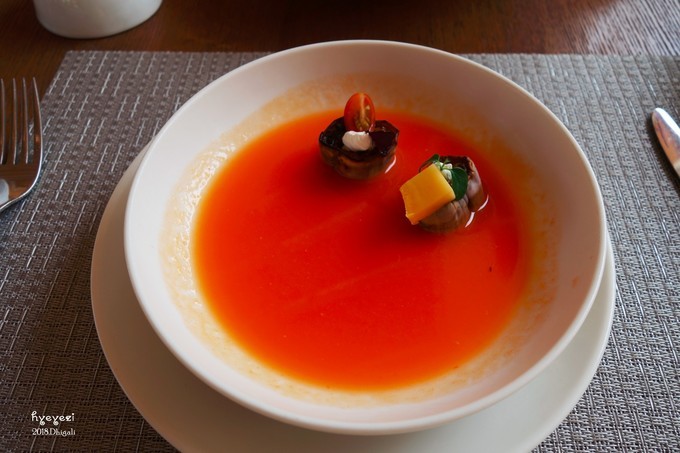 这个红色的汤,不知道是什么,味道特别奇怪。蜜月晚餐里也有这个,厨师问我是不是不好吃,我真的不好意思回答他