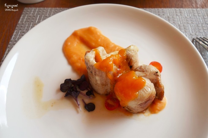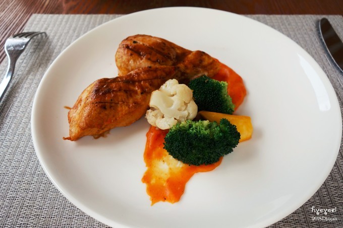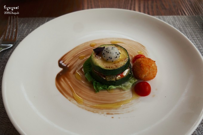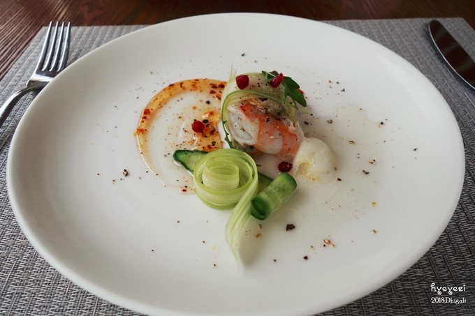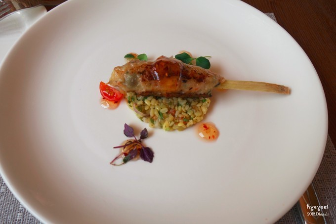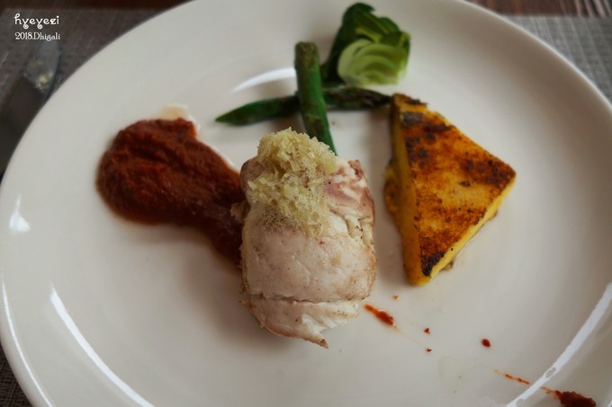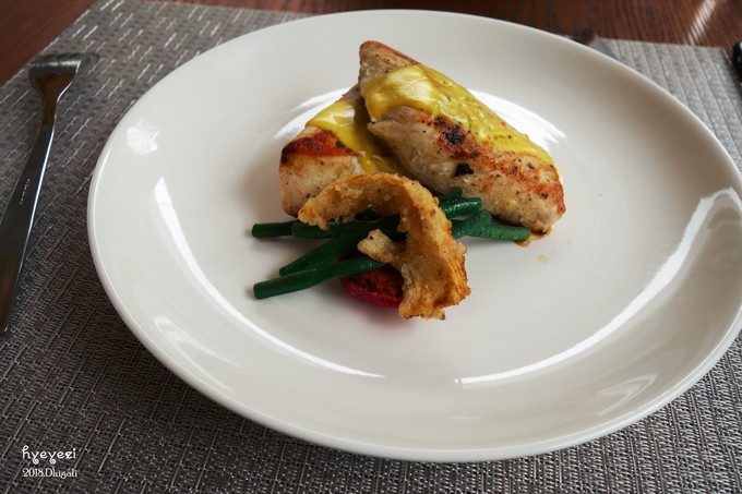 14点左右去吃午饭,前面说了我们升级成了早午晚餐。午餐是在Jade餐厅,每天都有不一样的菜单,只能从菜单里选。前两天我们还one one one每个都试一下,后来还是翻译个别单词,有的雷不能踩第二遍了
