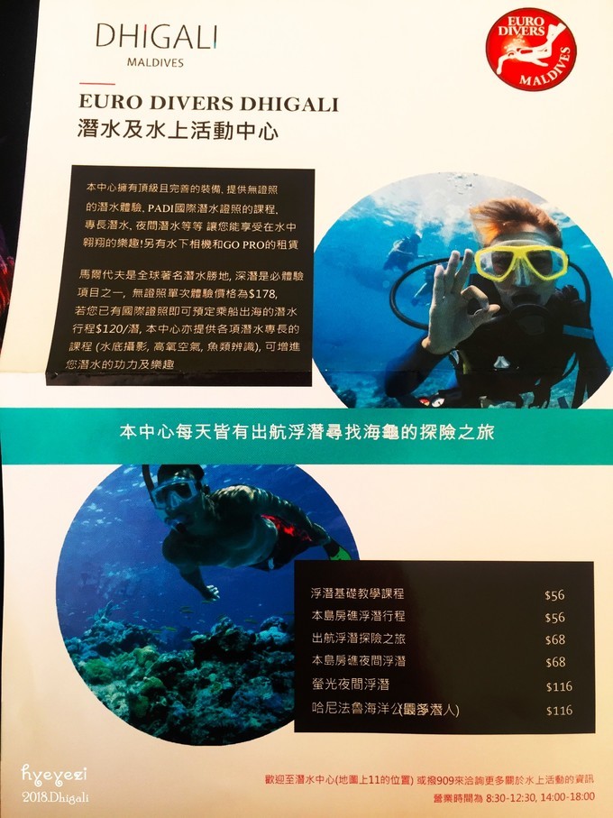吃完午饭溜达到浮潜中心,预定了后天的出海浮潜~浮潜中心有一个中国姑娘,圆圆~她会非常热心的给你介绍项目,也有中文宣传单,自己可以选择。
