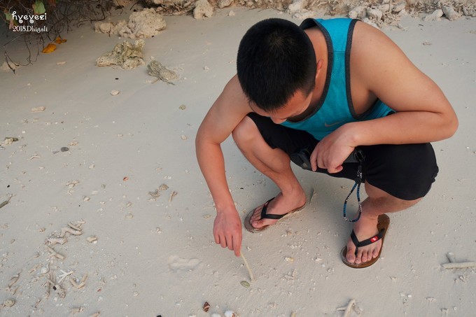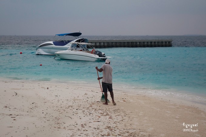 这里每天都有人在打扫卫生,清理的不是垃圾,应该是一些浪打上来的细碎贝壳、珊瑚。