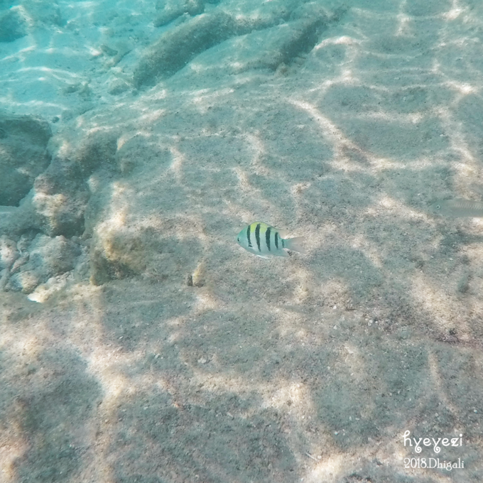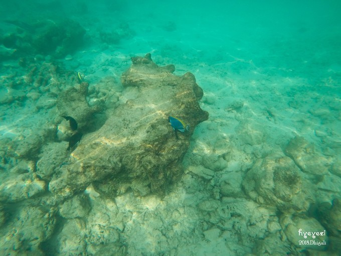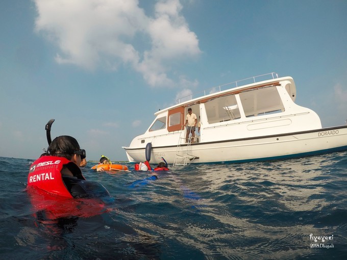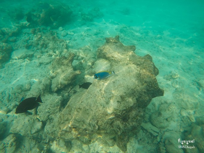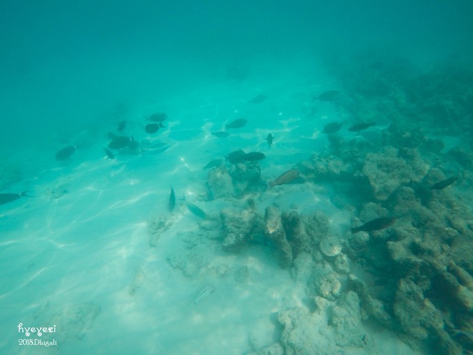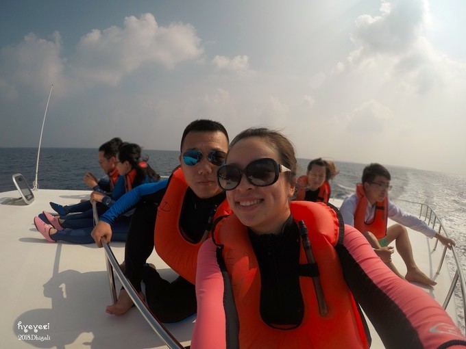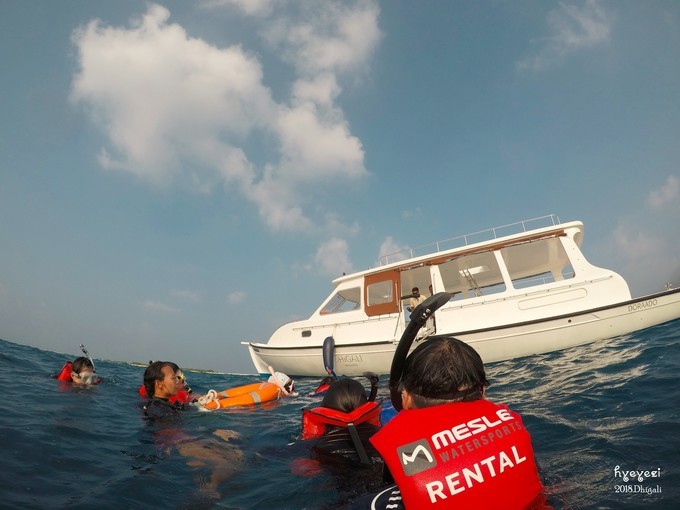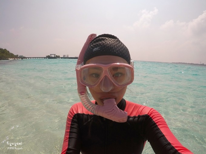 上午一直在屋外浮潜~Dhigali的浮潜级别好像比较一般,沙屋外面的浮潜条件不如水屋。不过对于初次浮潜的人来说,还是挺不错的~装备穿戴整齐,下水~