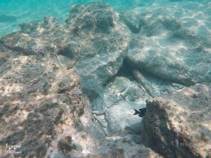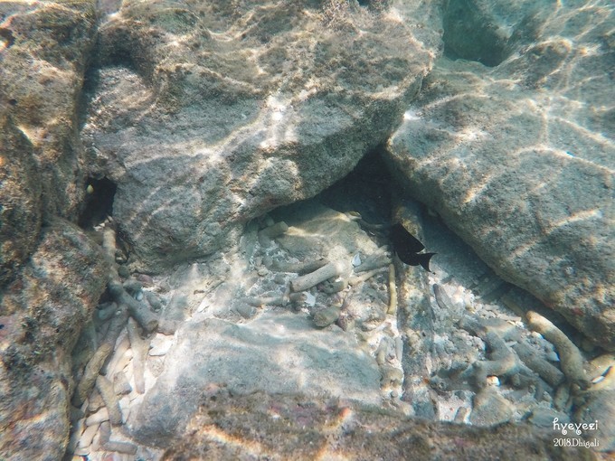注意,就是这条鱼,当初吓得我们不敢下水。别的鱼看见人就游走了,可是它不会动。圆圆说它是在伪装自己,哈哈~