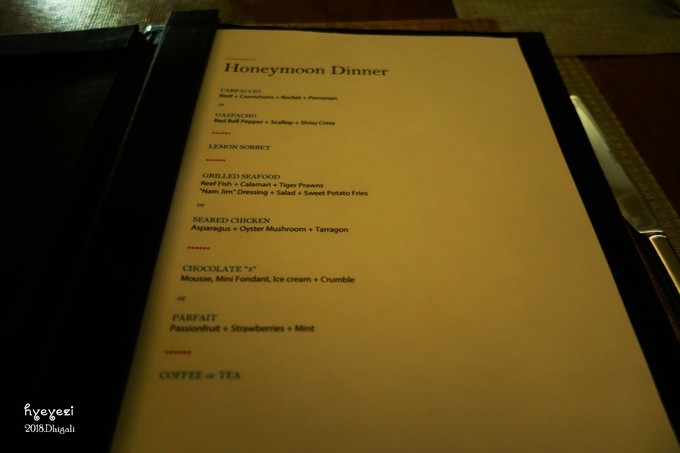 注意~之前看有攻略写蜜月晚餐后有蛋糕呀甜点呀香槟呀什么的,现在统统都没有了,统一的就是下面的这些!咖啡和茶是免费喝的,水是每天两桶,肯定够喝。