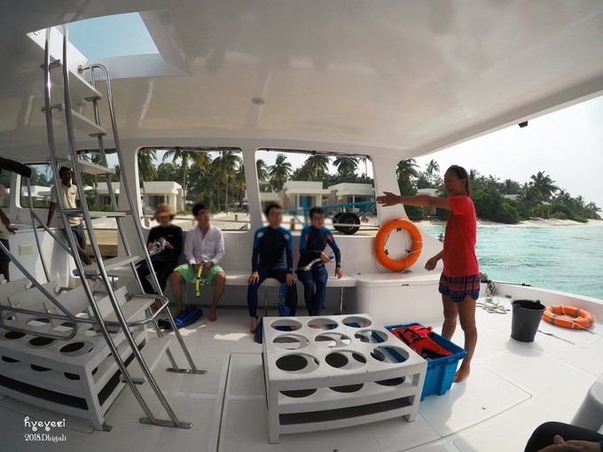 圆圆老师带队,我们一共四对儿,三对儿中国人,一对儿韩国人。上船之后介绍了船长、船员,讲解了注意事项等等。对面的两对儿小伙伴没有游泳基础,他们前一天参加了培训,如果有不会游泳的不用害怕,也可以像他们一样先培训。