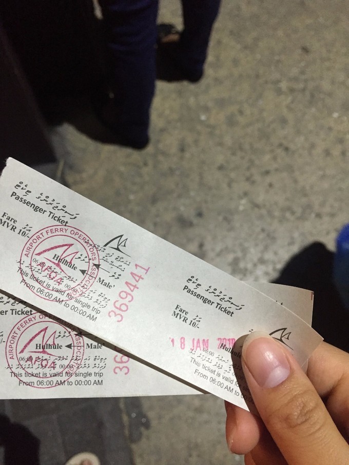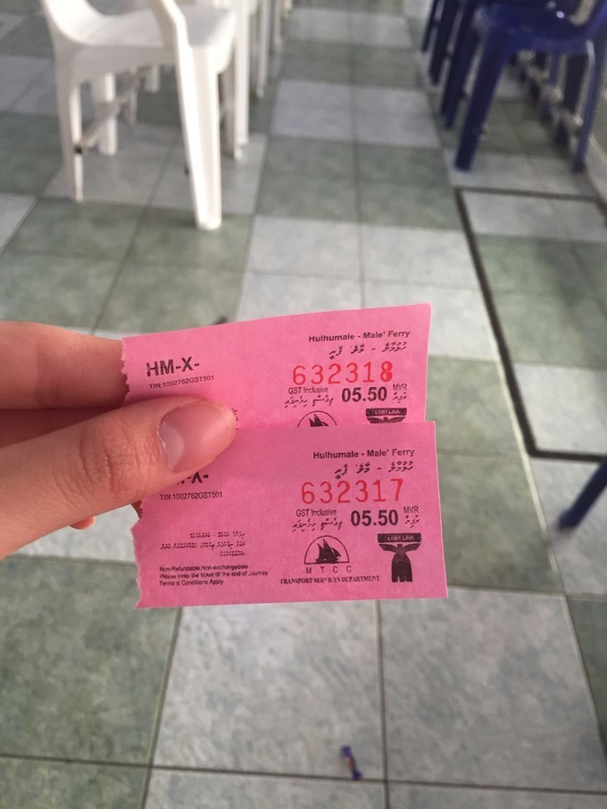 住的地方离坐船去马累的码头还有一点距离,酒店说可以帮忙叫出租车。到码头2美金~船票我们是用的当地的货币,一共11MVR。船票和船,长这样~