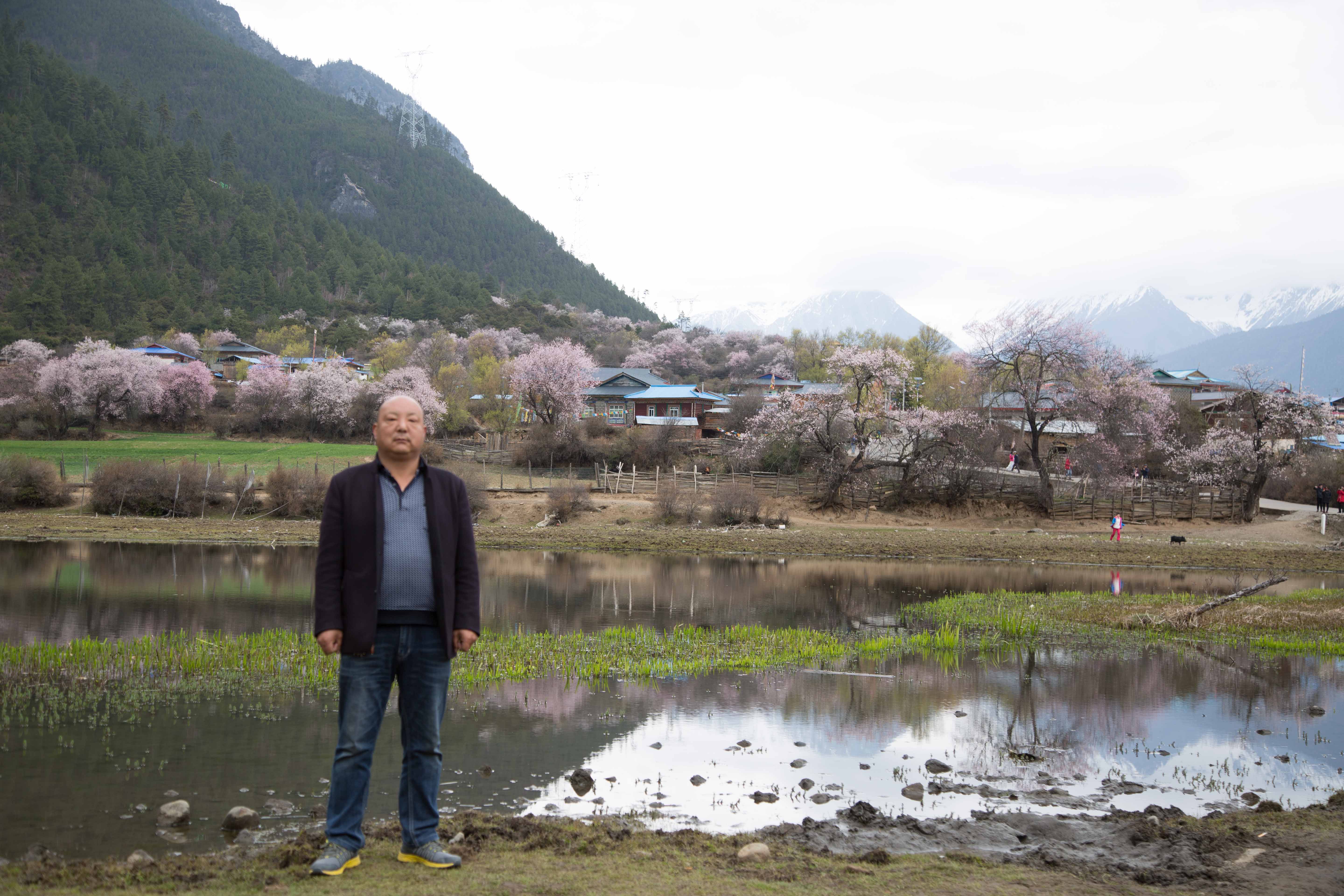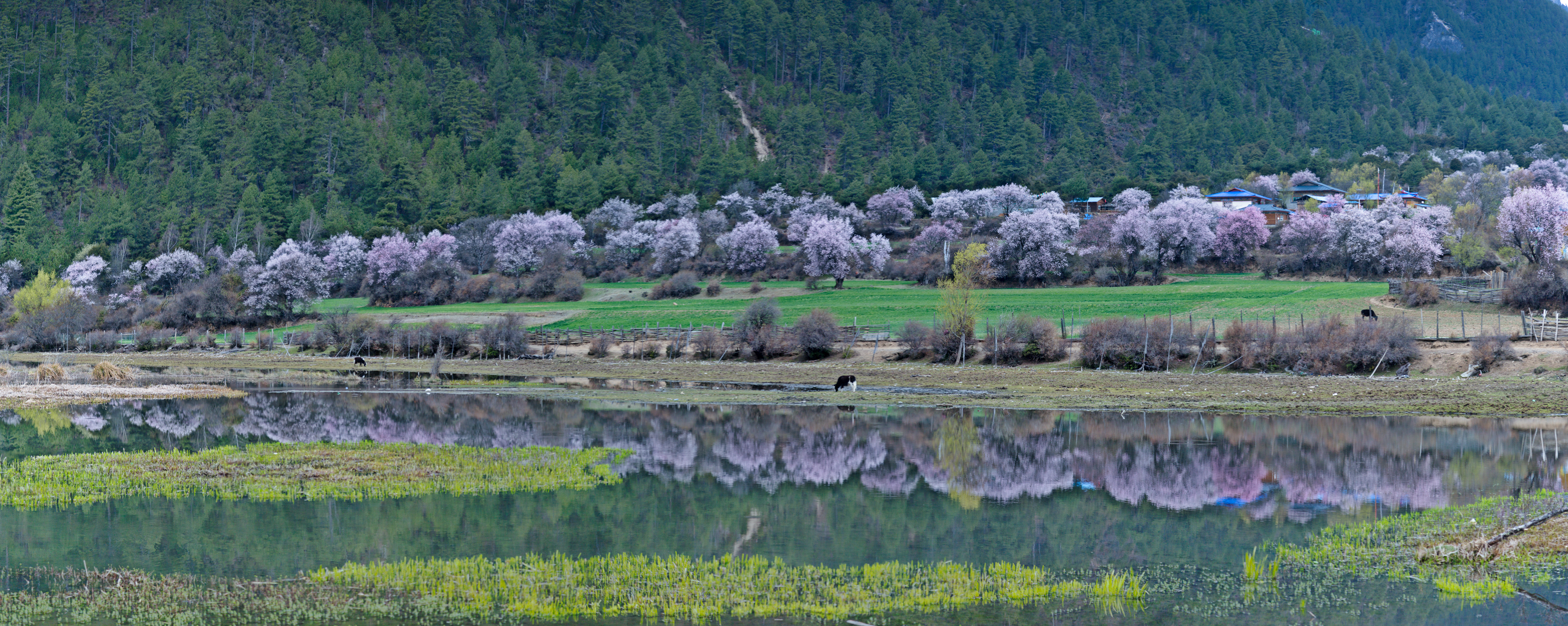 错落的桃花上远处的雪山显得更加的高冷,此处推荐两个点去了其他的地方更本不用去了,一个是波密的嘎朗湖,旧时的嘎朗王朝以不复存在,如今只剩下一个世外桃源般的村落,落于山间阡陌纵横,鸡犬相闻。这里有绿油油的青稞地,粉白错落的桃花林,清澈见底的湖泊,满山吃草的小黑猪,休闲踏步的牦牛,还有与世无争祥和生活在这的藏民。