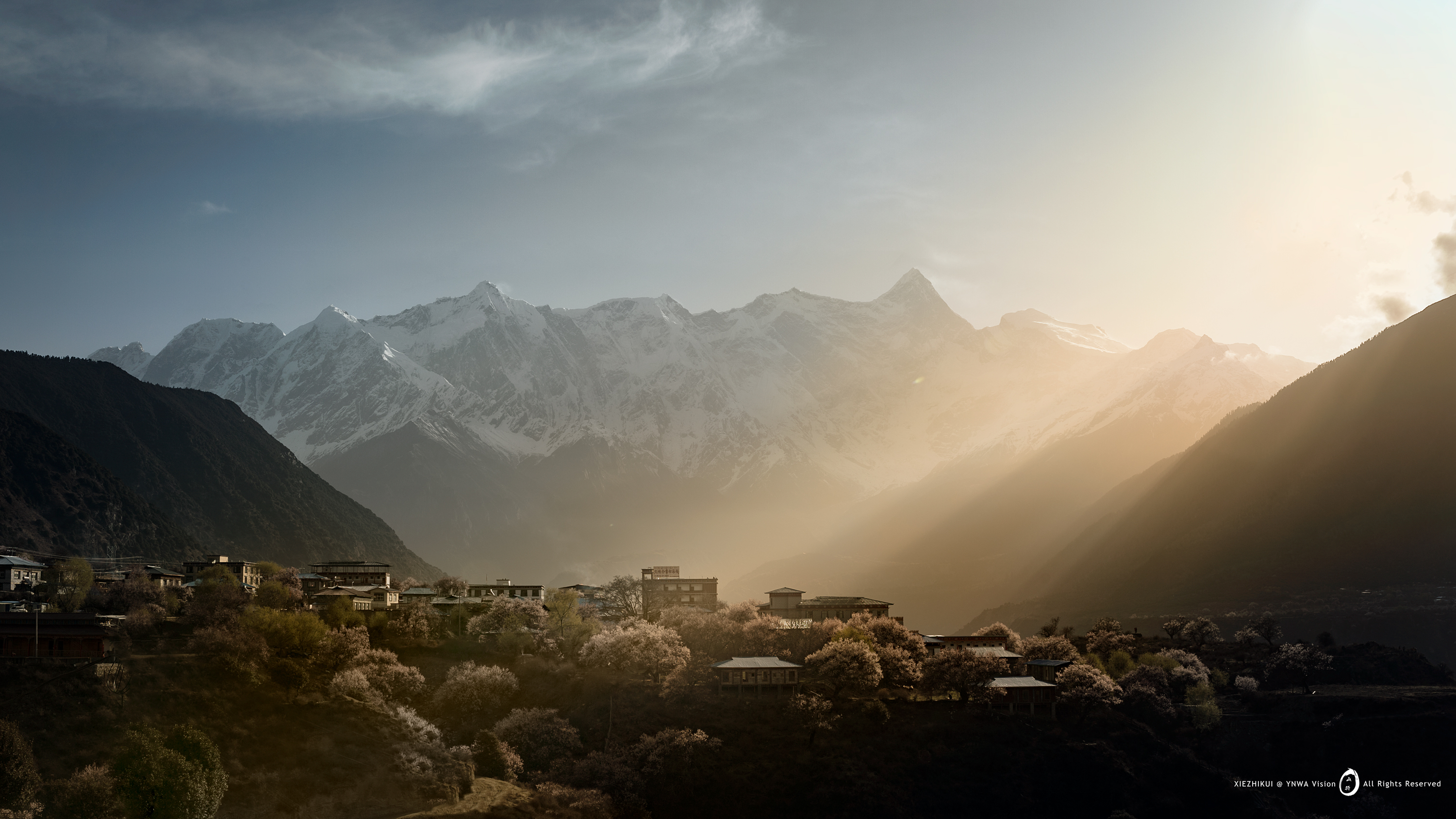 黄昏的斜阳照射到这古朴纯洁的村寨,与山间洁白的梨花交相呼应,呈现一幅唯美的世外风光。