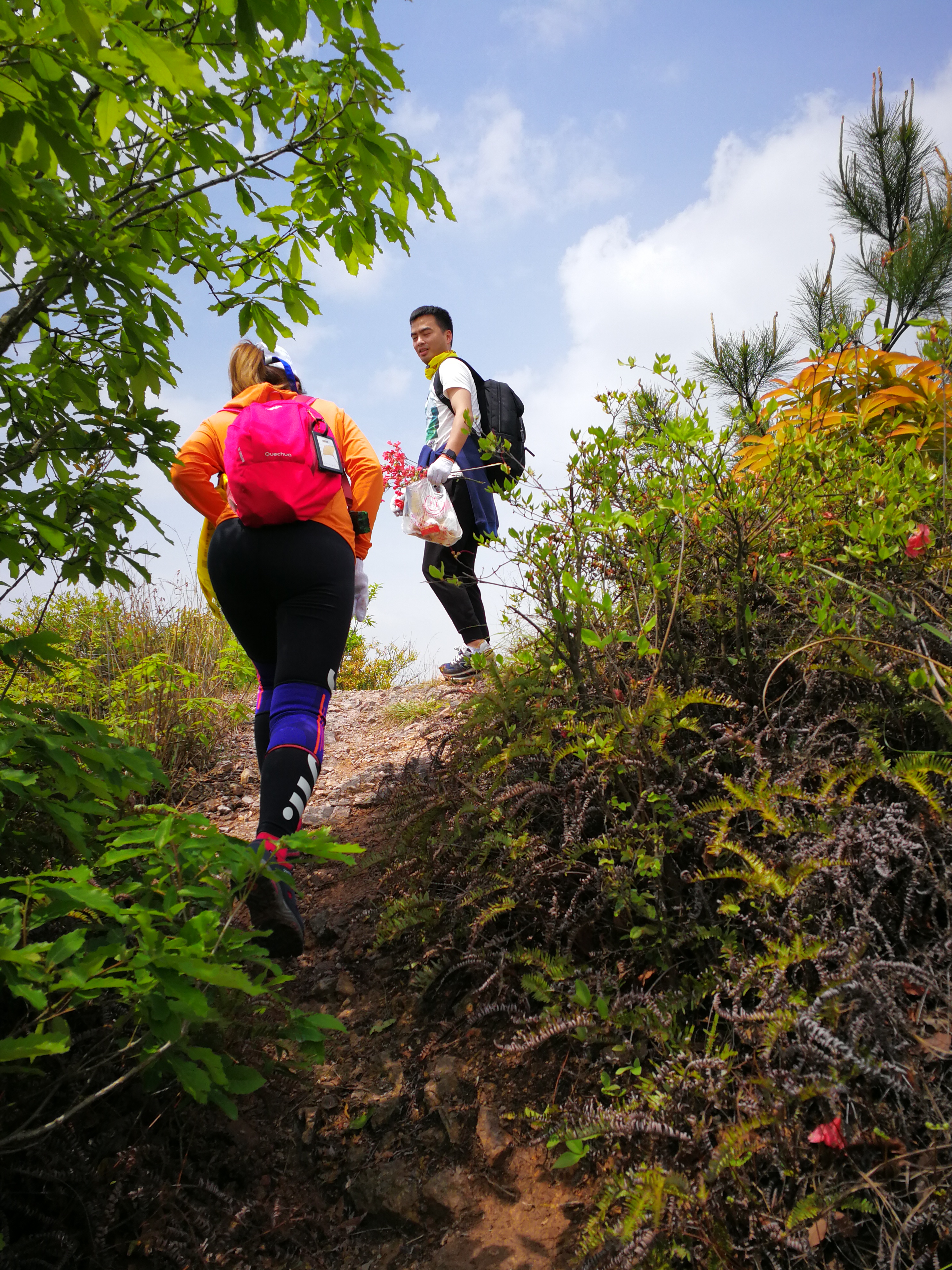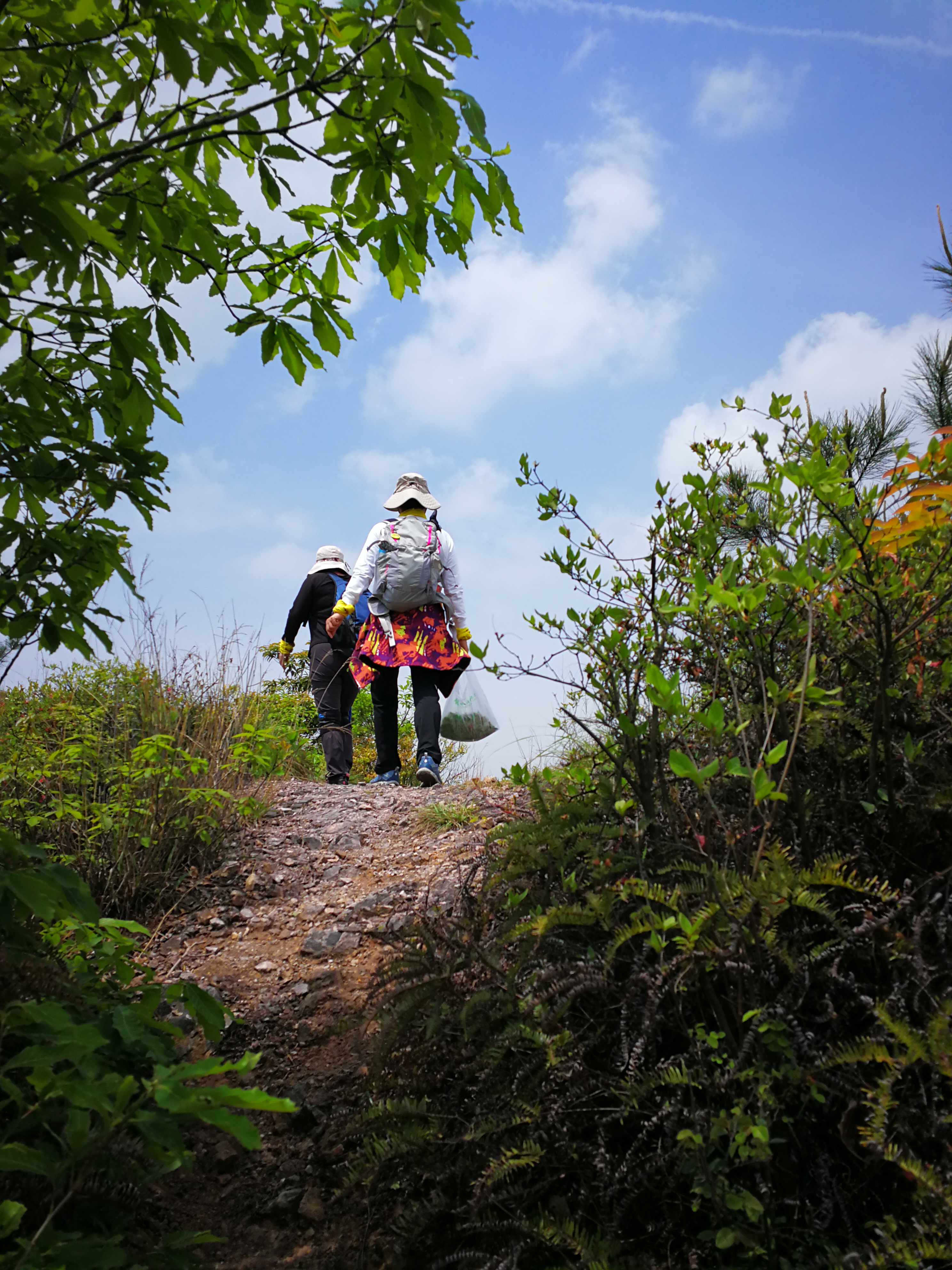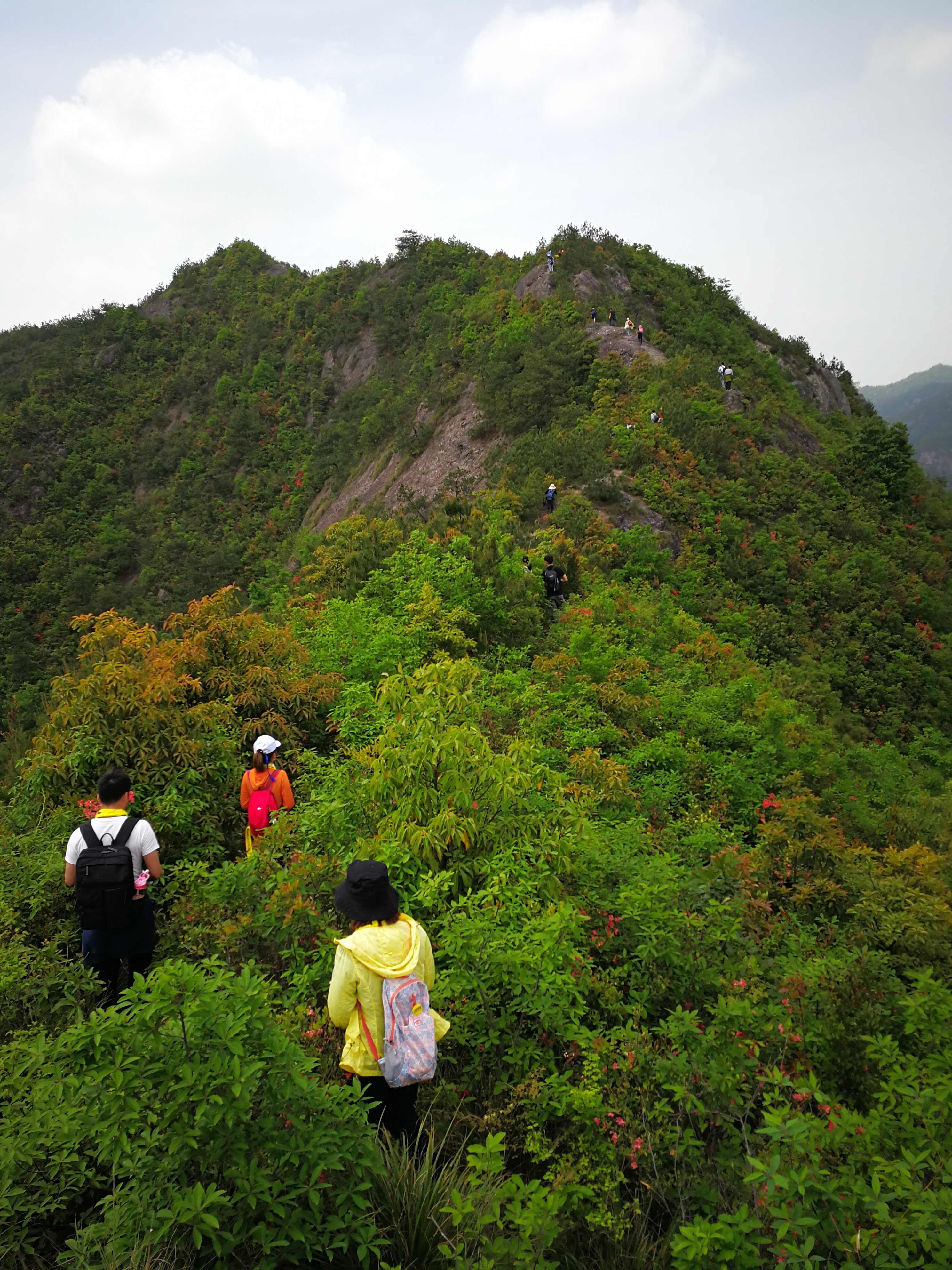 一群人行走在阳光明媚的春天的山脊上,树木葱翠,花儿争艳,远处是一条山脊延伸过去的一个个山头,两边是群山起伏。在山脊上行走,风光与危险始终相伴。乌石山最危险之处,山脊的宽度比教室里的一张桌子的宽度稍微大些,需要一点点蠕动过去。