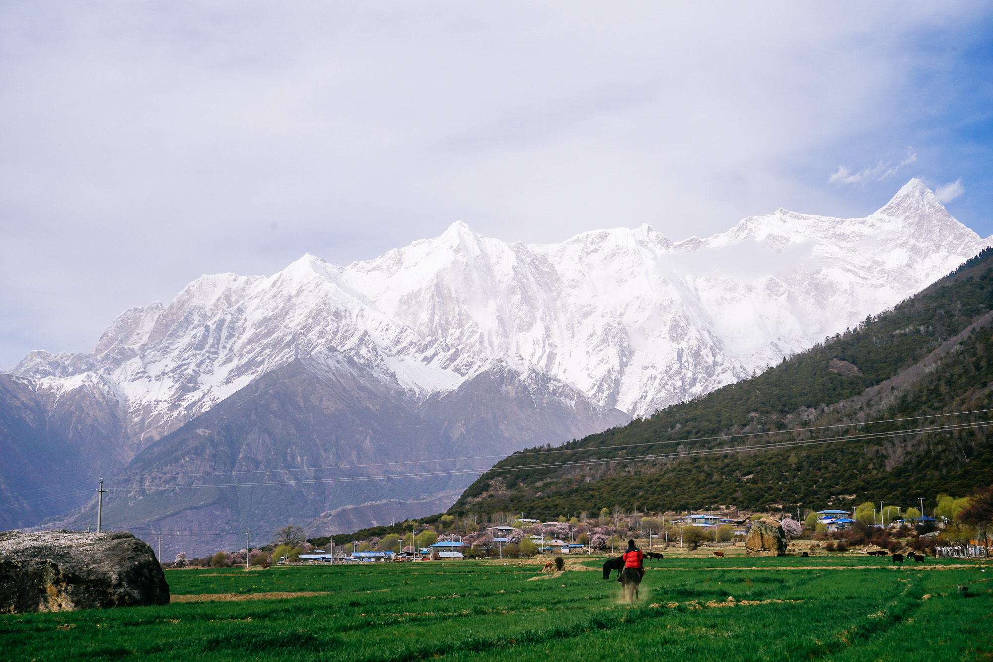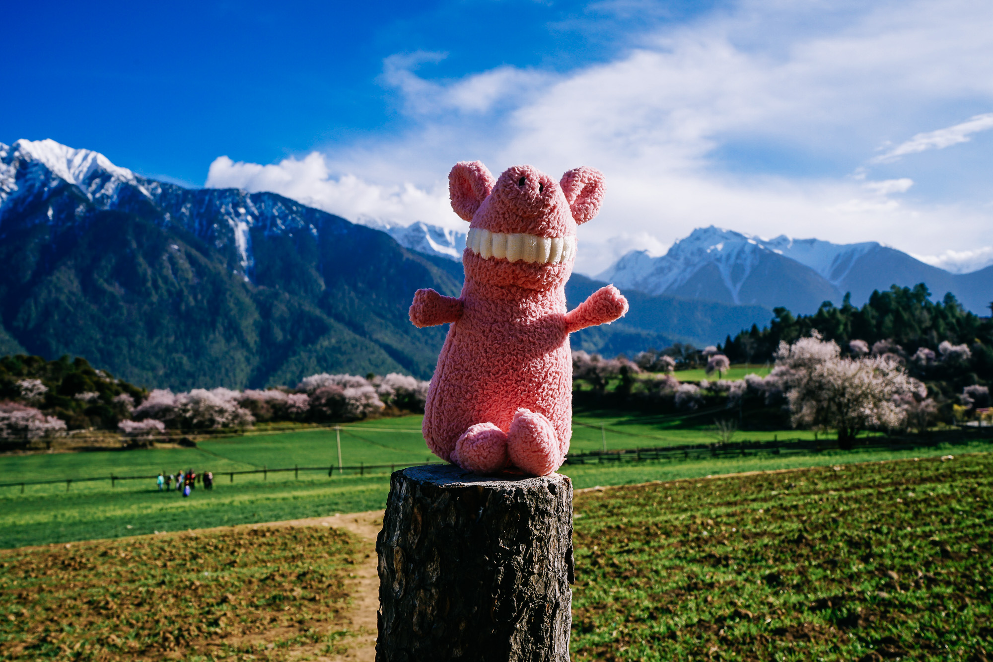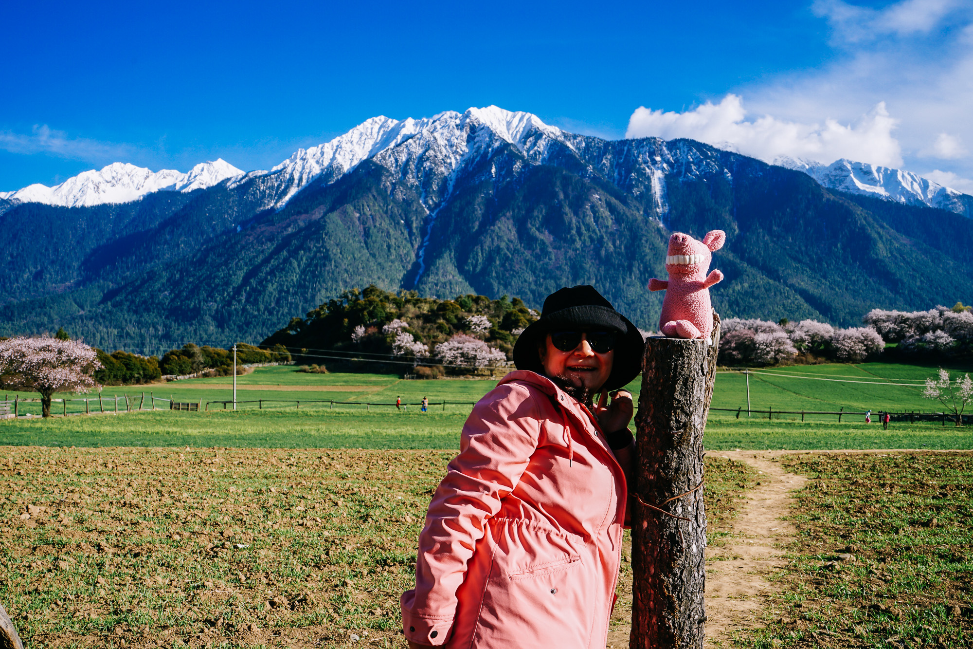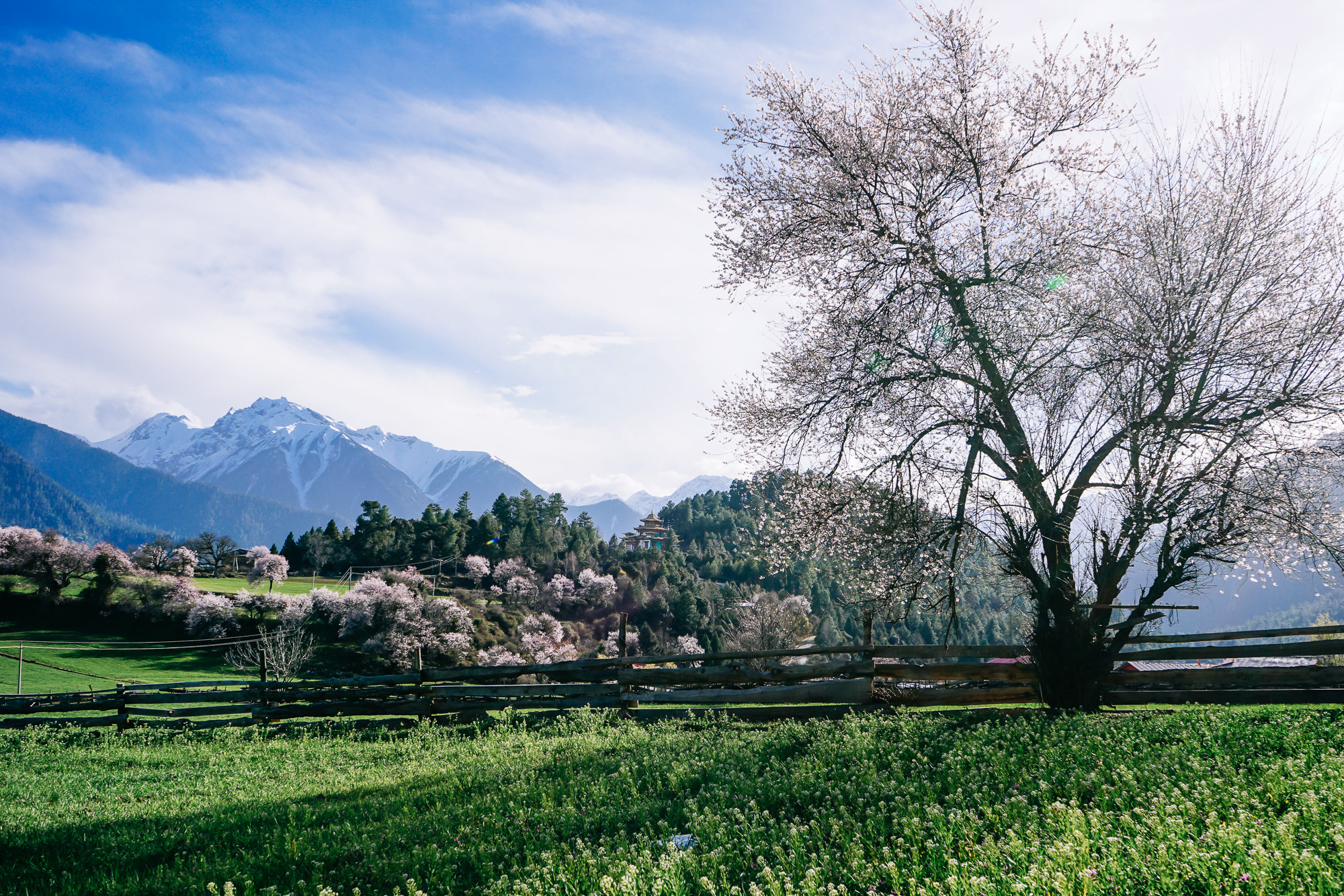 想到了小时候看的动画片《阿尔卑斯山的少女》,碧绿的草坪、不远处的雪山,还有林芝盛产的桃花!