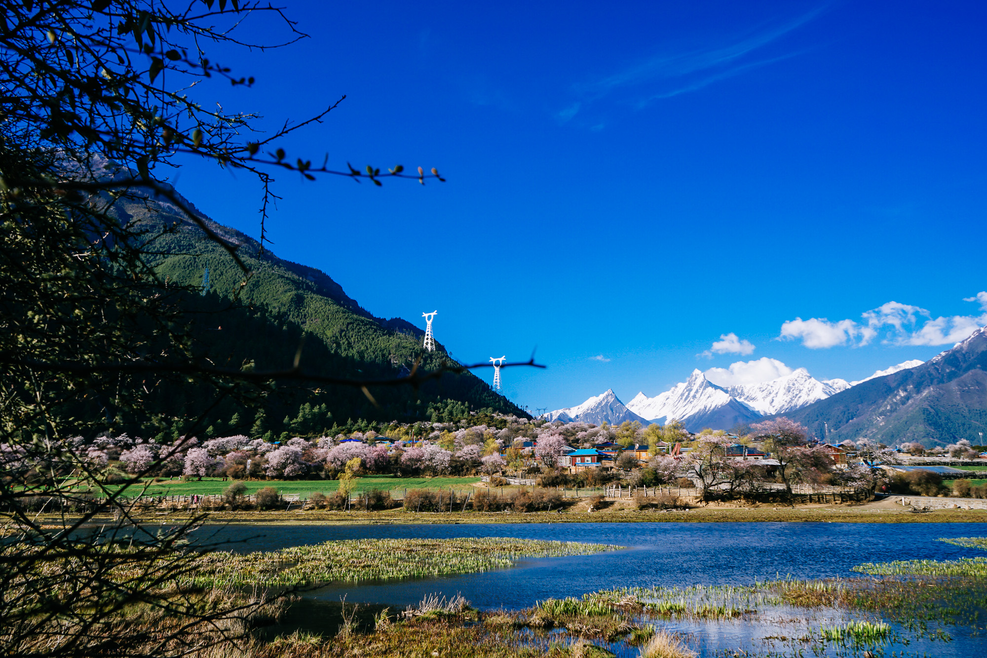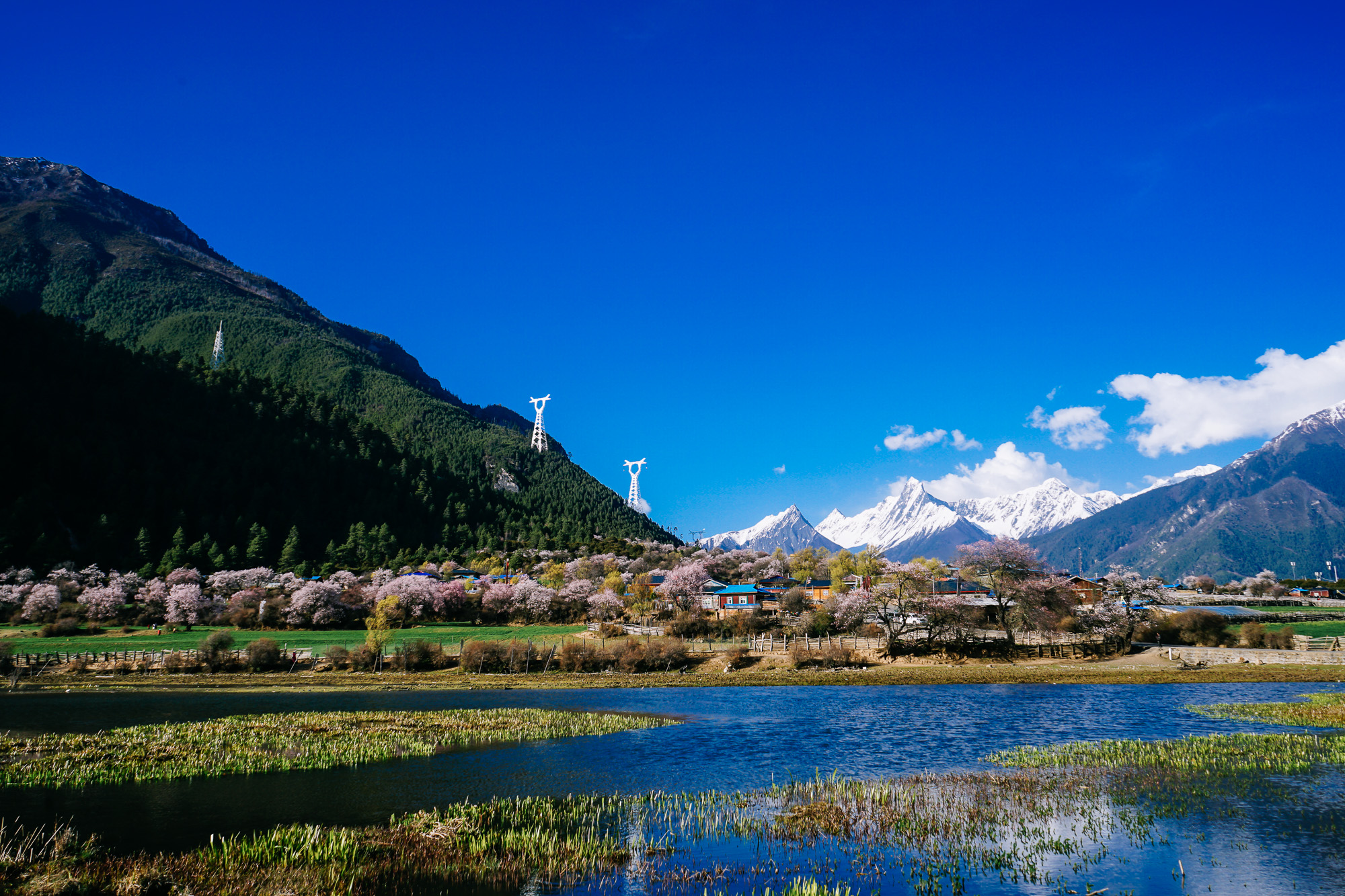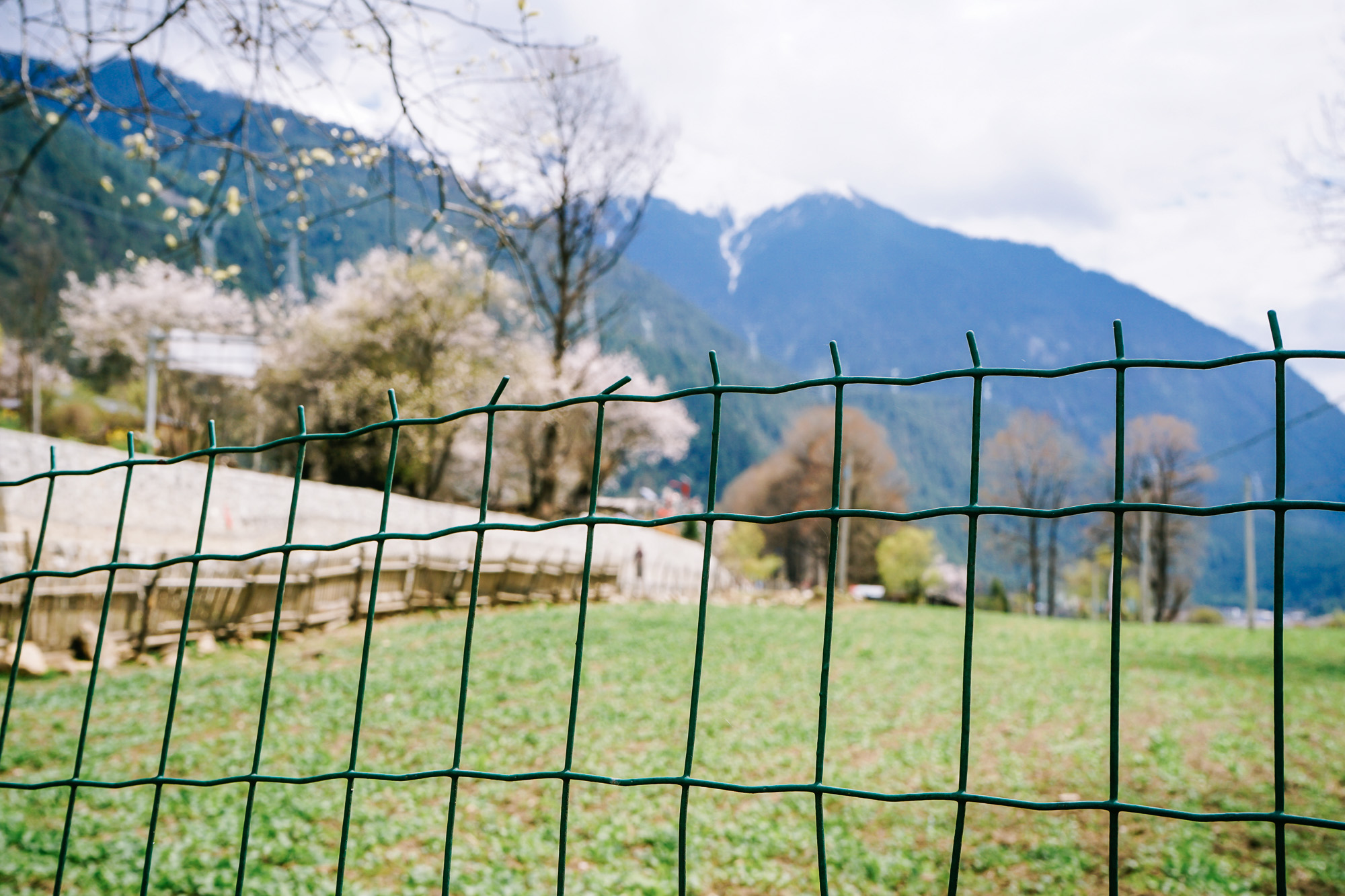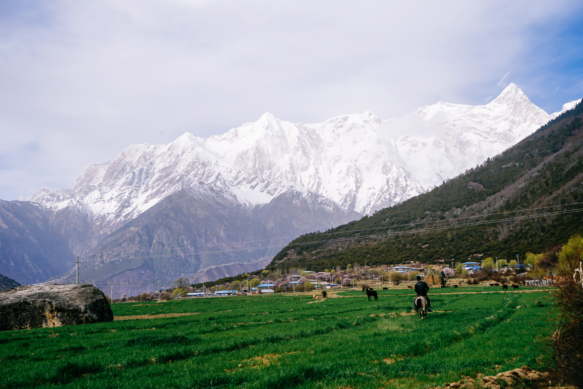 想到了小时候看的动画片《阿尔卑斯山的少女》,碧绿的草坪、不远处的雪山,还有林芝盛产的桃花!