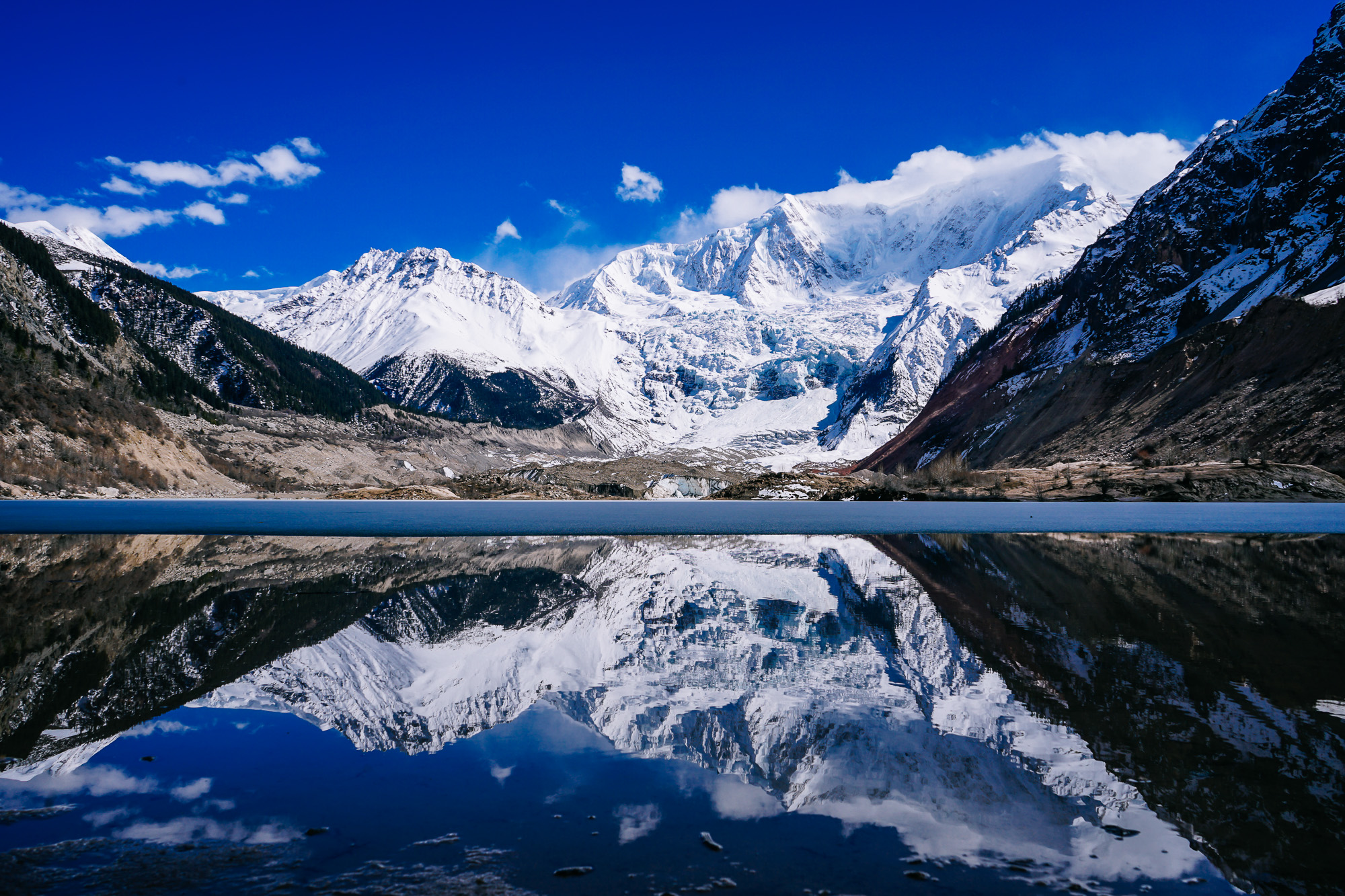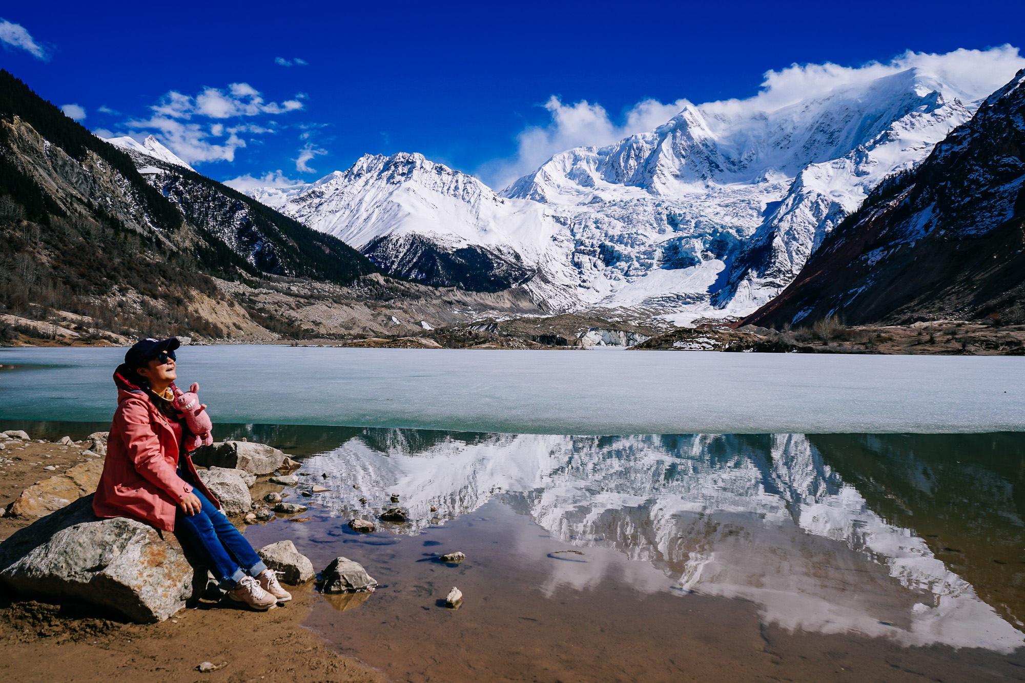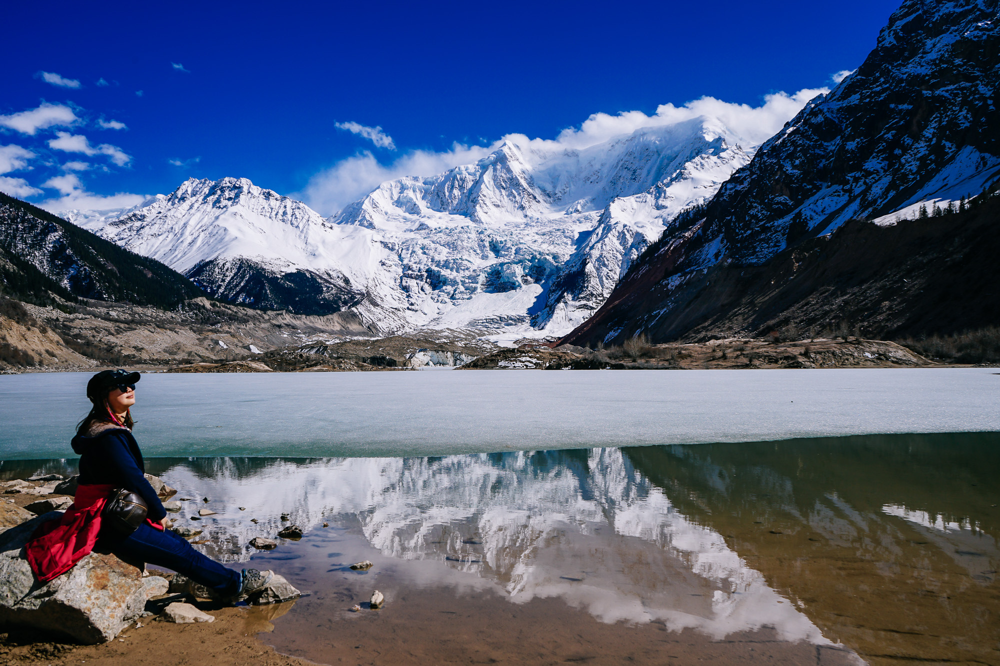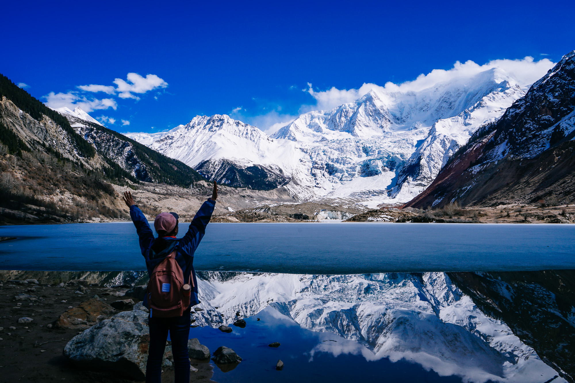 从景区门口下车,步行1.5个小时左右就可以到米堆冰川观景台,我们去的时候正好是冰川下面的冰湖略微消融的时候,正值太阳快要落山的下午,拍到了震撼人心的冰川倒影。
