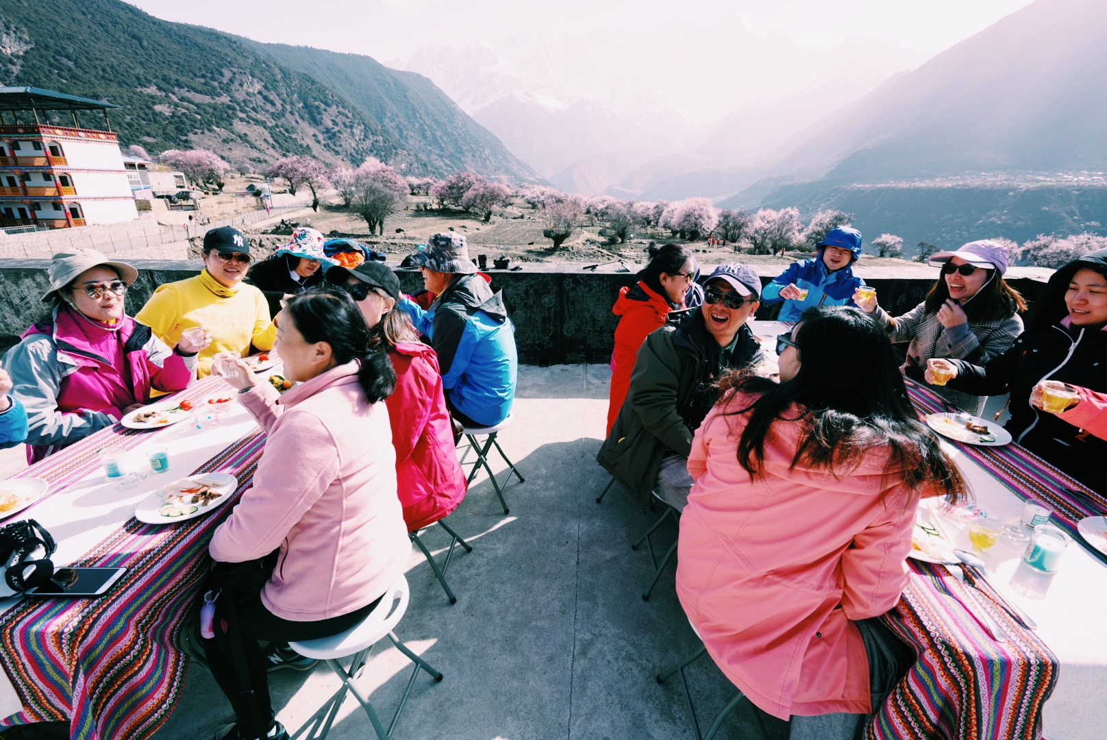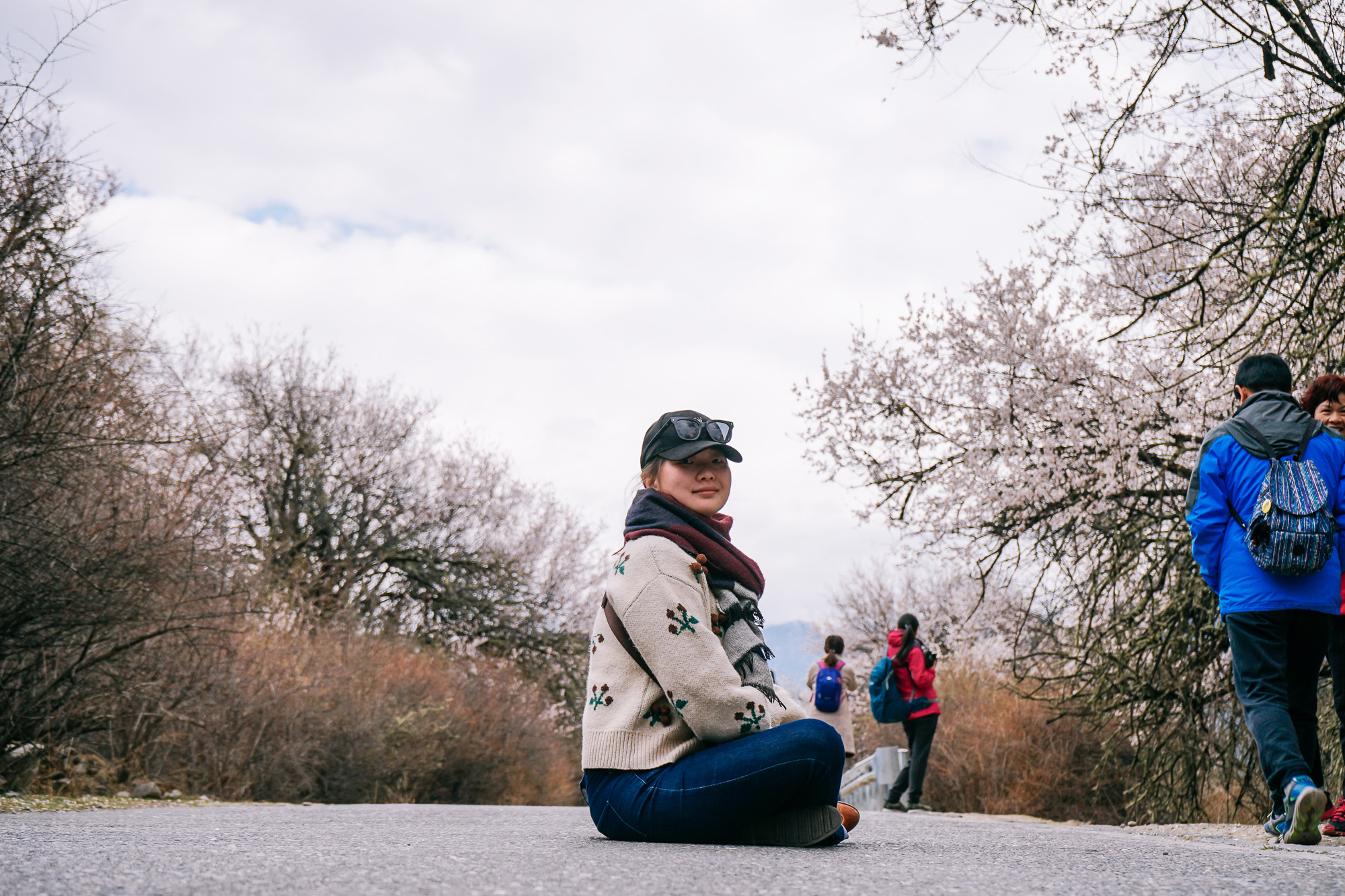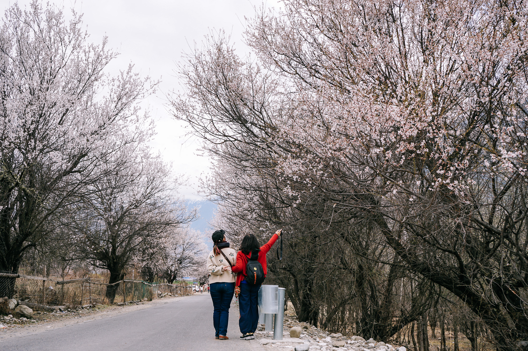 我们的大巴车顺着公路一直往前开,两边都是盛放的桃花树。