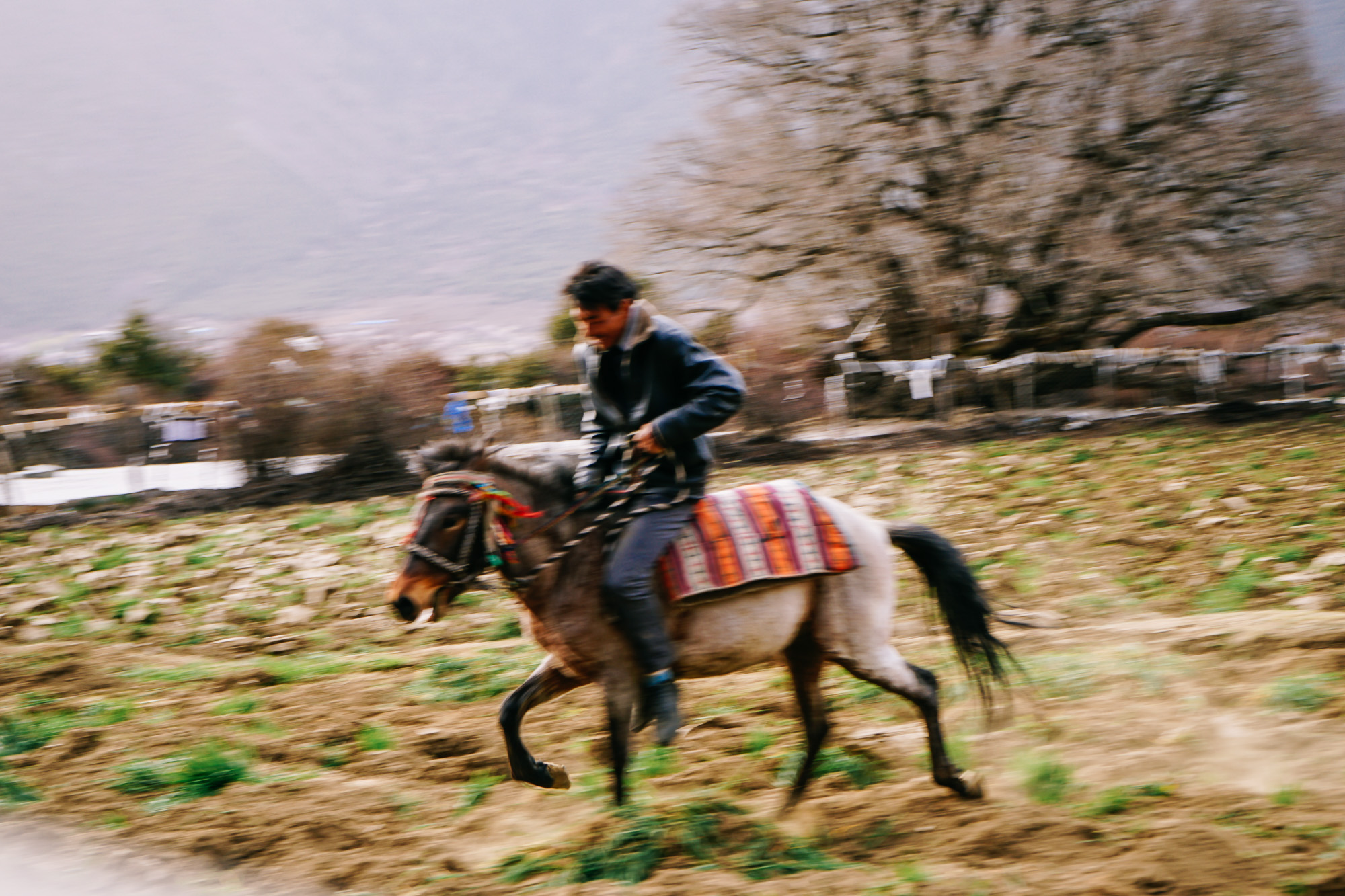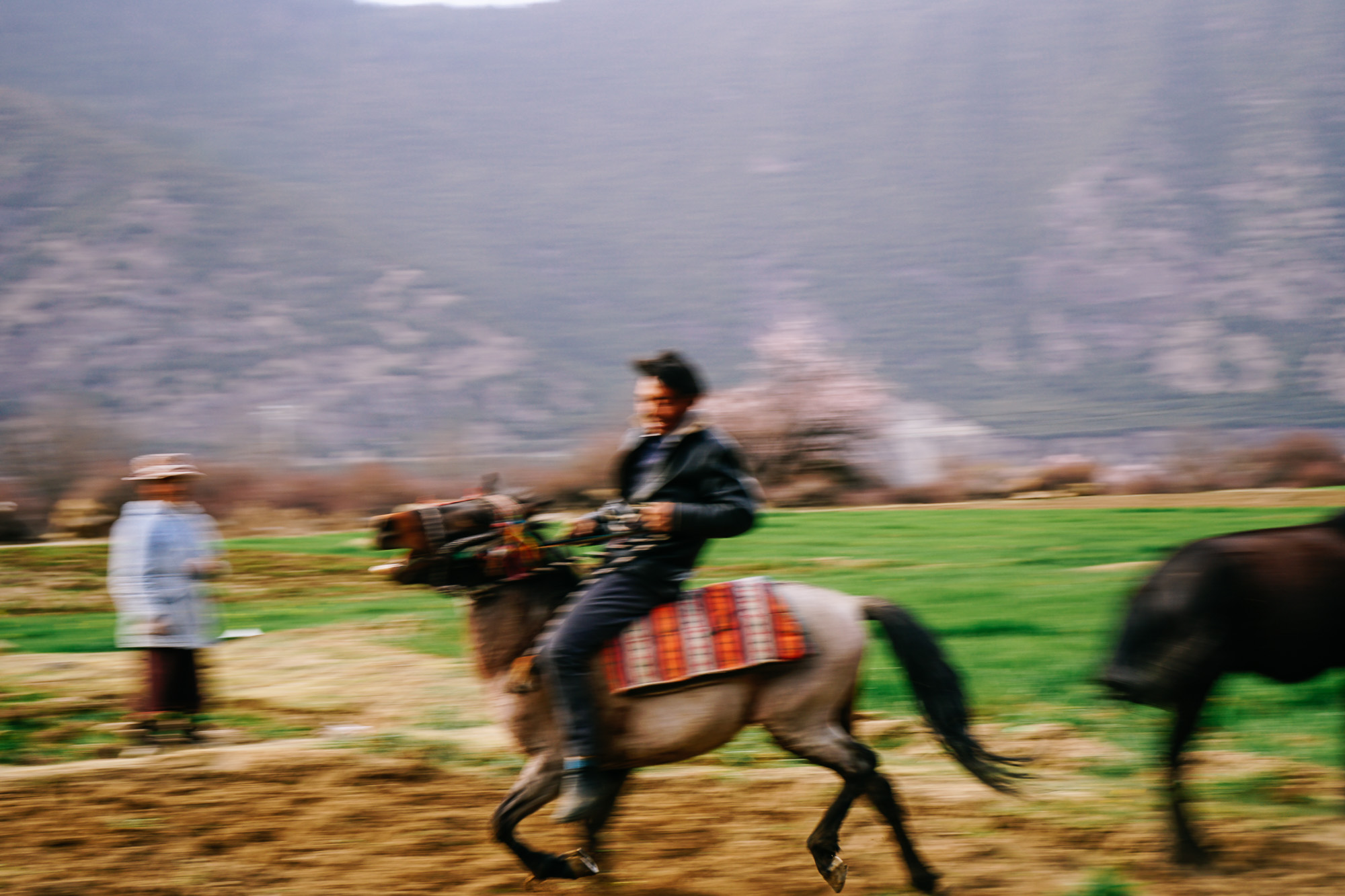 下山的途中碰到当地居民在草地上骑马,背后就是南迦巴瓦。