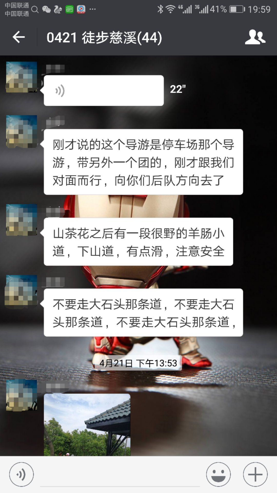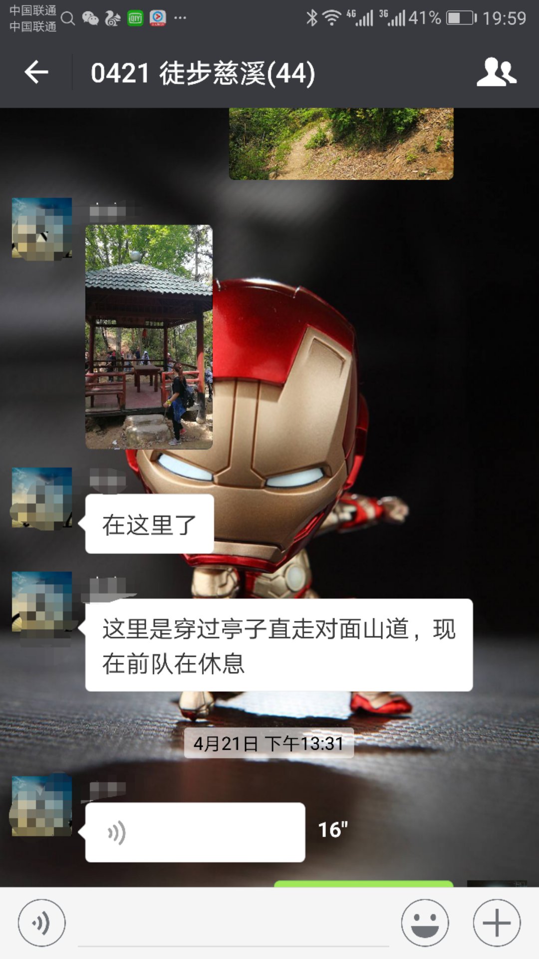 2.由于路程较长,午后的阳光灼热难耐,经历了很陡的上坡,在爬上望海亭之后,大家消耗了大部分体力。导致后面的队伍比较分散距离也比较大,原定线路与现有向导线路有一定的出入,岔路口比较多。先头部队的一枚小美女担心后队走岔路边不停地在微信群里给后队指路,起先发的语音后担心队员不重视就又从新写了一份文字。