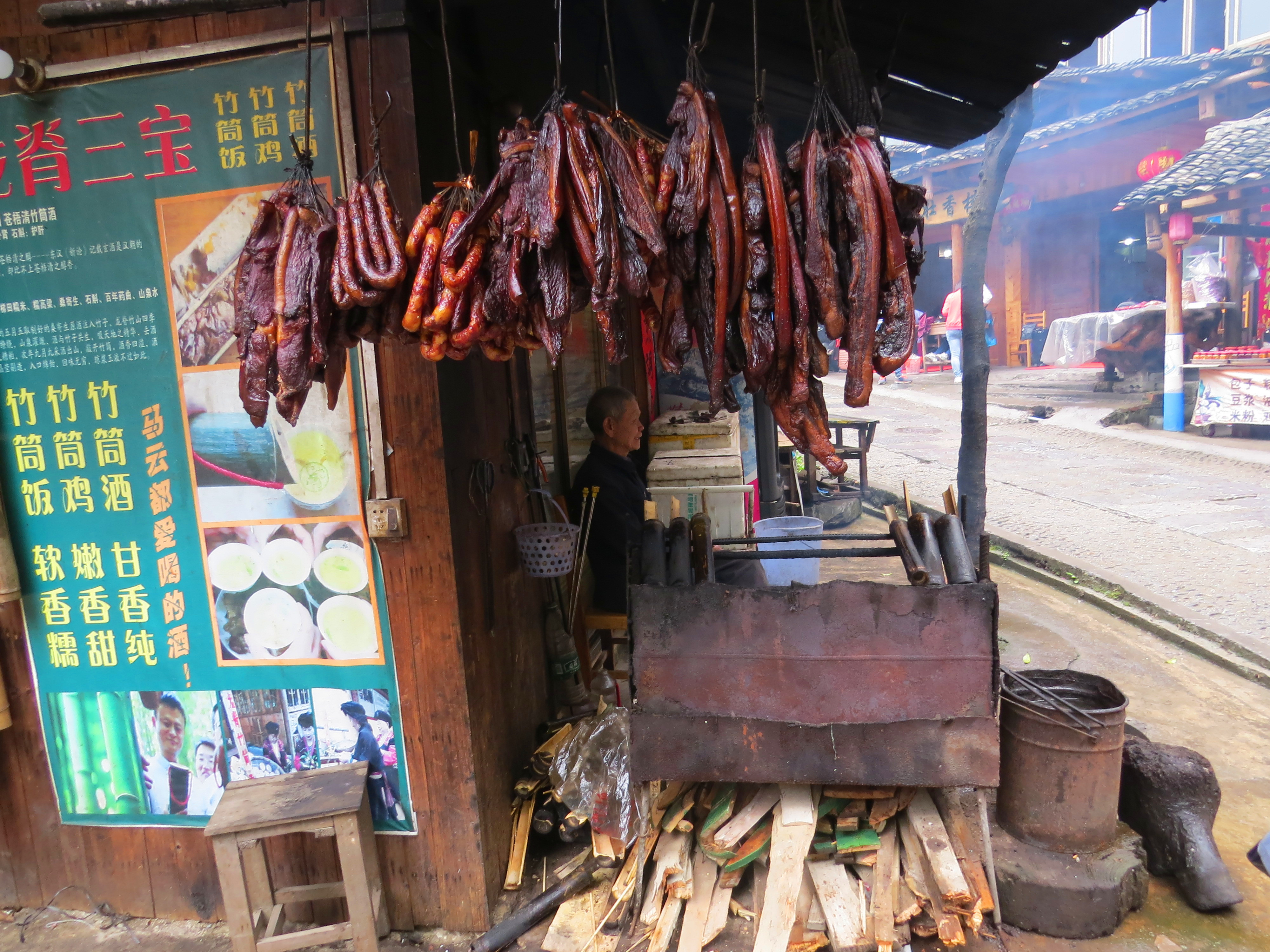 寨子里的老人开始守候在烟熏腊肉的旁边。