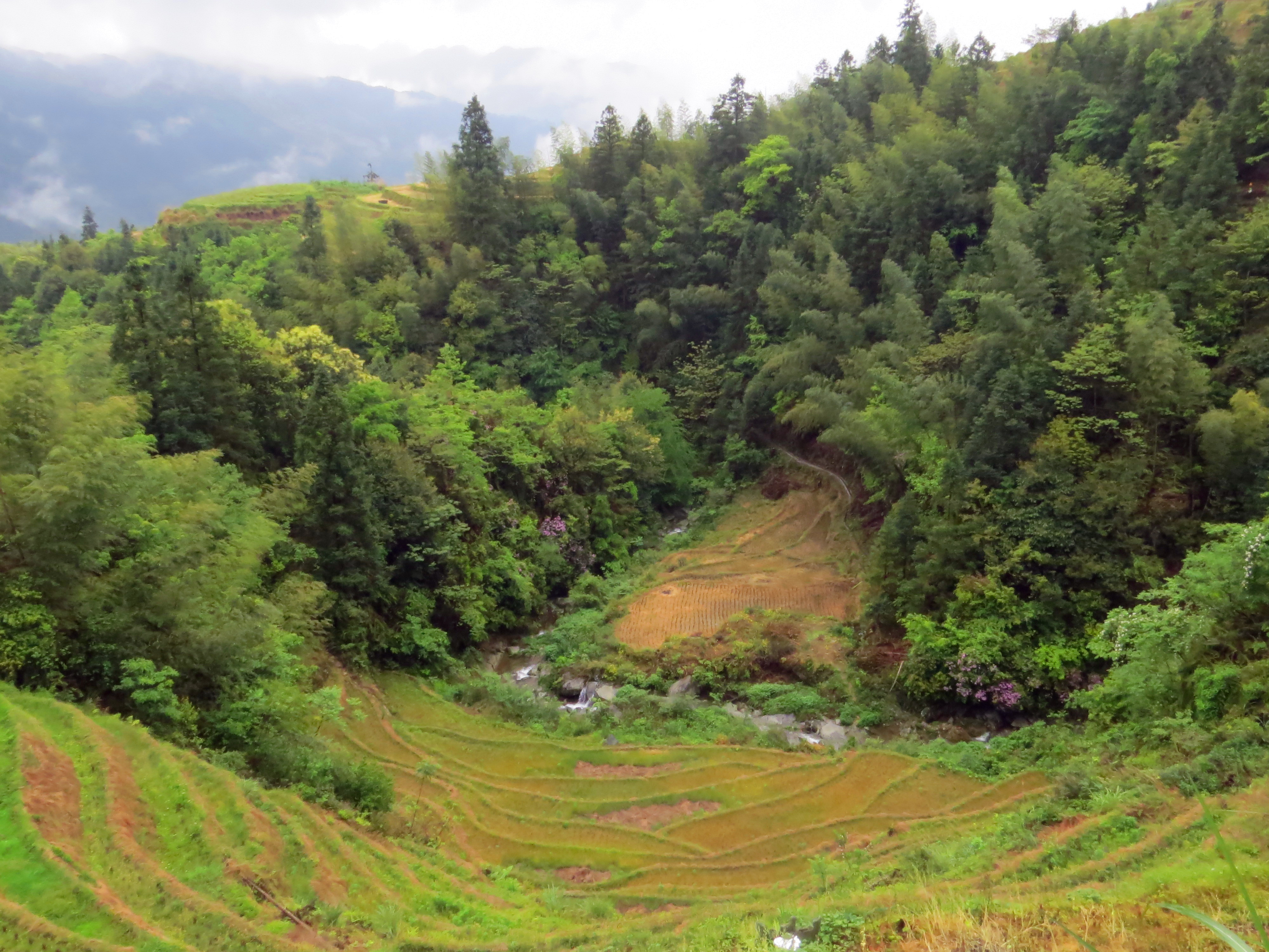 还没有到开耕和灌水的时节,虽然少了点绿色,但是这就是农业生态的美,也是龙脊的美。一年四季景观各异,春来,水满田畴,如串串银链山间挂;夏至,佳禾吐翠,似排排绿浪从天泻;金秋,稻穗沉甸,像座座金塔顶玉宇;隆冬,雪兆丰年,若环环白玉砌云端。这种景象是可以称得上是人间一大奇观。有趣的是,在这浩瀚如海的梯田世界里,最大的一块田不过一亩,大多数是只能种一二行禾的碎田块,因此有“蓑衣盖过田”的说法