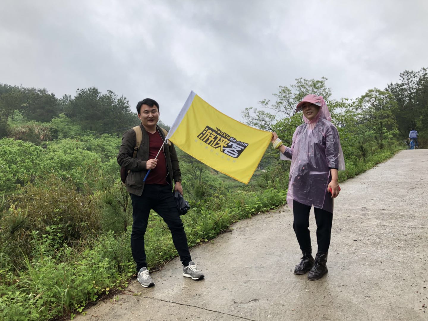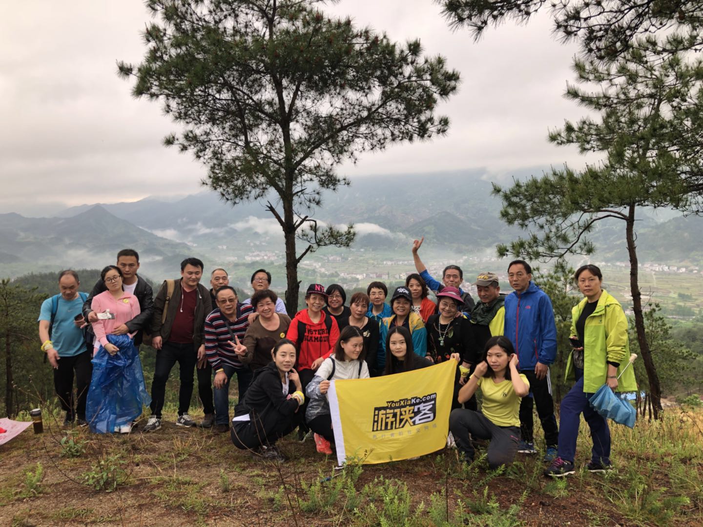 到了一个山坡顶上,视野开阔,背景也还好,那岂不得来张游侠大合照