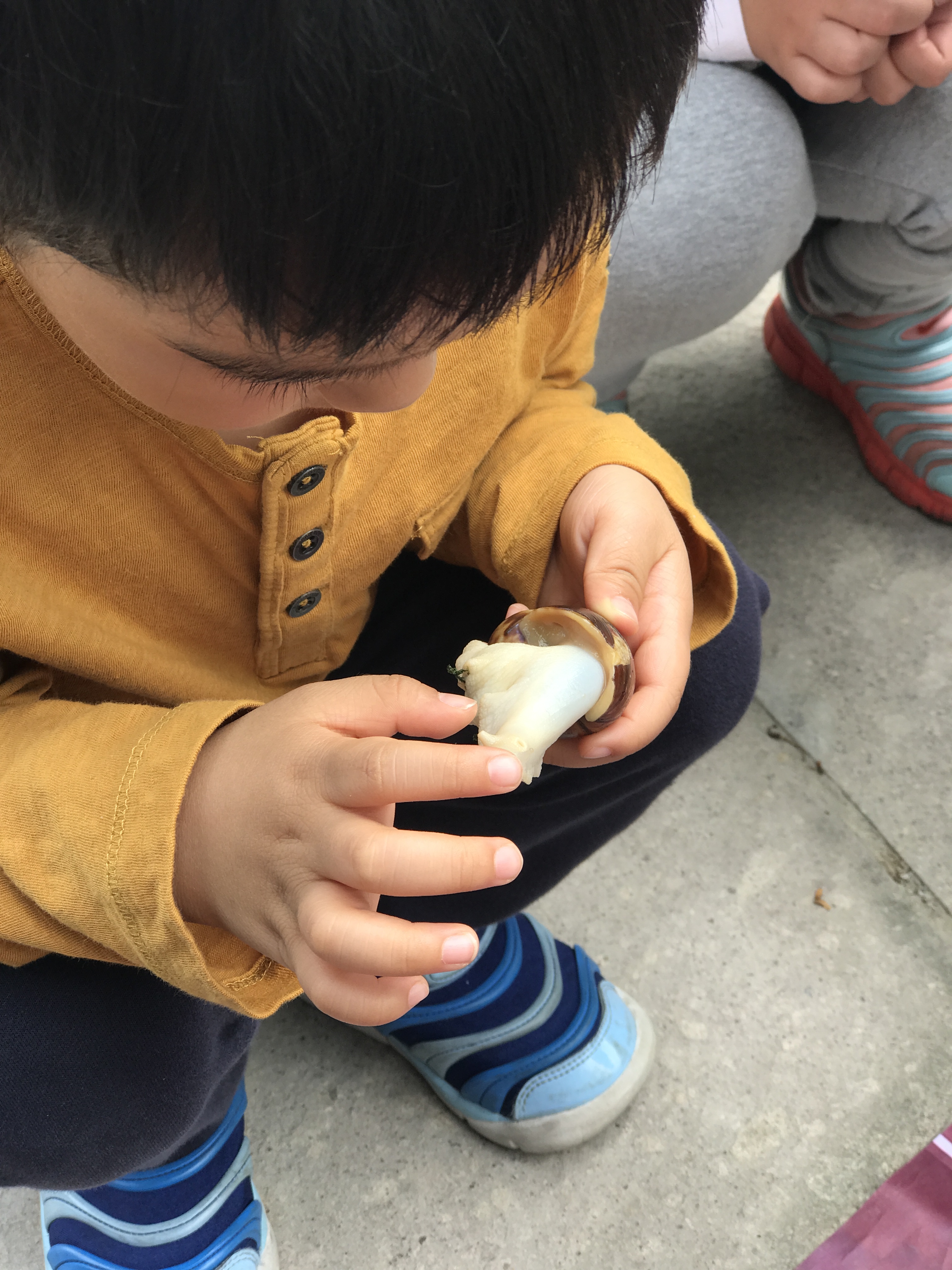 现在小朋友的胆子可真大,这是团队里第二小的小朋友,还是个女生,竟然敢这样抓抓蜗牛满地跑.作为女孩子的我,此时此刻不得不退位让贤给这位名叫美宝的小朋友了