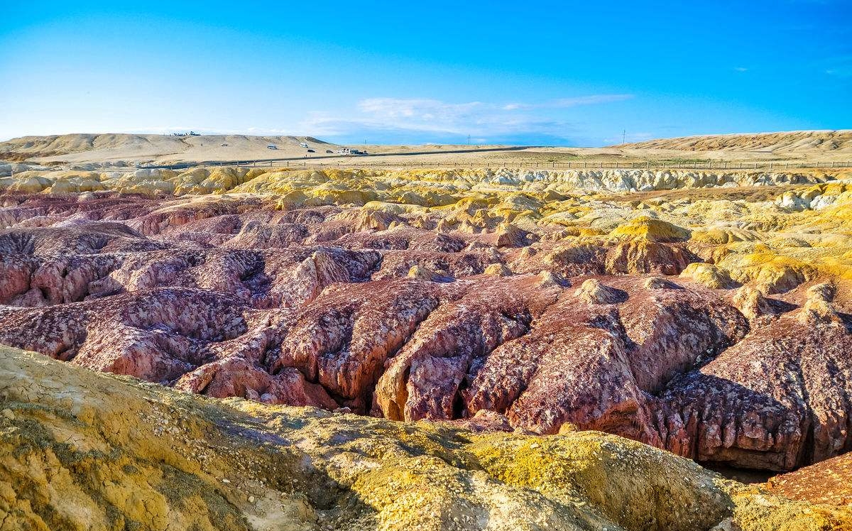五彩滩紧邻碧波荡漾的额尔齐斯河与对岸葱郁青翠的河谷风光形成了鲜明的对比。五彩滩河岸是色彩斑斓、风景独特的熔岩地貌 由紫红、浅黄和浅绿等泥岩组成,在河水和阳光下五彩缤纷,十分壮观。
