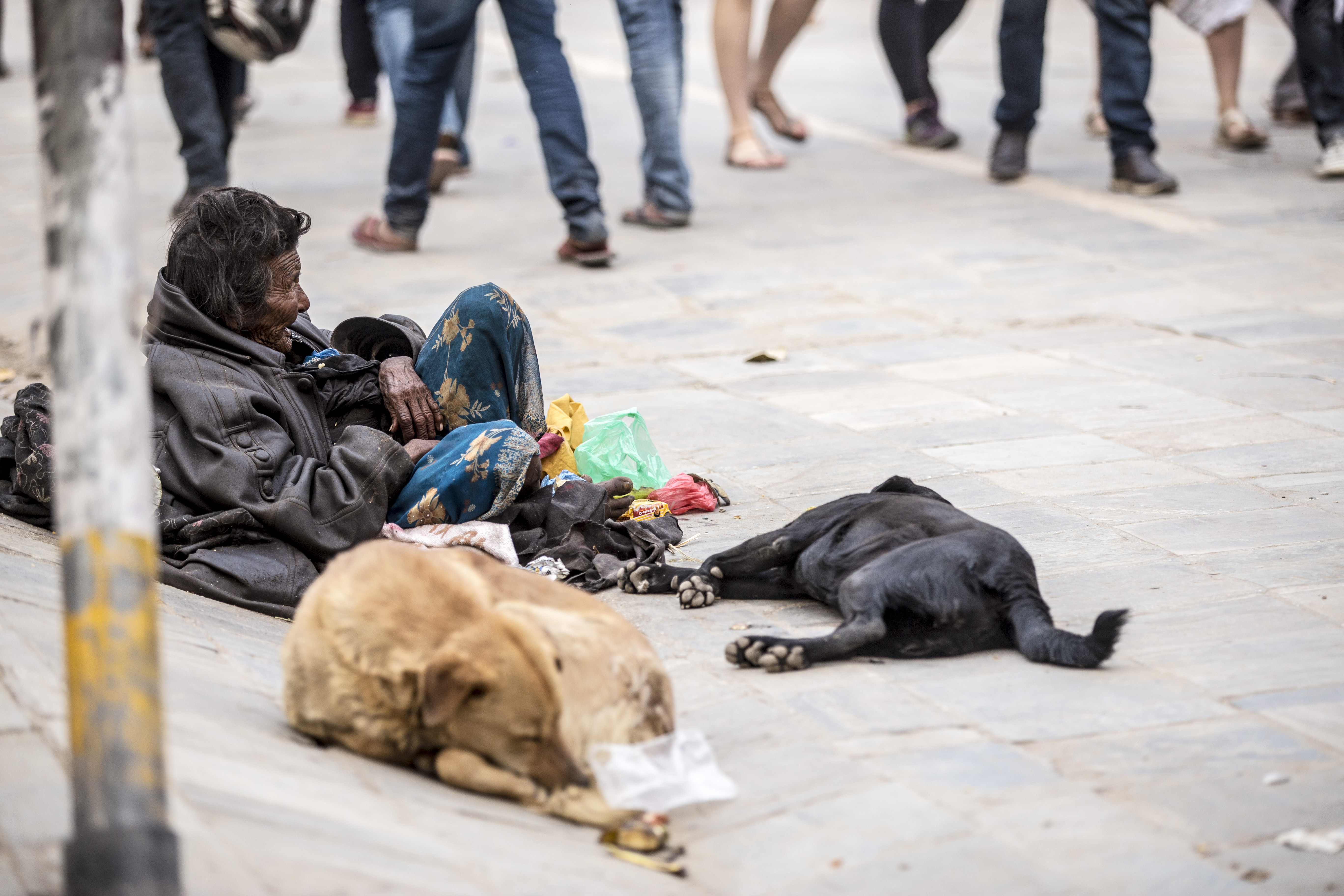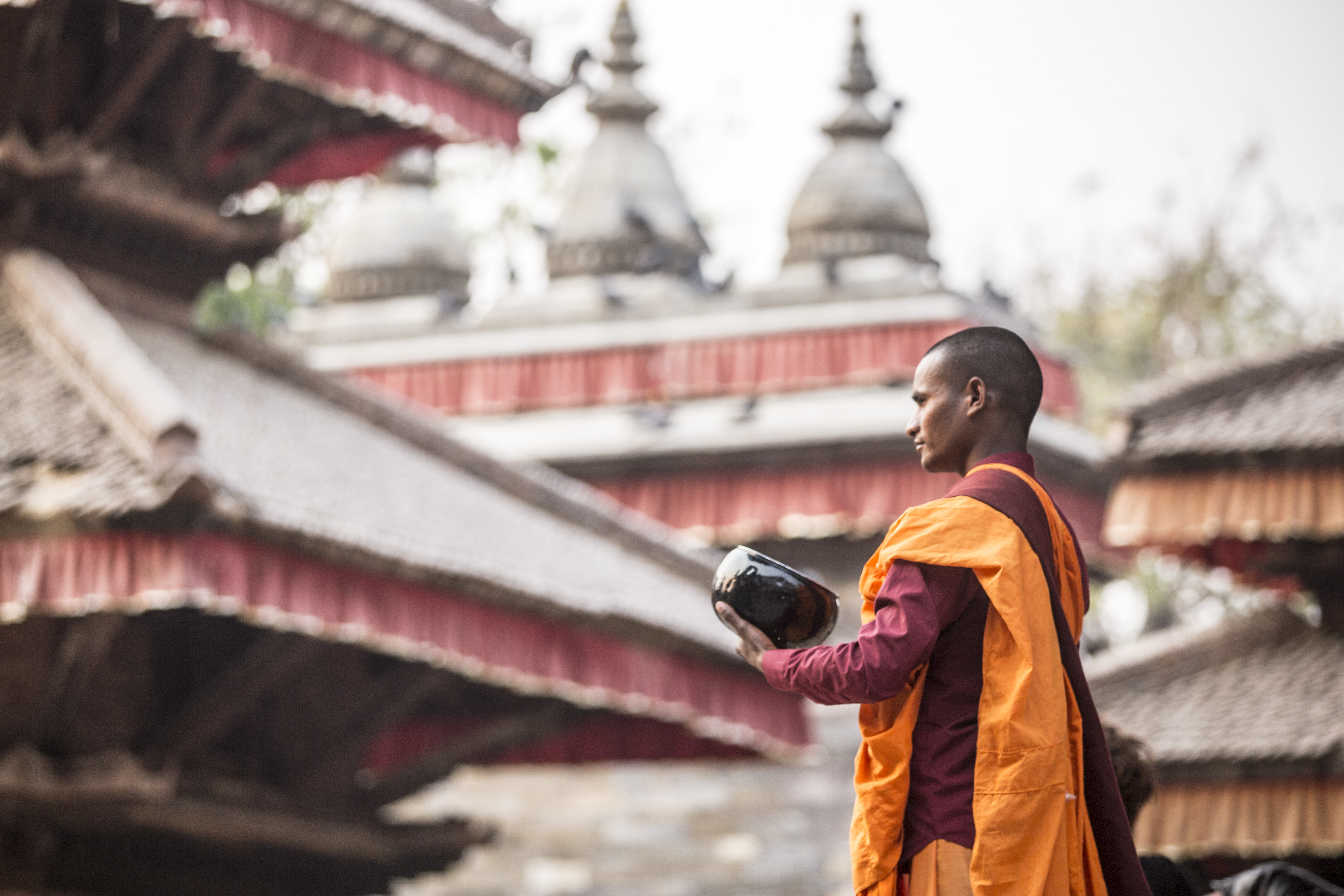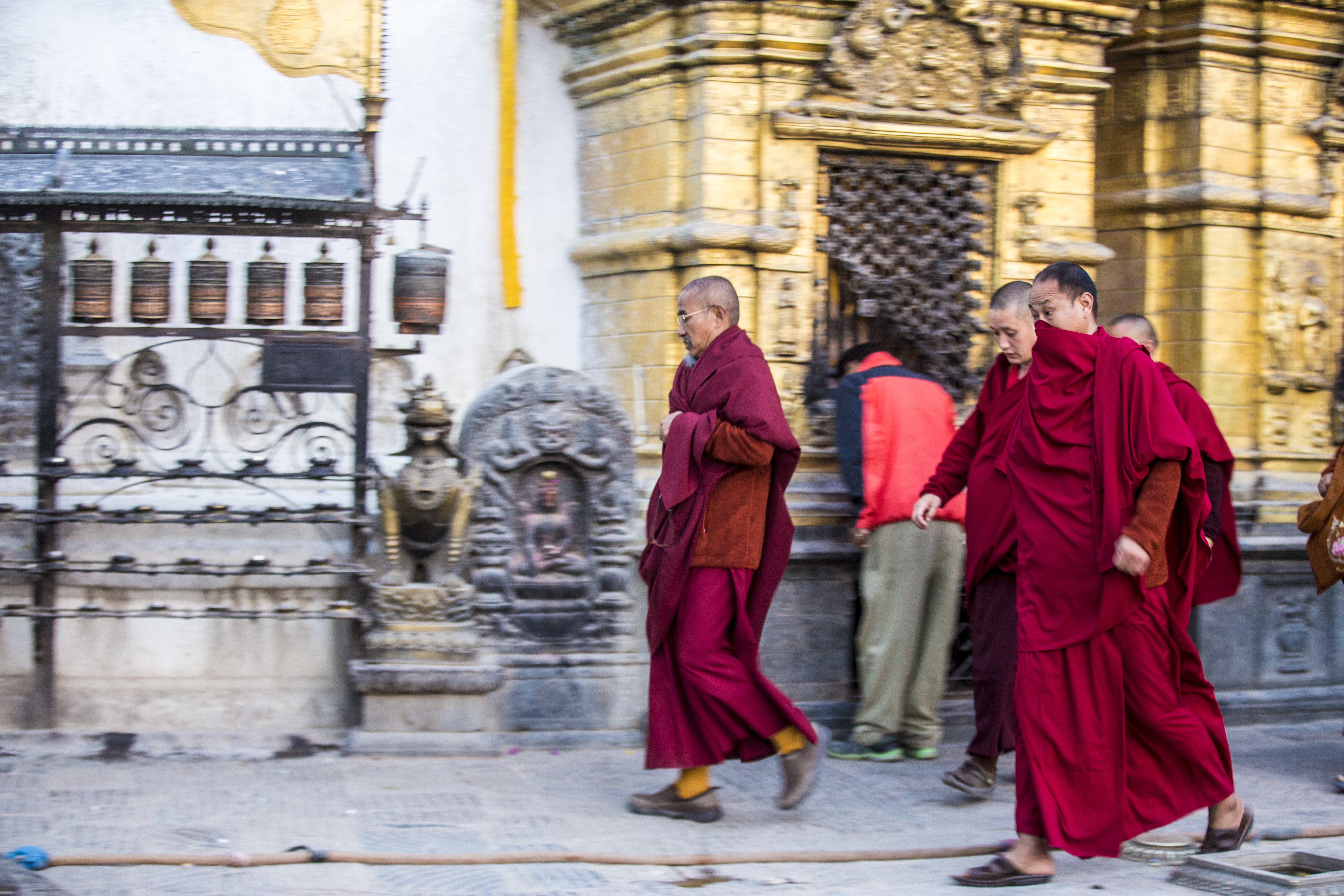 这里是一所藏传佛教的寺庙,因为地处一个小山坡的山顶,几乎可以将整个加德满都一览无遗。天还不亮,信徒们从四面八方朝这里汇聚,身着僧袍的僧人和衣着艳丽的当地妇女、还有五官突出,肤色黝黑带着三角形毡帽的男人,开始觅食的猴子、鸽子….逐渐,不大的寺庙就被挤得水泄不通,不远处是还在施工的房屋庙宇,佛教胜地变的像个混乱的菜市场,也像是浓缩的加德满都。