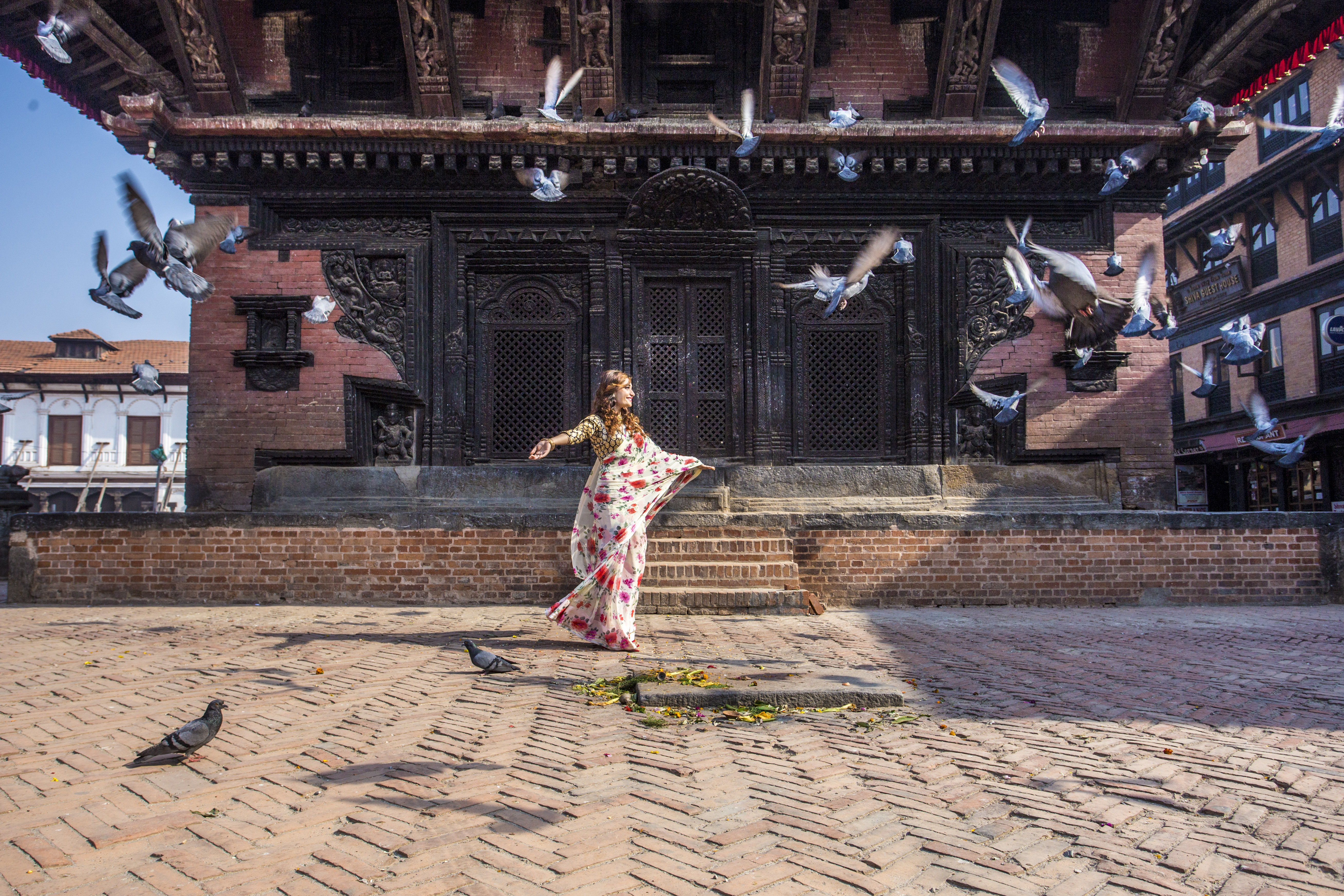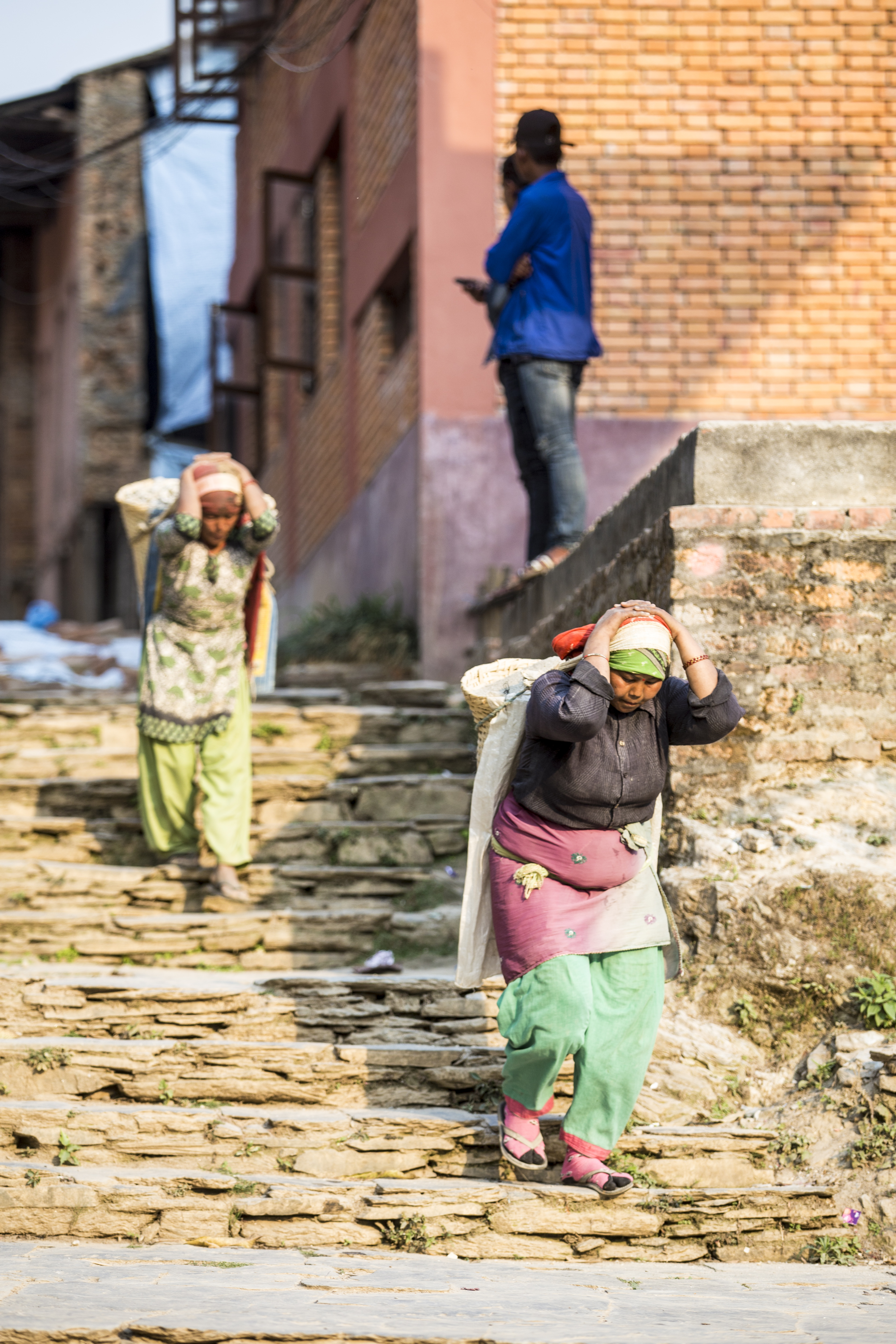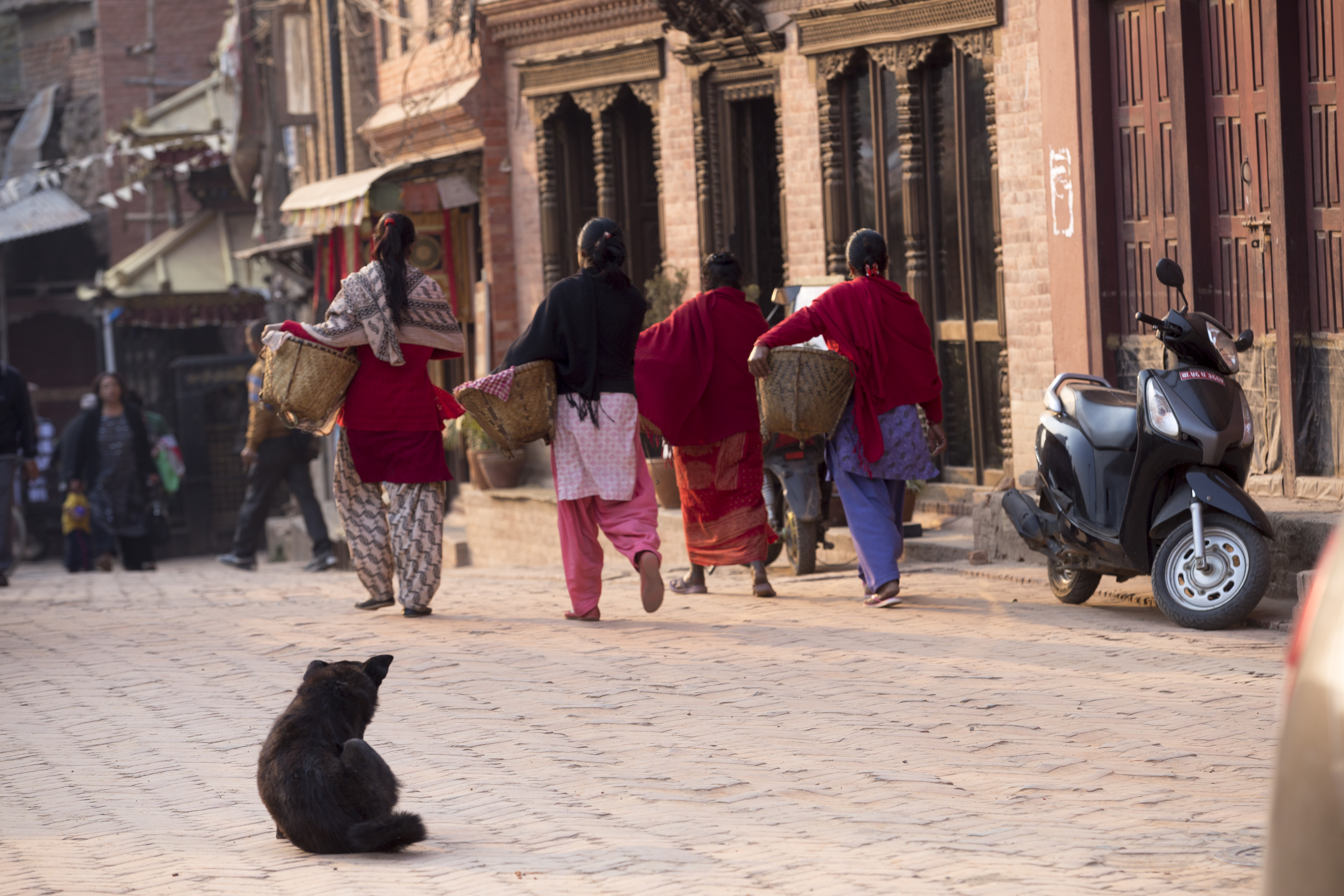 这是此次拍摄的一个重点。陶马迪广场是整个巴德岗的中心,把整个小城像一张网联系在一起,人们大多会在这里汇聚又分散。蹲守在这里会有很多惊喜的发现,广场的正中是五层塔的印度教标志性建筑,日暮时分,是这里最热闹的时候,三三两两的学生结伴穿行与广场之中,大多身着笔挺、整洁的校服让人眼前一亮,一侧是菜摊小商贩的小型市场还有坐在一旁台阶上晒太阳的人们增添了生活气息。