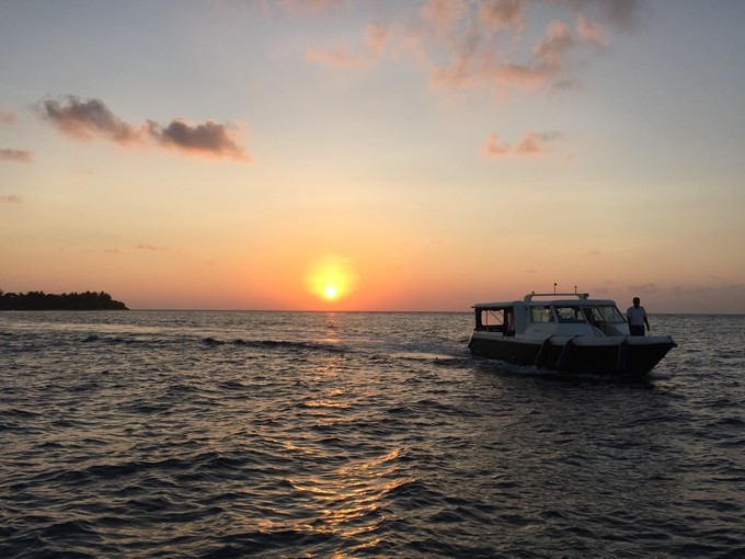 到马尔代夫已是晚上九点半,马代比北京时间晚三小时,预定的呼噜马累民宿的小哥已经举着牌子来接我们了,联系上后就坐车去了酒店,呼噜马累为新建的居民岛,据说是后备首都,沿着海滩到处都在建小酒店,除了美丽的大海,其他没什么好逛的。小酒店包早餐,因为加了张孩子床,多付25刀,酒店虽然简单,却是很干净,但是无拖鞋、无牙刷、无牙膏,毛巾黑乎乎,所幸都自带了。大清早都是建筑的声音,没睡好,看日出,这里6点才有日出。(回家前又回到呼噜马累住了一晚,在Avenue吃了一顿极好吃的海鲜牛肉炒饭,6.5刀。这位厨师估计在度假村培训过,菜的样式和味道都很好。这和别的游记里说的70元rmb的蛋炒饭来比实在良心价了,但是同样这位厨师居然给了我一顿简单早饭报价一人25刀,被我果断拒绝了,另外提醒:千万别去难吃还杀猪的中餐馆)