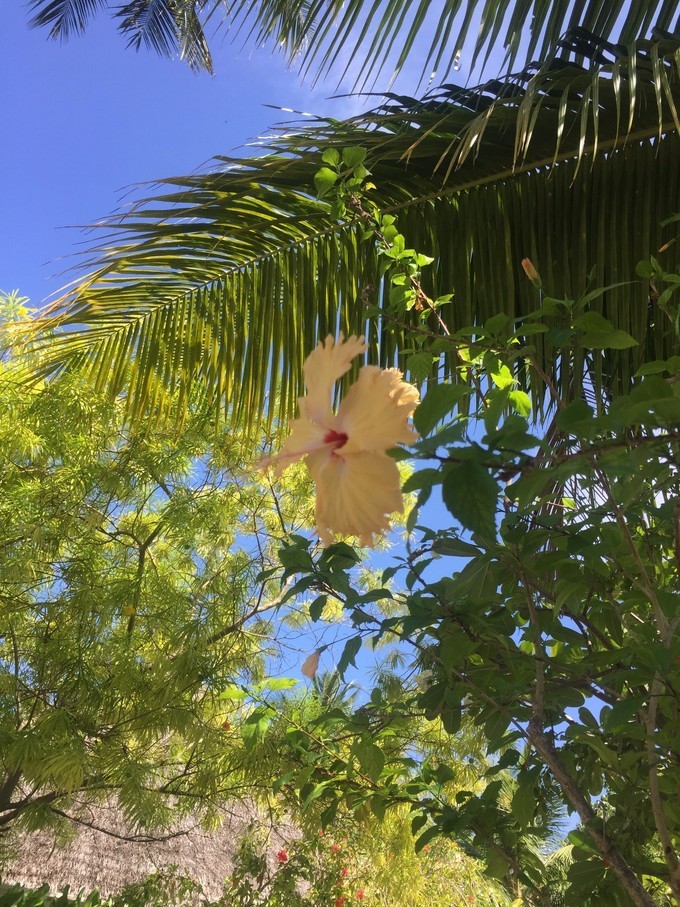 岛上有很多漂亮的花花,五颜六色的朱瑾、内黄外白特别可爱的鸡蛋花、带着小果子的文殊兰……当然椰子和香蕉也是很多。至于动物吗,苍鹭仿佛是这儿的主人,旁若无人的在沙滩上漫步;最多的是寄居蟹,夜间都爬在路上,随处可见,可爱之极;我们还很幸运的在水屋边看到小鲨鱼追逐鱼群,成千上万的沙丁鱼聚集在一起,先生忍不住又浮潜了一把。