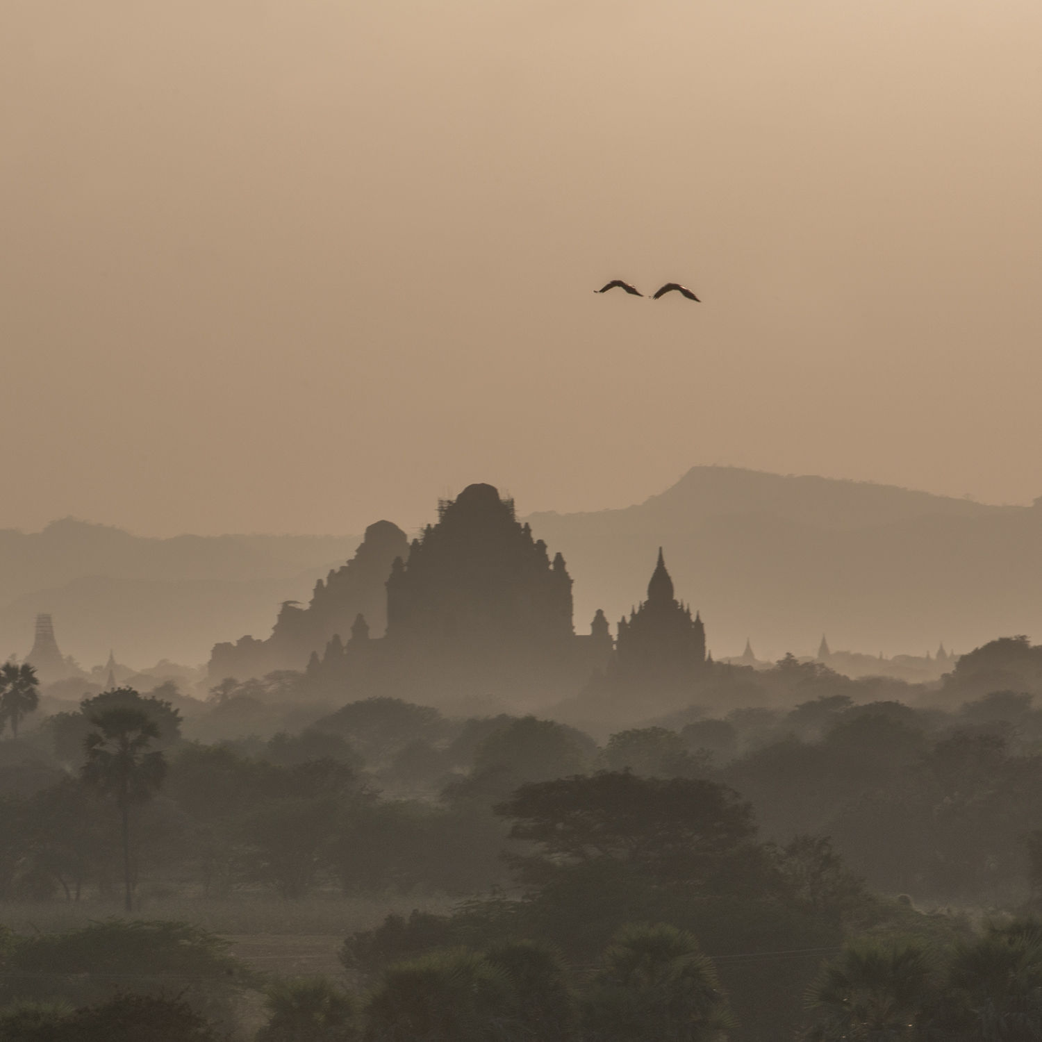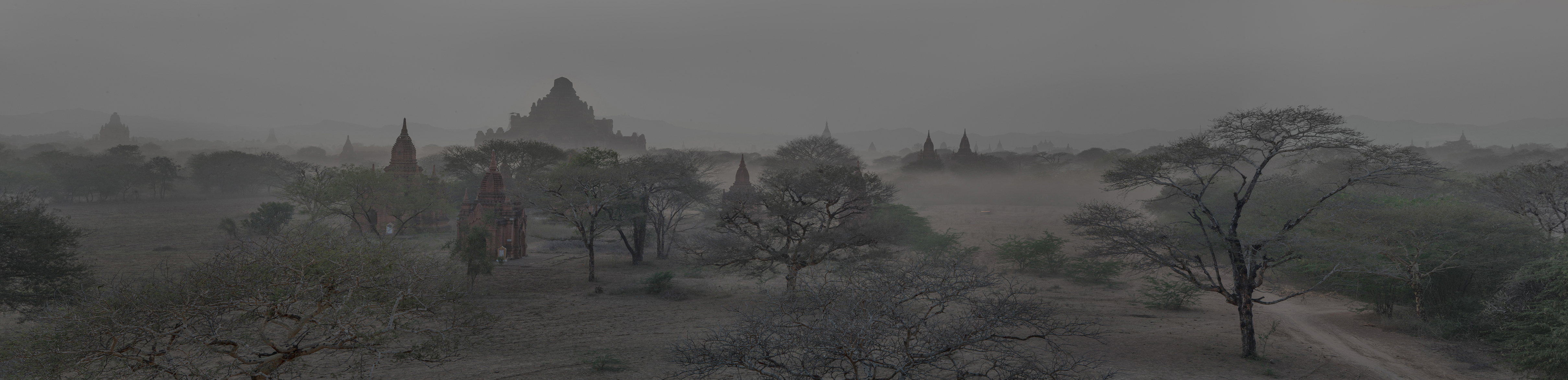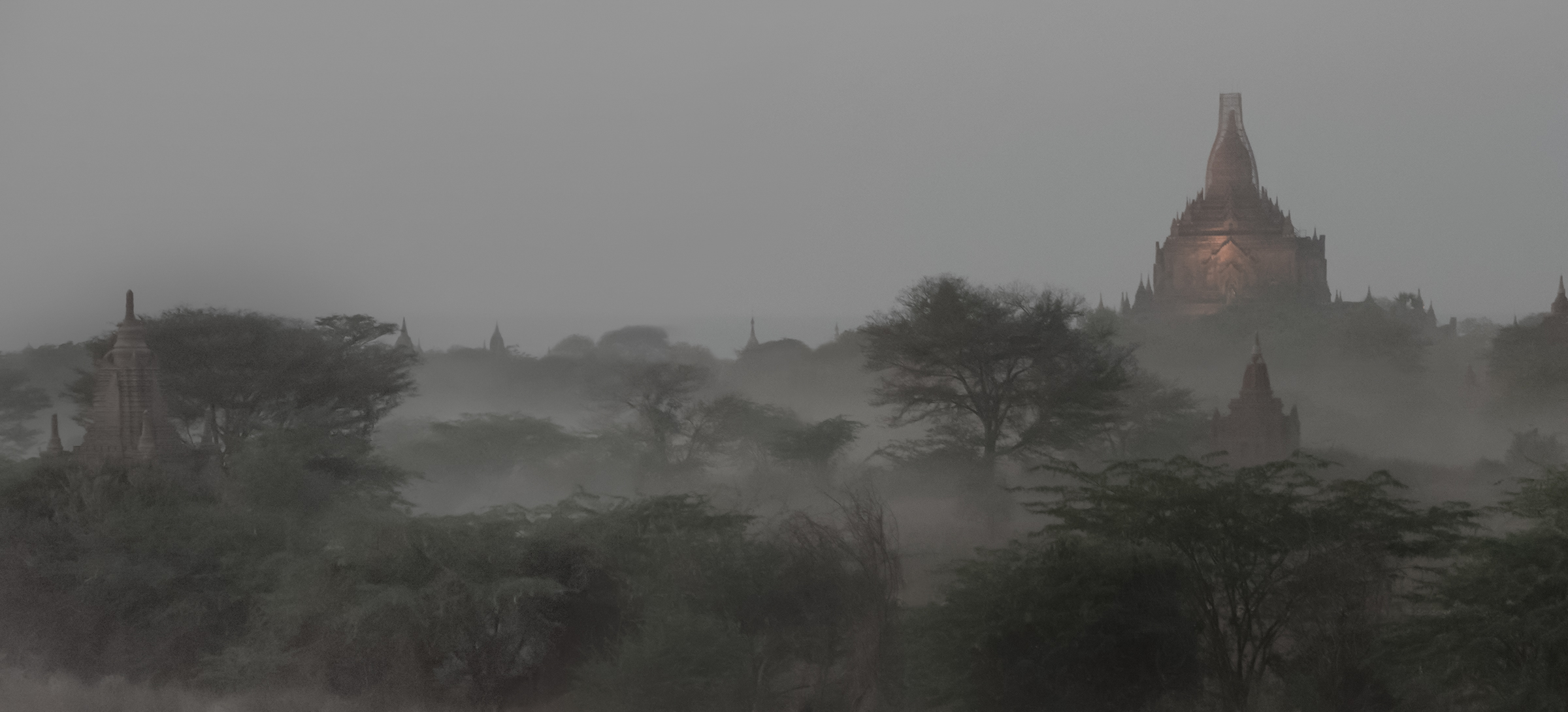 蒲甘佛塔的摄影创作,既要表现星罗棋布的众多佛塔,也要刻画有代表特征的单体佛塔;既要用广角来体现大场景,也要用长焦来提取细节质感;对我来说,日出日落时的炫丽光影固然动人,烟雨朦胧、苍烟日暮下的残垣断壁更能引人联想。
