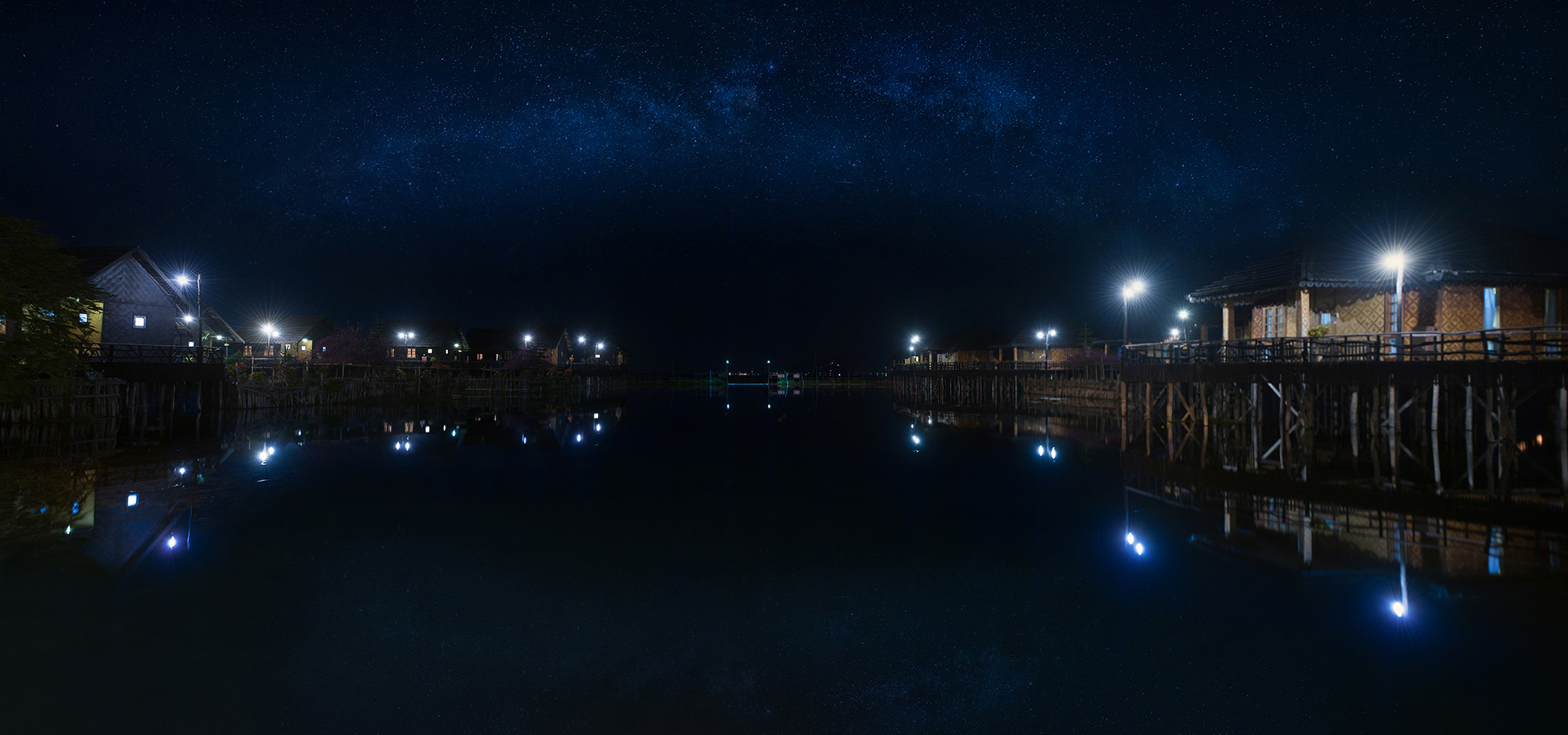 以上说没有光污染,只是相对而言,实际上酒店灯光仍然是光污染。因此,我等到夜深人静,旅客全部休息后,请酒店短暂关闭了栈桥上的灯光,待完成第一次曝光星空拍摄后,再开启灯光,第二次曝光拍摄近景的水上建筑细节。
