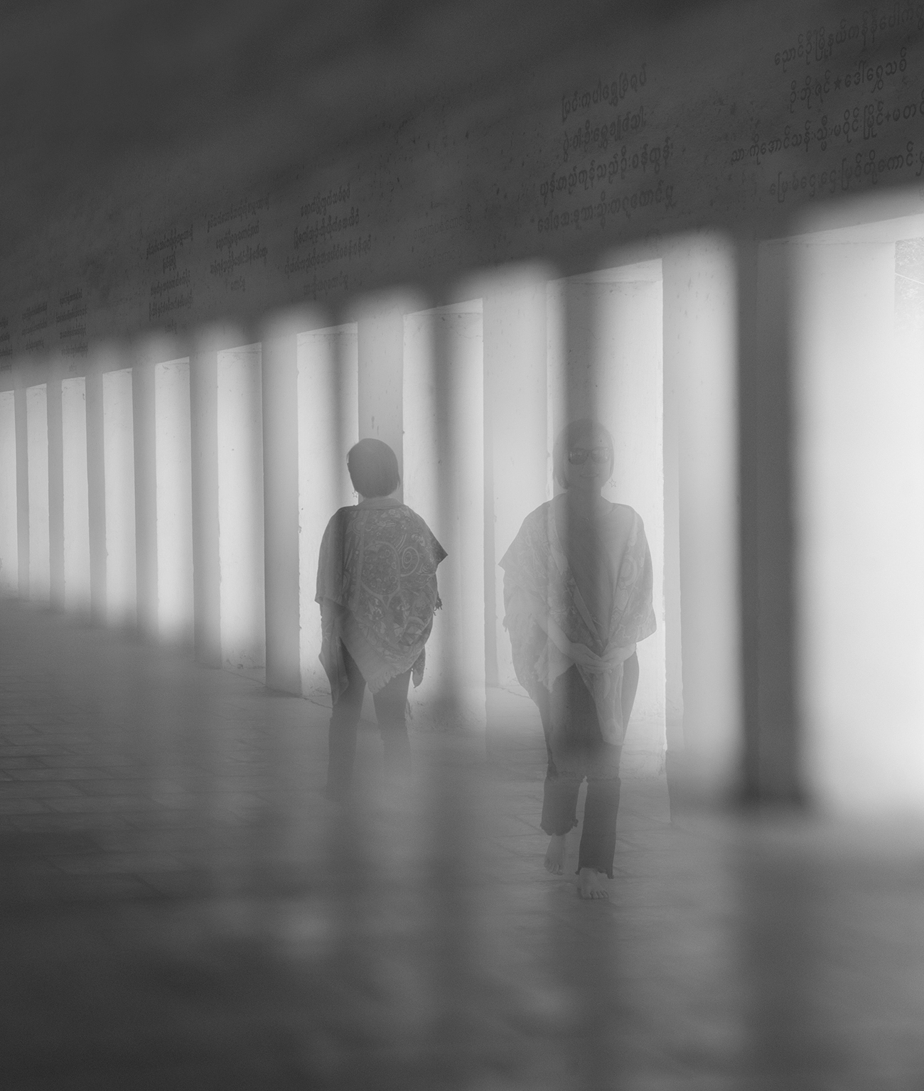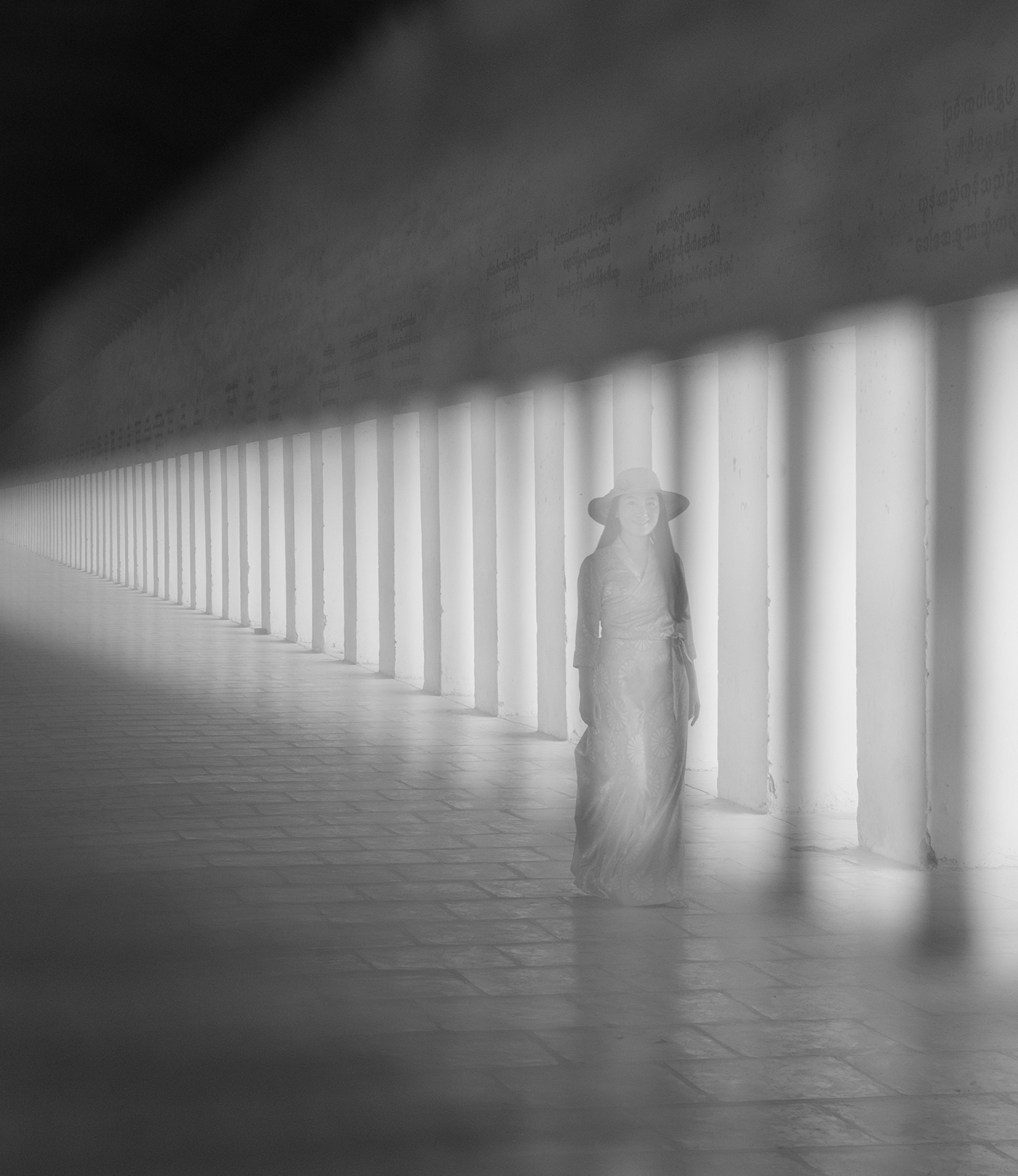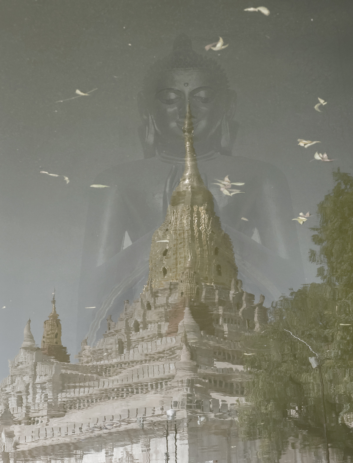 在阿南达佛塔内的创作,我提前构思好不同景物在取景器内的位置,拍摄了两张最能体现当地特征的RAW素材:水池中佛塔的倒影和大殿内佛像,在相机内进行合成。照片主题:历史的印记。