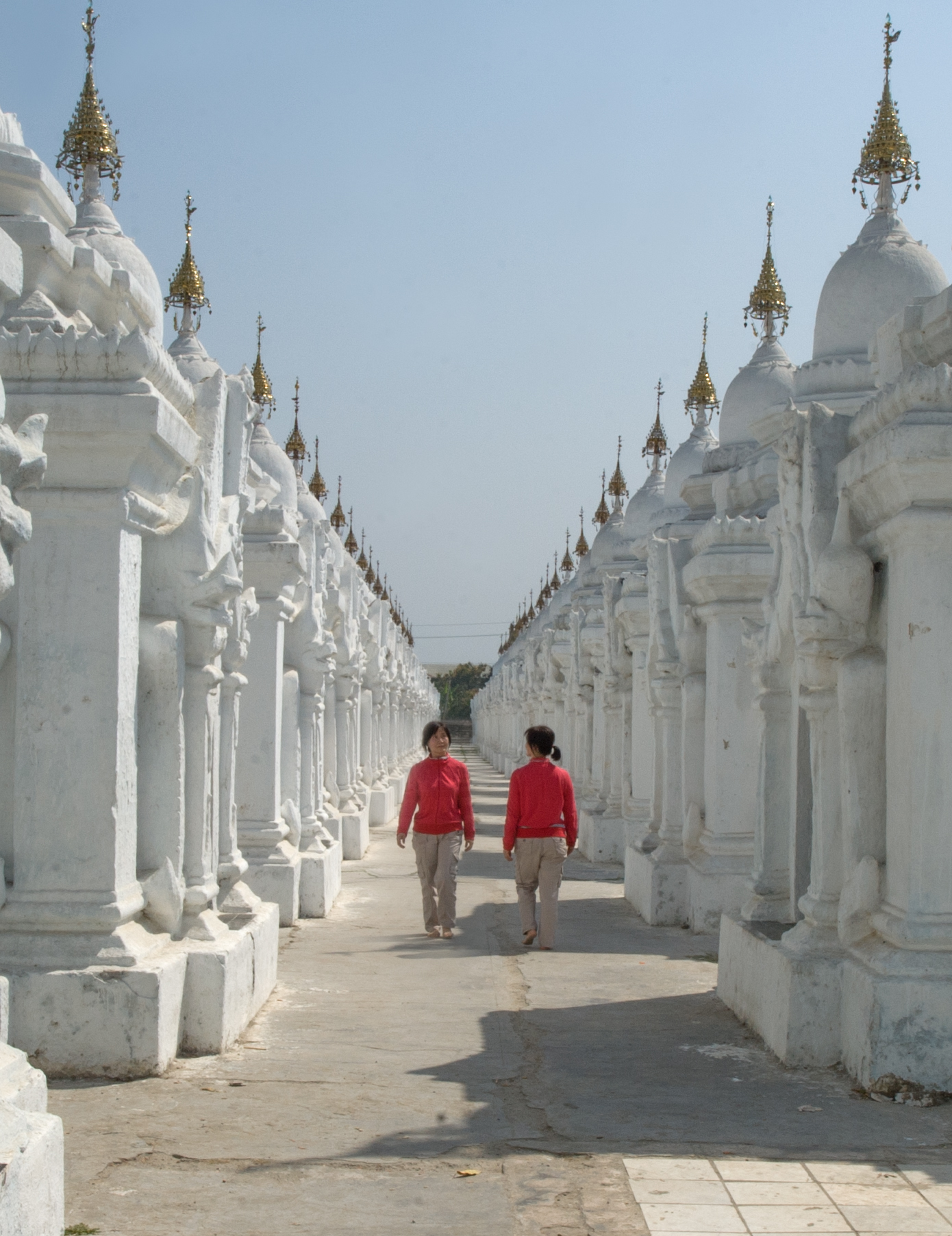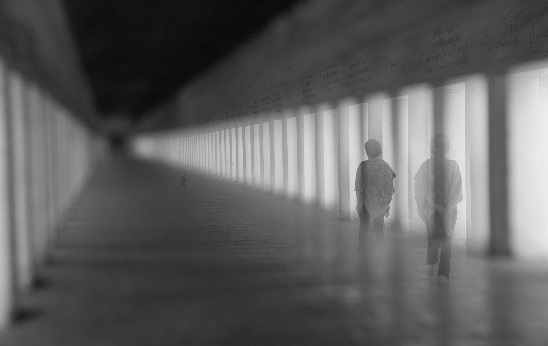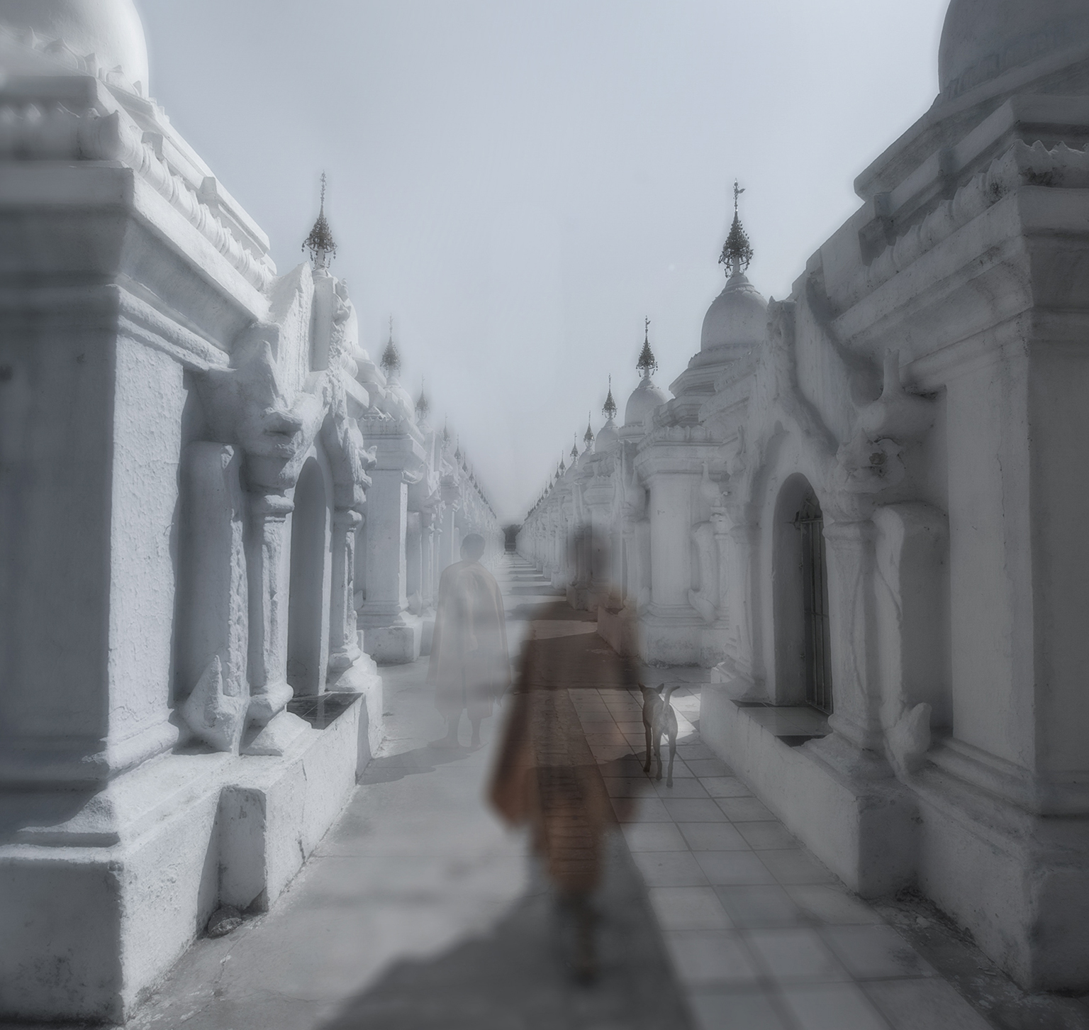 固都陶佛塔的缅文之意是:“全世界最伟大的功德佛塔”。当地人称为“世界上最大一本书”。我将拍摄主题概括为:“见证历史,沉淀沧桑”,一要表达出历史感,二要表现出沧桑感。因此,色彩上不宜过于浓艳,以灰色为主调;影调上黑白灰的过渡要自然,人影不能过于花哨,过于实在,才能体现那种若有若无的“记忆”。