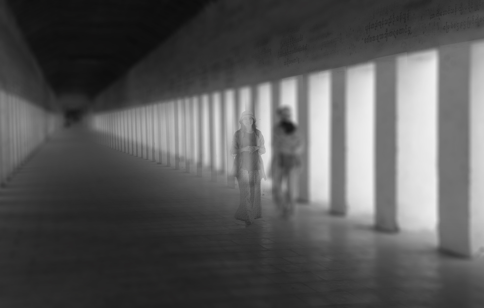 两次曝光,手动调焦,第一次曝光虚焦,设置低快门速度,使近处人影模糊;第二次实焦,设置高快门速度,使远处人影清晰。形成虚与实、大与小、远与近的对比,更好的体现时光长廊的“梦”境和历史的记忆。