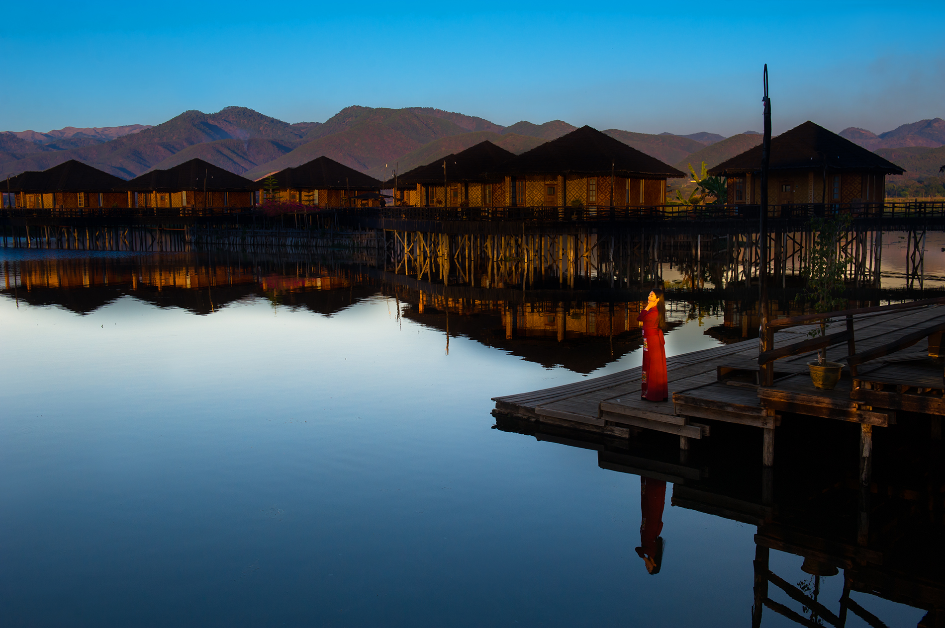 茵莱湖上单脚渔夫的人像创作,规划好不同景物在取景器内的位置,拍摄两张RAW素材,分别为渔夫水中不同姿态的倒影,在相机内进行合成。