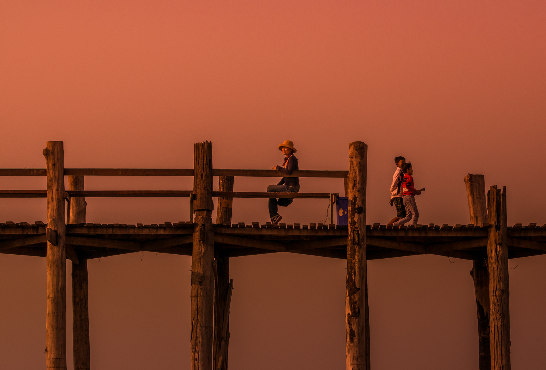 拍摄乌本桥,要看到它作为“古道”的一面,从而突出其历史感。如何表现历史感,桥的质地和颜色是一方面,如果桥上走动的人形成虚影,静止的人形成实影,有虚有实,更能突出历史和“古道”,因为实体的人,只能代表现在,而虚影的人,可以让人联想到过去,桥上人流不止,有虚有实,就使其具有了“古道苍茫,人间情味”的意蕴。我使用三角架和数片减光滤镜,拍下了这幅动静结合的照片。