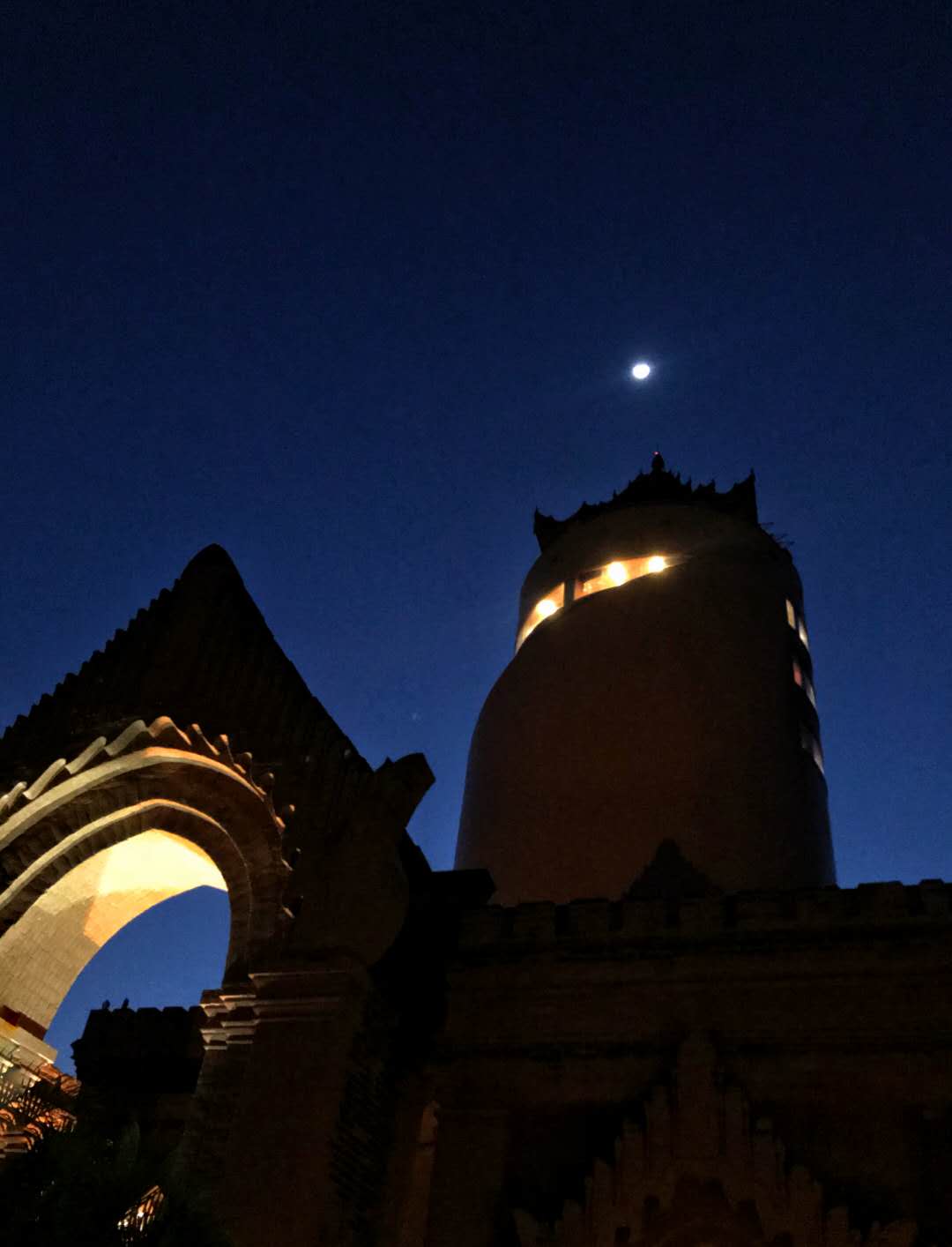 在蒲甘最高的建筑,360度观景台上拍摄日出时分天空的热气球,要注意下方场景的简洁,地面建筑在构图中并非要占较大比重,有部分佛塔出现作为代表即可,天空所占面积要大,要有相当的空余部分,才能让观众心理上具备气球向上的“升腾”感。