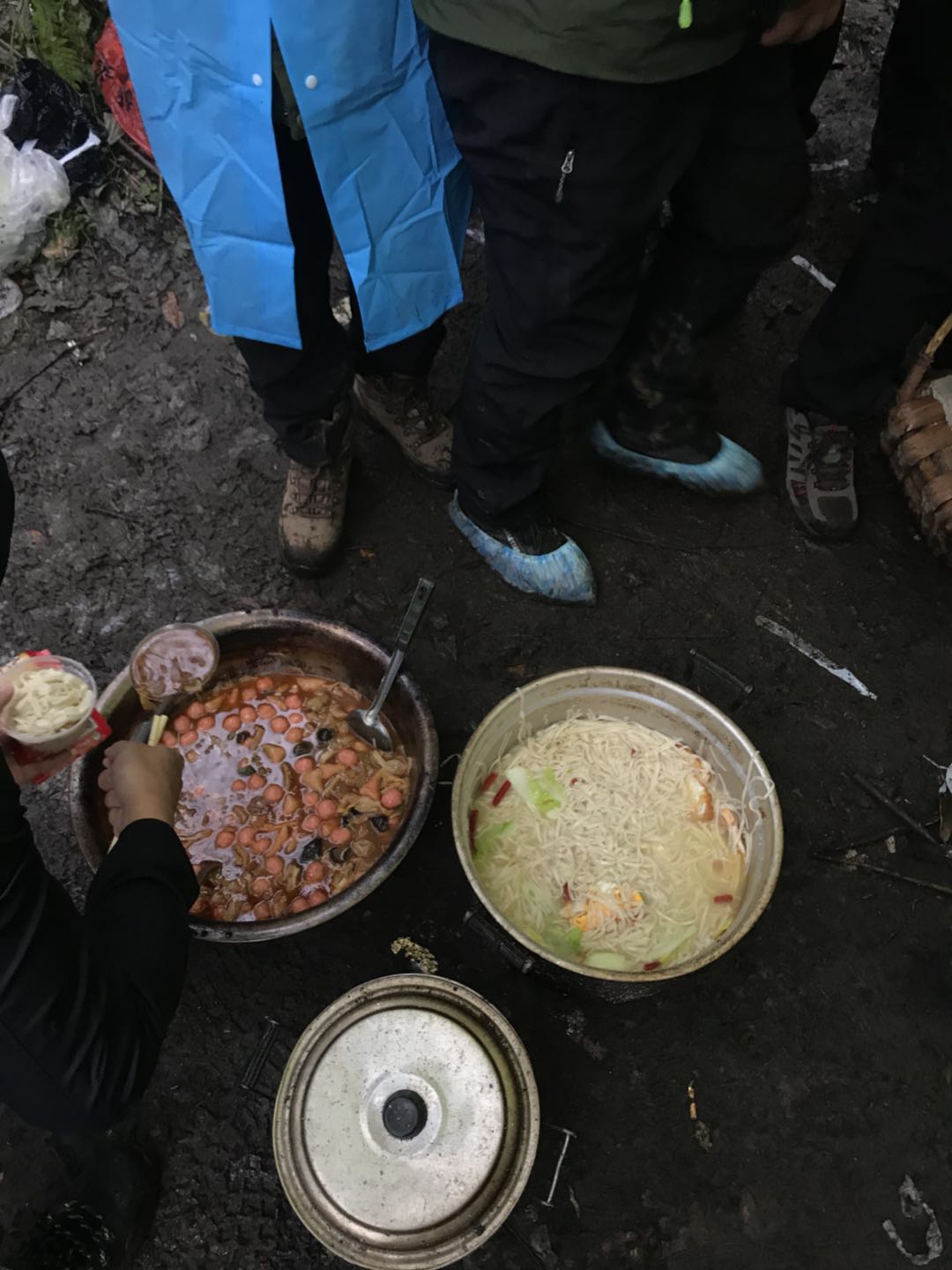 白天行走在森林中,下午4点多到达第一晚的营地,协助们早就帮我们搭起了帐篷,正在准备今晚的营地餐,一顿丰盛的户外火锅。这肯定是我吃过做好吃的一次无人区营地餐了,向导帮我们准备了有滋有味的火锅,还炒了两个小菜,再配上他们自家酿的苞谷酒,虽然夜幕降临后开始下起小雨,但是丝毫没有阻挡我们追求美食的诱惑,大家围着火锅开始了第一顿晚餐。