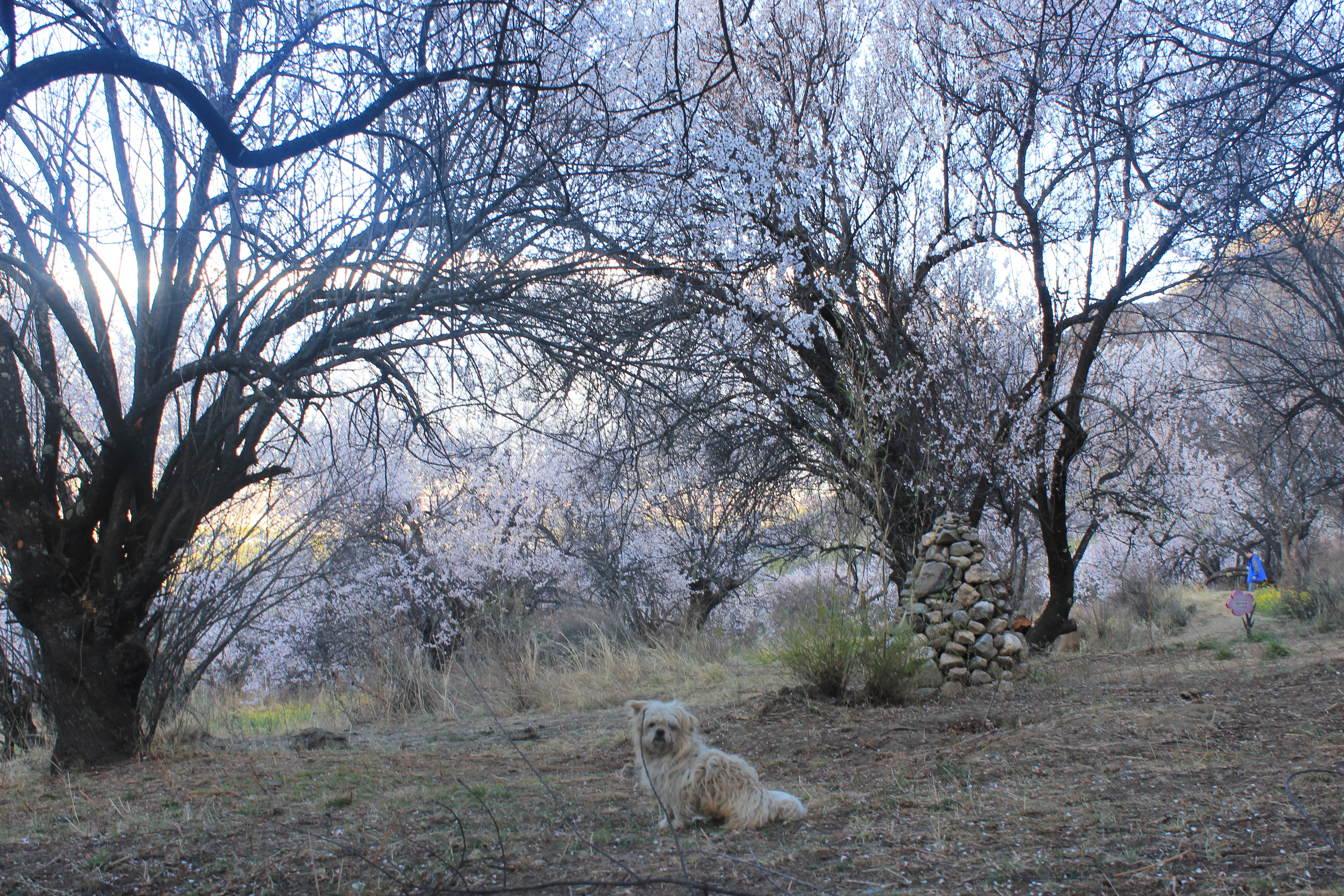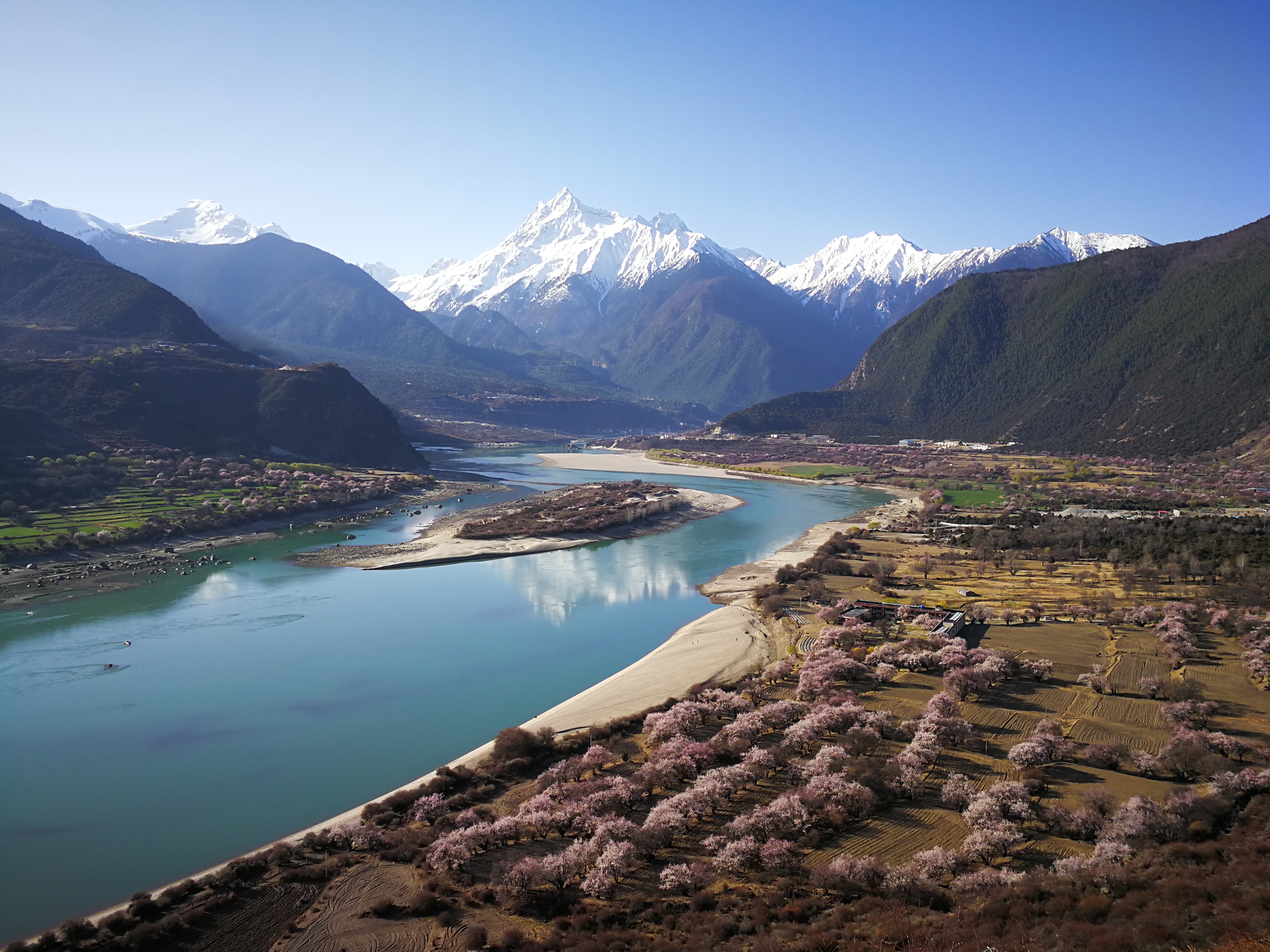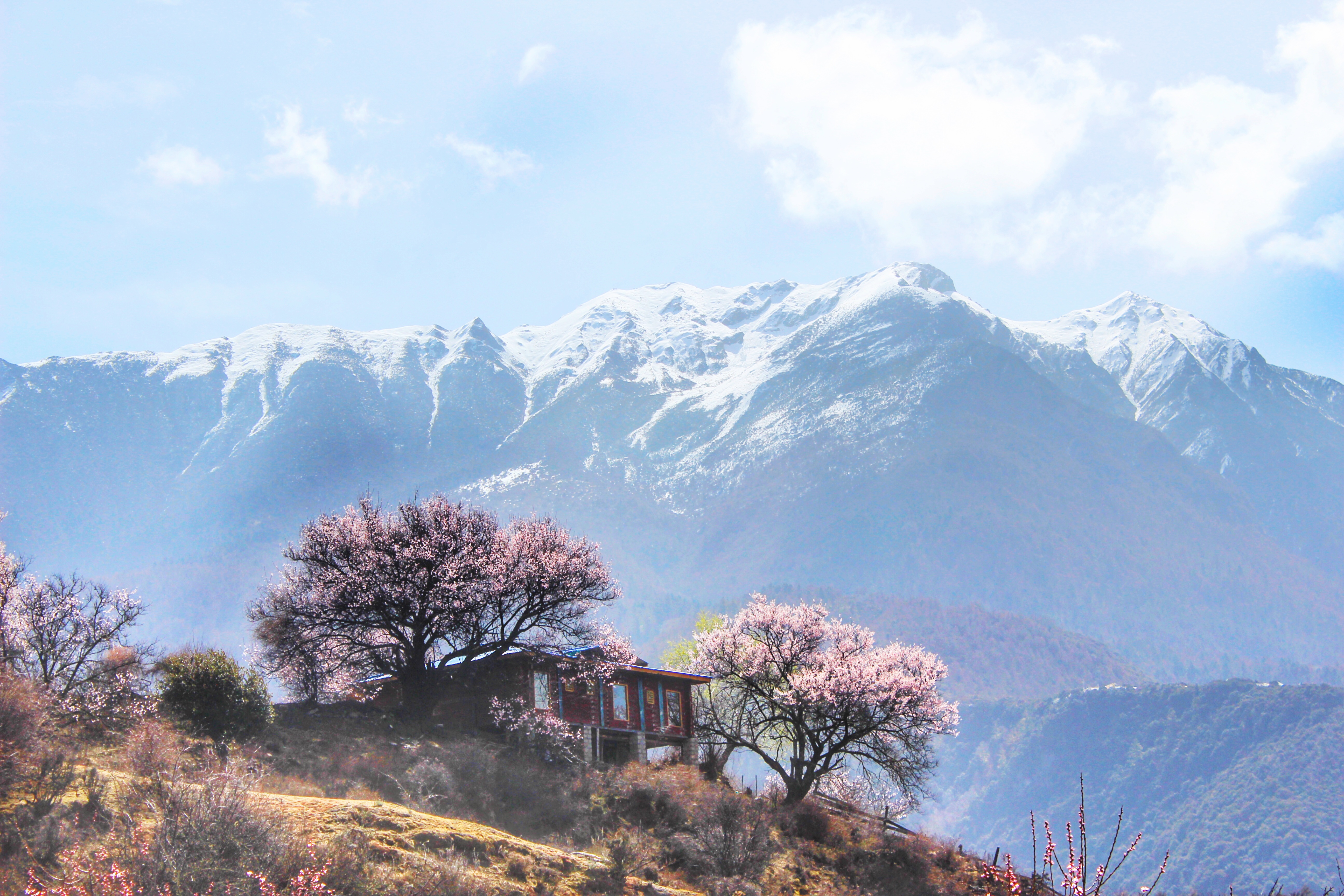 这里平均海拔三千米左右,远望是千古不化的雪山冰川,近处确是百里盛放的野生桃林