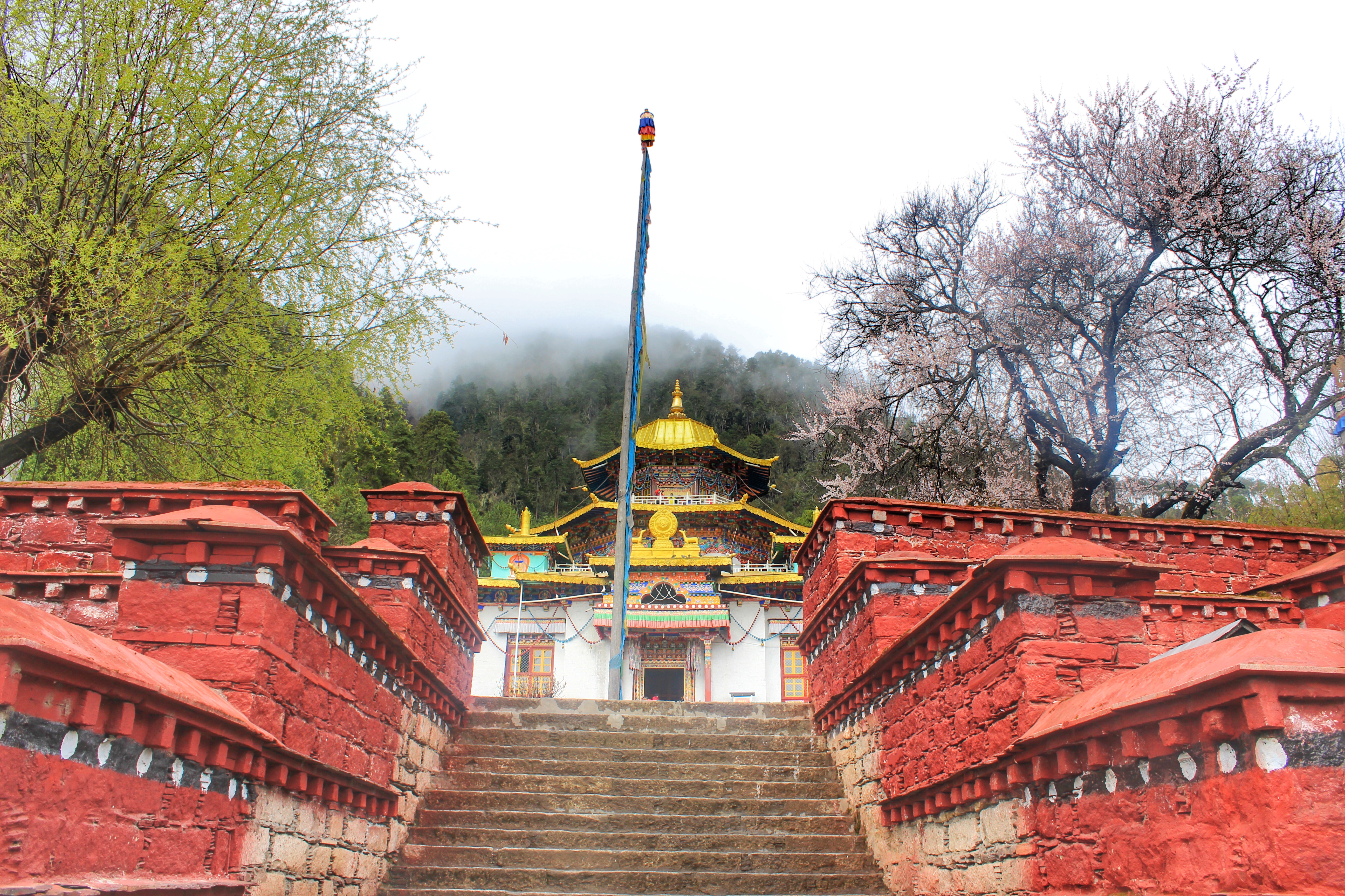 喇嘛岭寺位于林芝地区八一镇东南三十公里处的306省道旁。该寺院又称桑多白日寺,意为"铜色吉祥山"或"铜顶莲花圣寺"。,寺院形状呈正四角,外底层屋檐共有二十角,第二到第三层屋檐为八角,佛殿高二十多米,内径十余米,上覆金顶,呈塔形,四面墙体分以白蓝红绿四色涂之,犹如镶嵌在青山绿水中的一颗宝石。寺庙主供宁玛派创始人莲花生大师塑像,经堂供释迦牟尼塑像。寺内还有莲花生的践石遗迹,寺内精美的壁画也堪称藏东一绝。