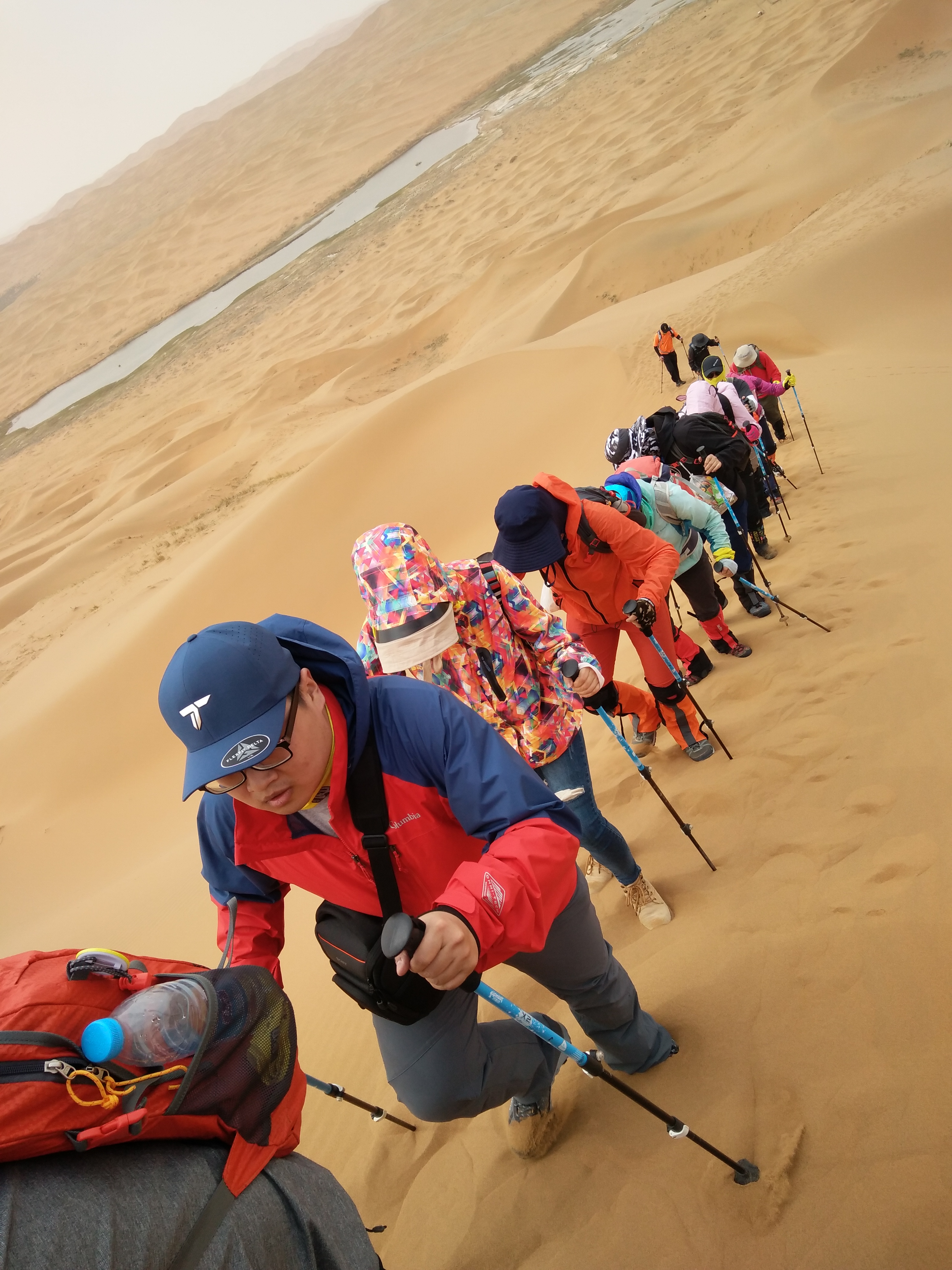 小雨淅淅沥沥下了一整天,也为我们的20公里徒步减少了不小的难度。天气凉爽不说,被雨浸过的沙山比平日里坚硬了几分,走起来轻松了不少。