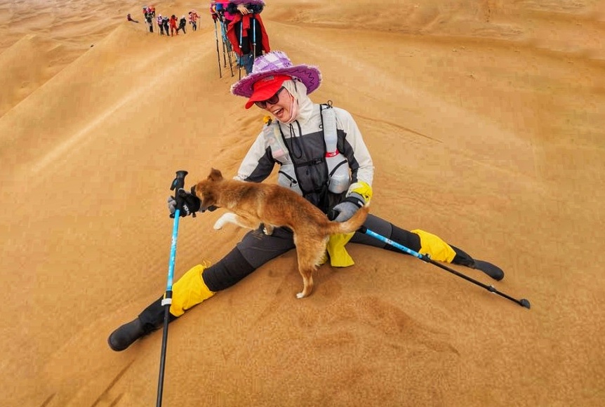 腾格里沙漠徒步第一天,目标是八公里,是预热也是在为第二天的徒步打基础,看大家元气满满我也是信心十足了。一进沙漠大家一个个都变成了蒙面大侠,头戴遮阳帽,手执登山杖,脚踩徒步靴,妥妥的一个十面埋伏,就只差导演一句Action了。刚开始大家都走的很辛苦,都在行进过程中寻找最适合自己的节奏和方式。吉祥领队也给大家讲解沙漠徒步的正确打开方式。行进过程中最意外的收获想必就是大黄了,它的出现为我们的行程增添了不少乐趣。沙漠仿佛是大黄的一方乐土,它在这里上蹿下跳,体力好到不知道让多少人羡慕。
