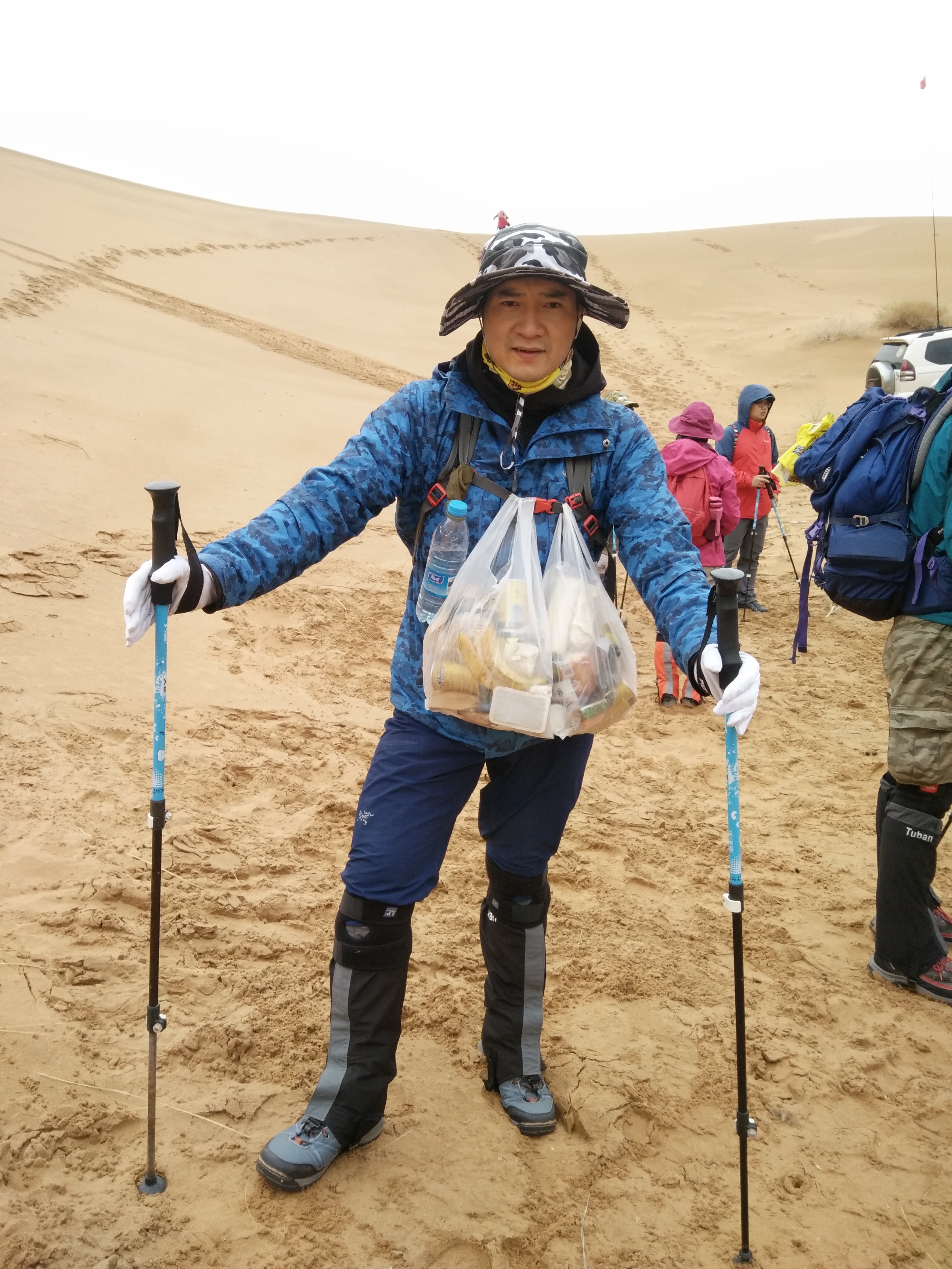 他几乎承包了大部分团友的垃圾,身前的两个袋子从来没有空过。
