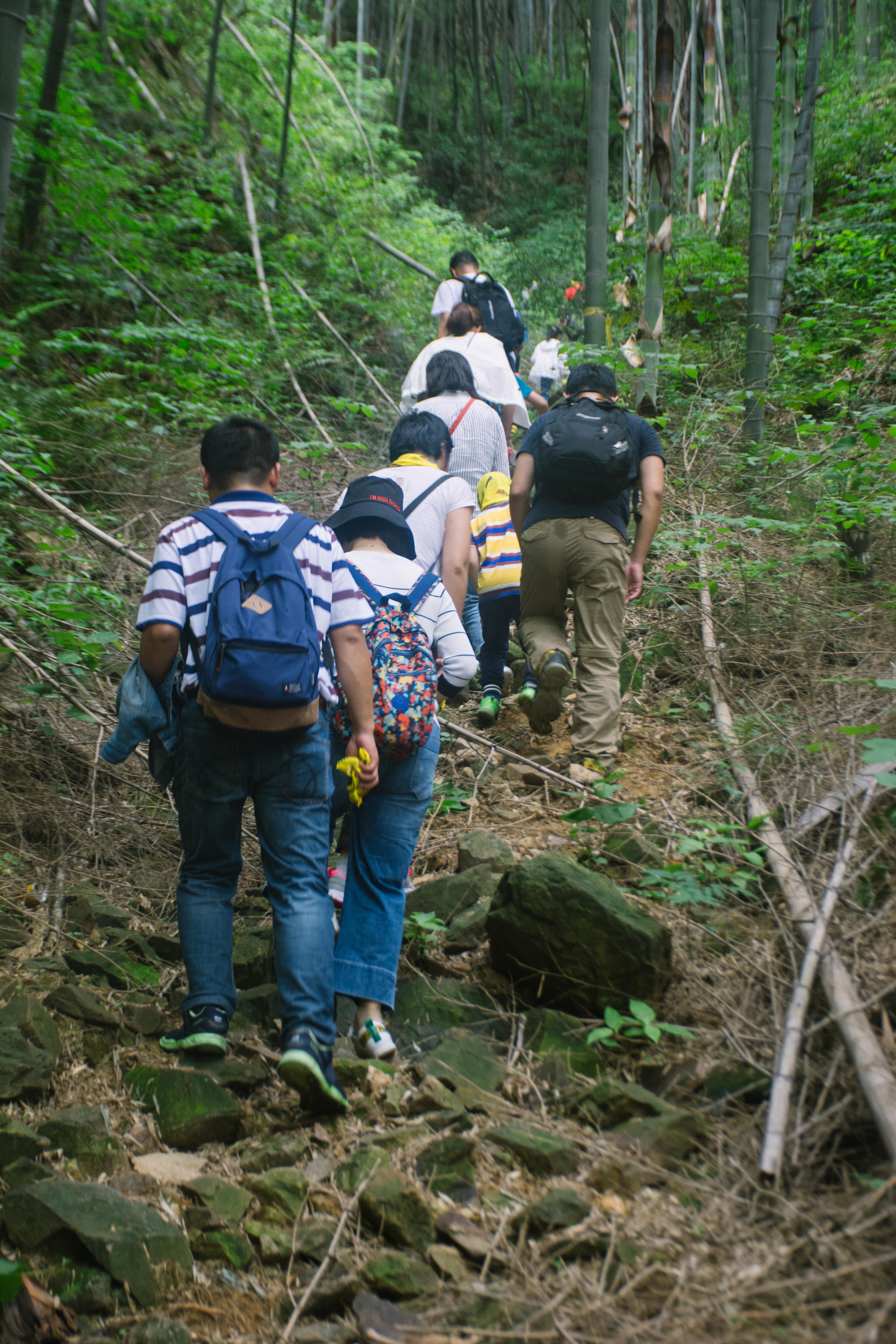 小朋友们一个比一个棒,都在队伍的前面领着大人们爬山,遇到水沟大人们把小朋友抱着过,路上小朋友们自己也会相互帮忙手牵手~画面都很有爱!