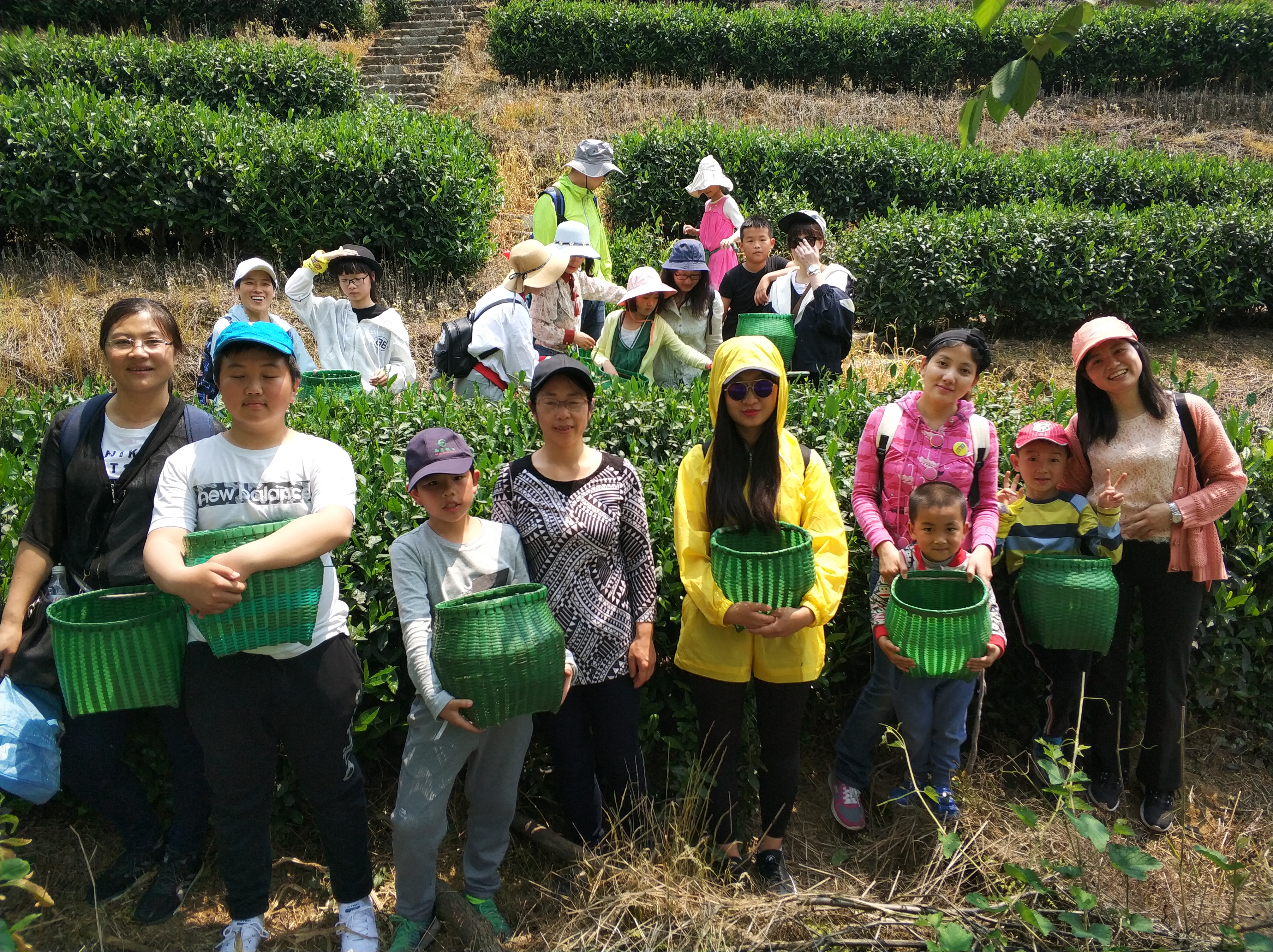 来到采茶农庄,大家分成三组,拿好采茶框,来到茶园,体验茶农采茶的辛苦。